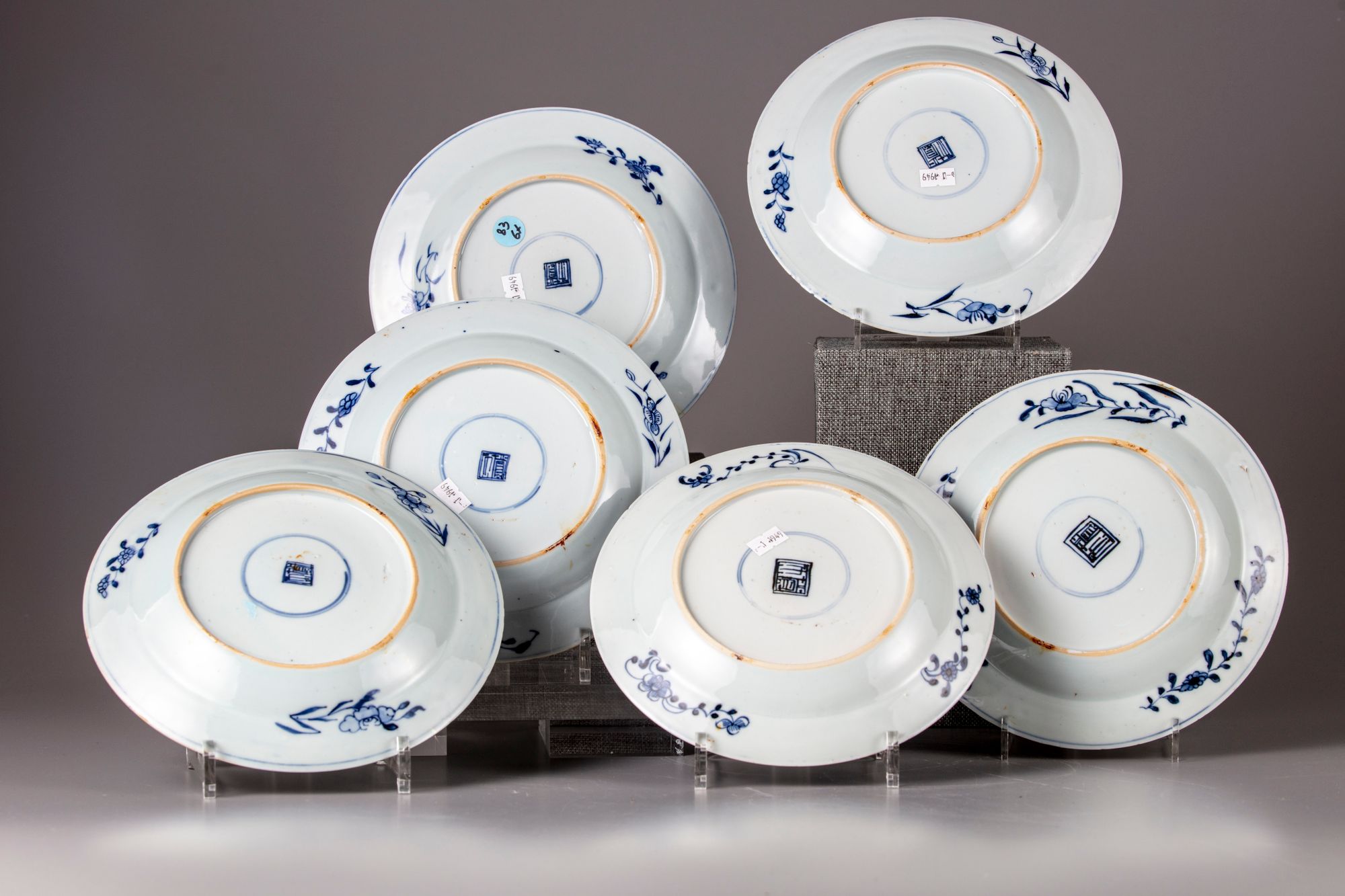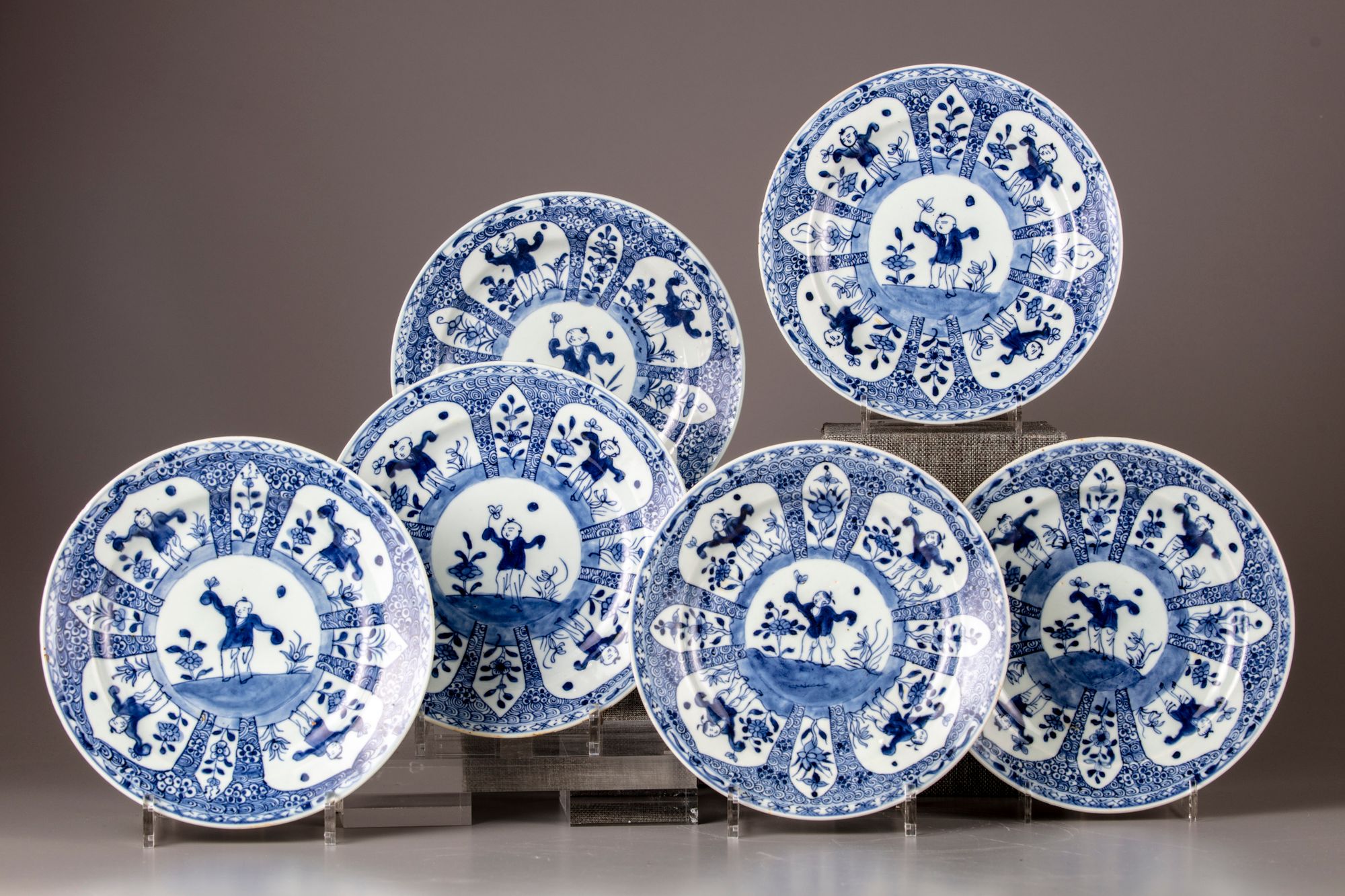 Each dish is decorated with a central panel enclosing a boy holding a flower spray, surrounded by petal-shaped panels enclosing alternating boys and flowers, all reserved on a spiral ground. Each rim is decorated with a diaper band interspersed with floral cartouches. Each base with a chop mark in underglaze blue.