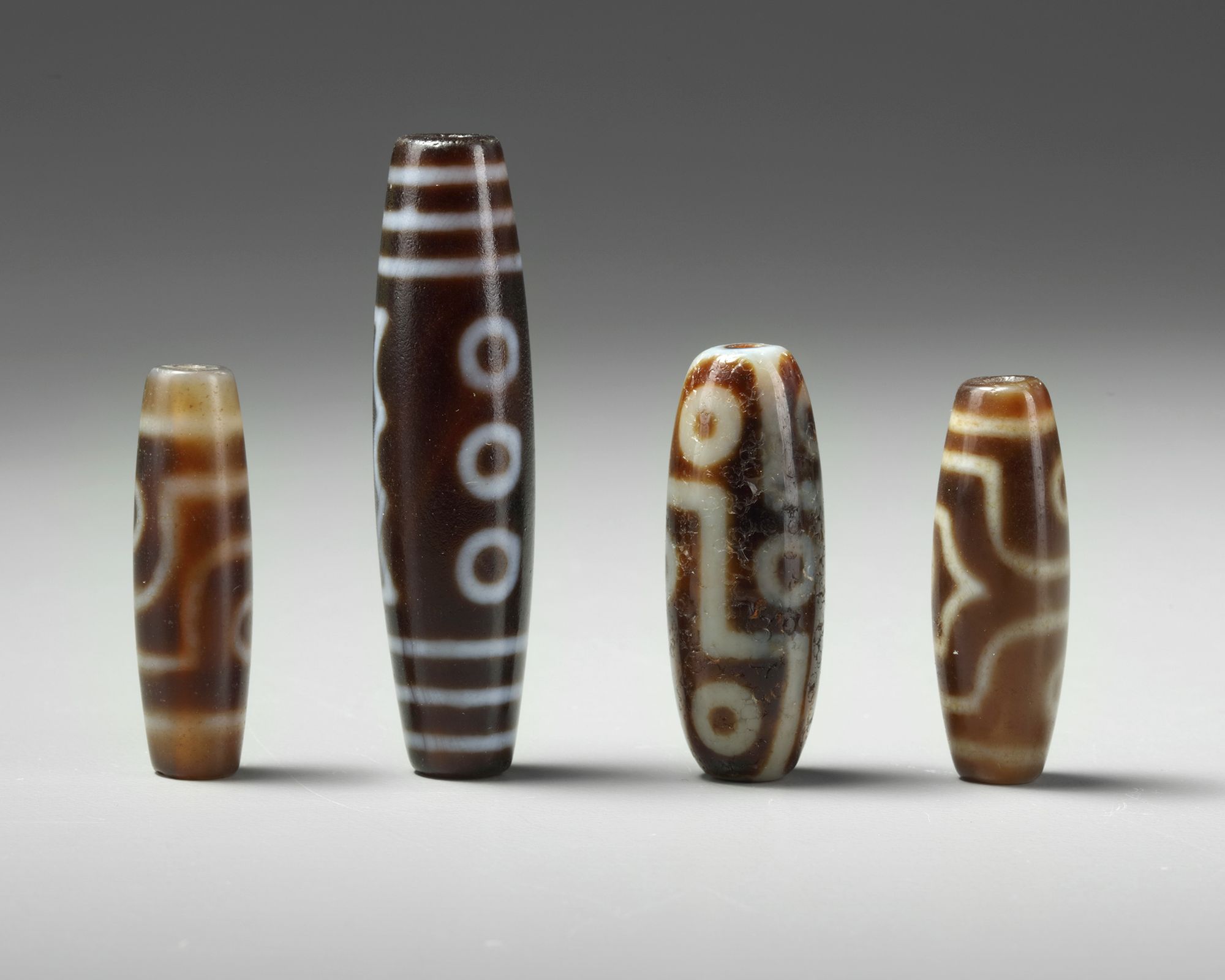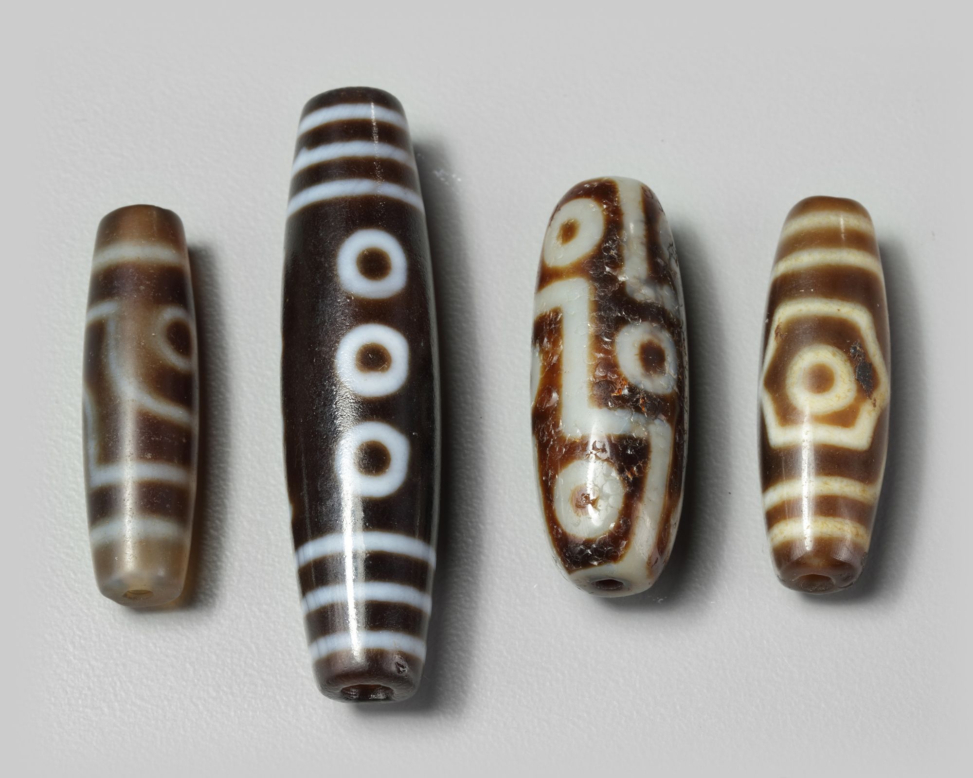 The group comprises four various dzi beads bearing various designs.