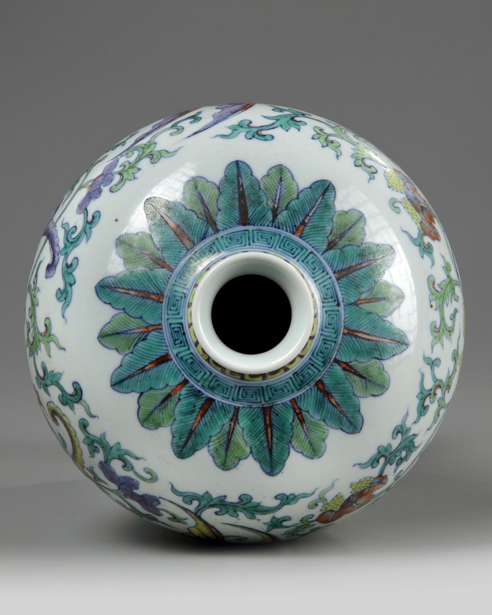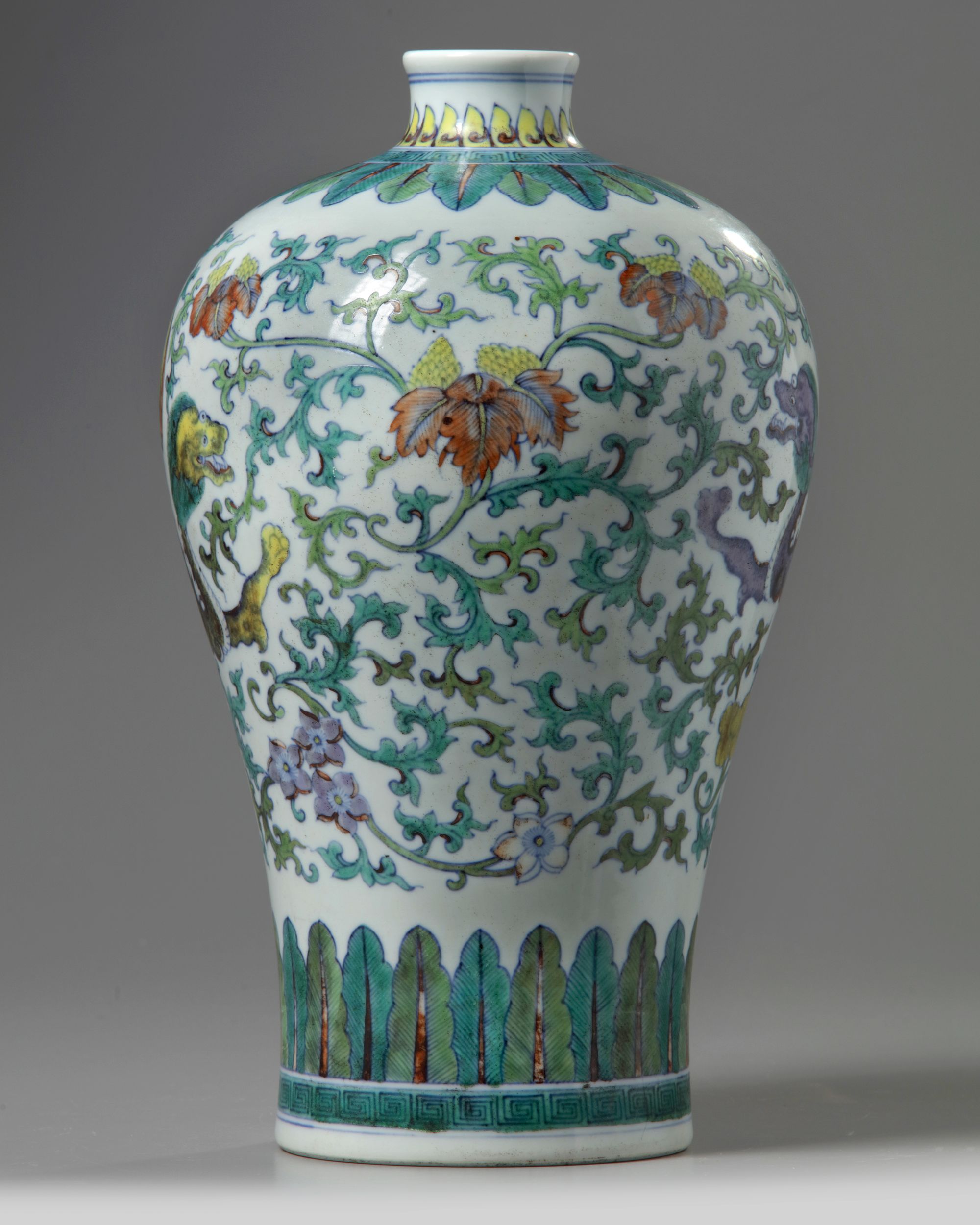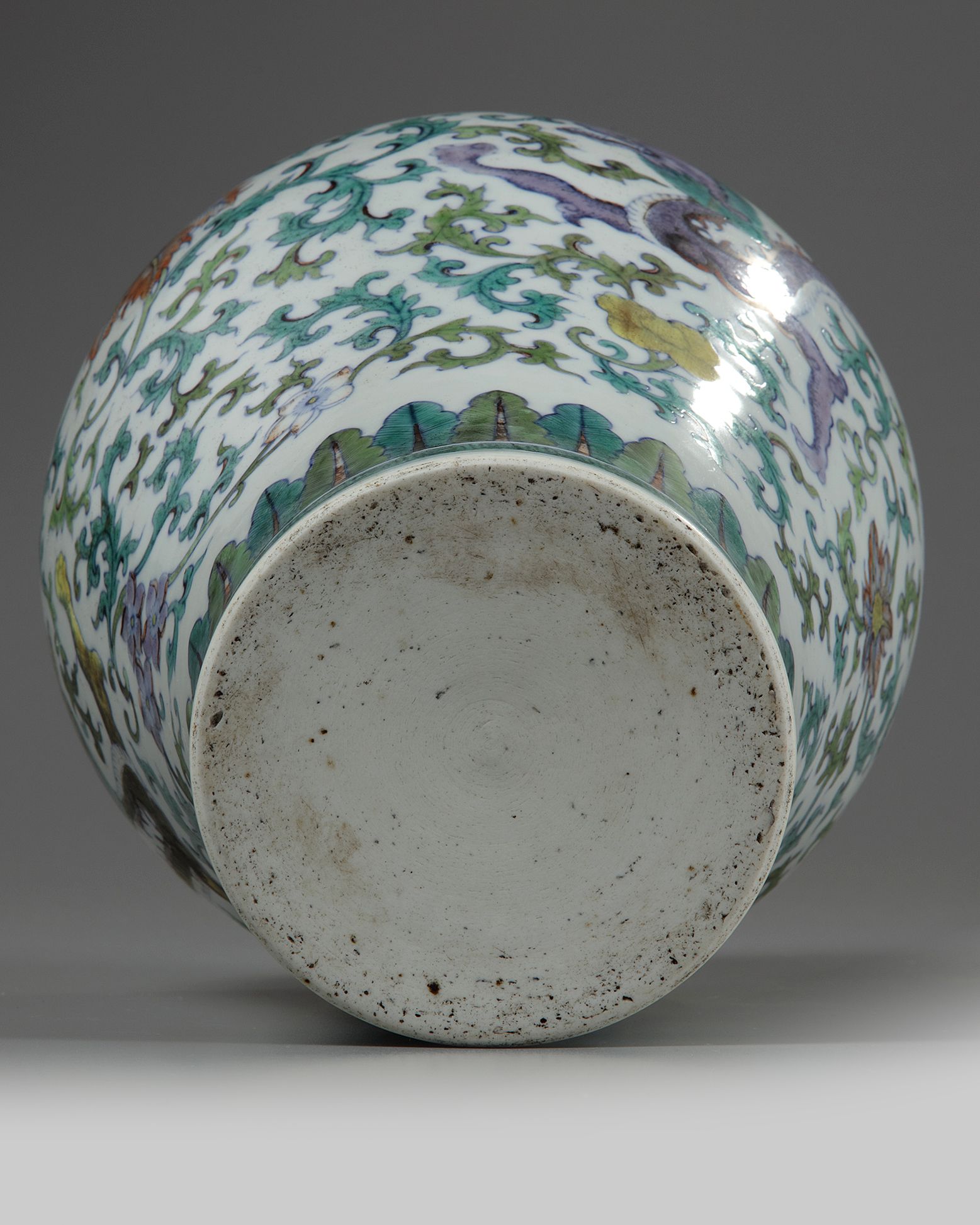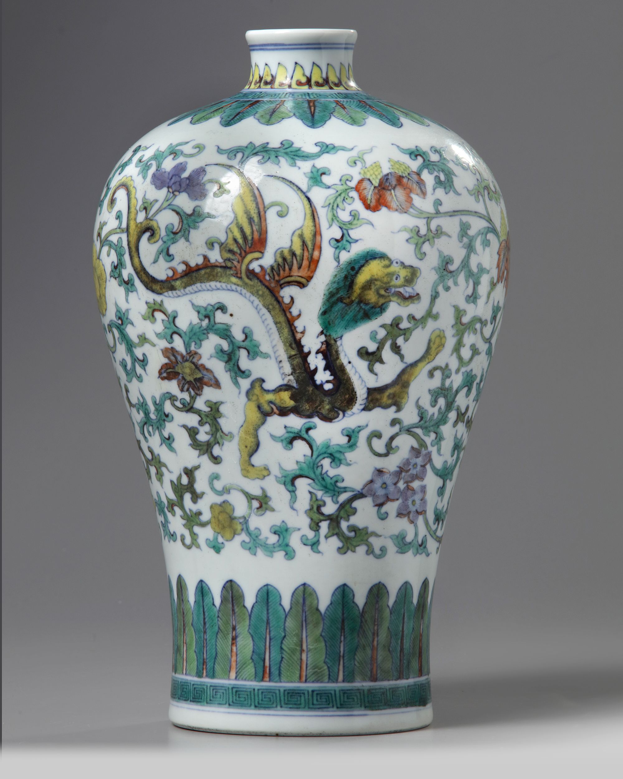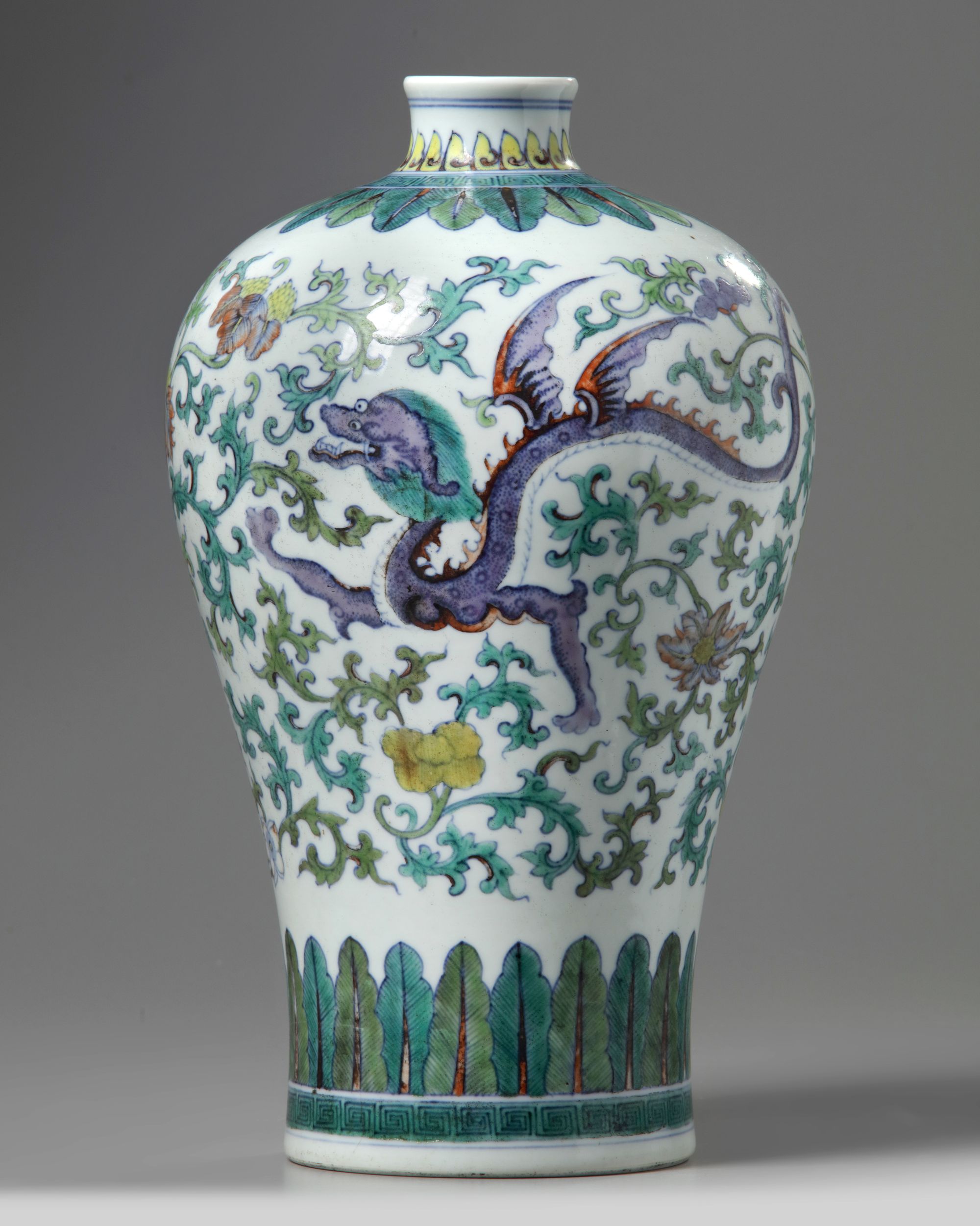 The vase is decorated with two confronting sinuous winged dragons amongst densely scrolling flowers, the shoulder and foot are decorated with still leaf bands.
