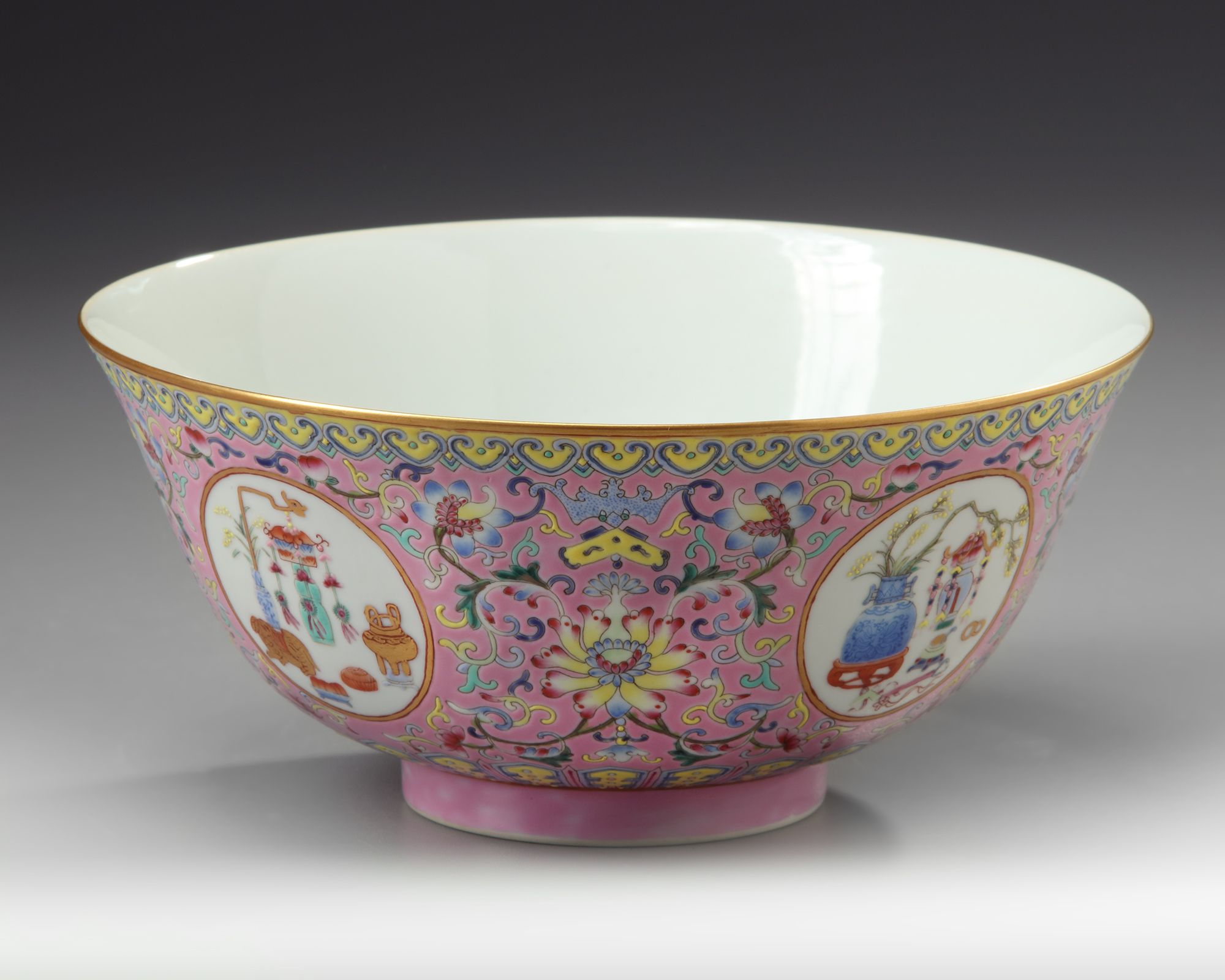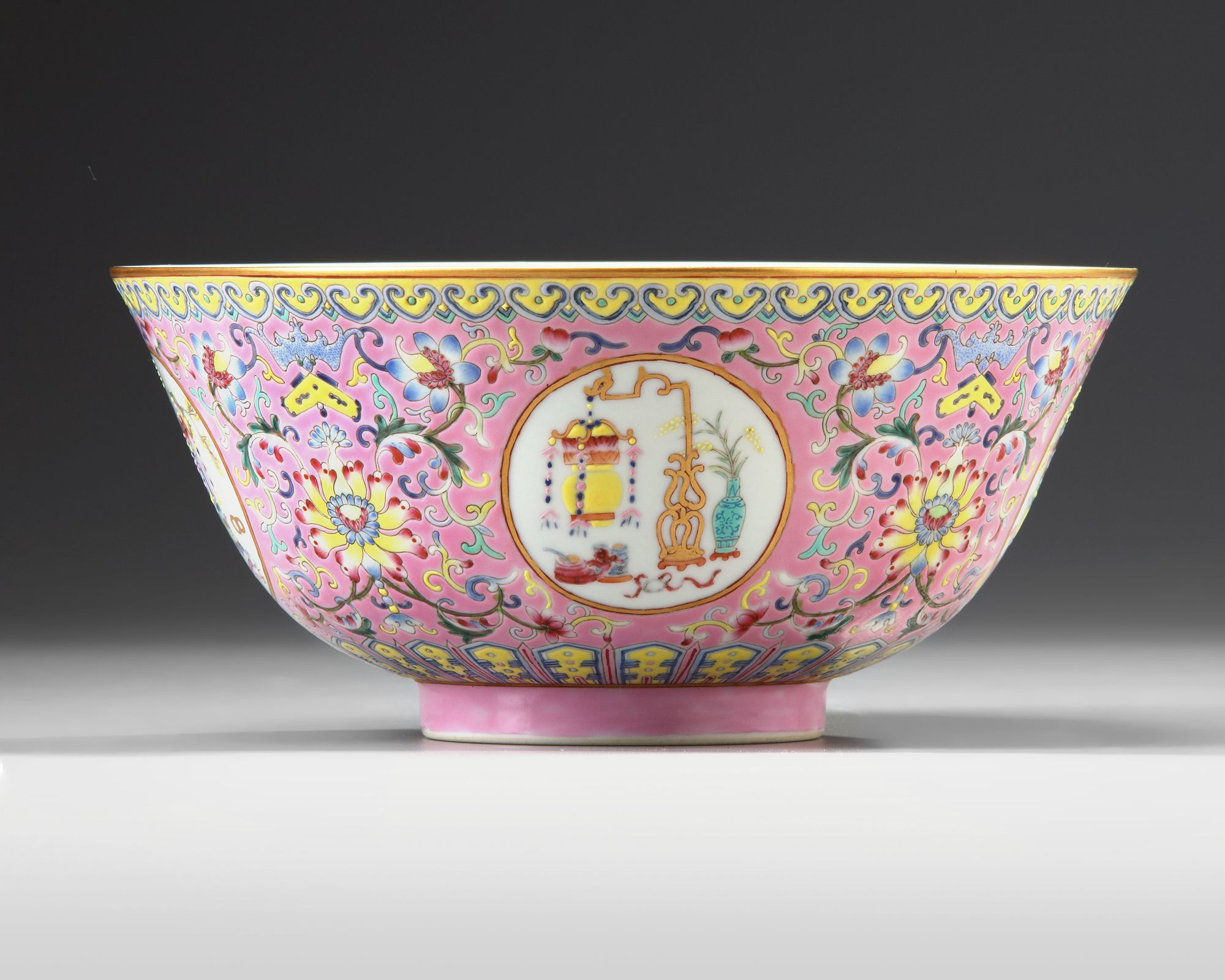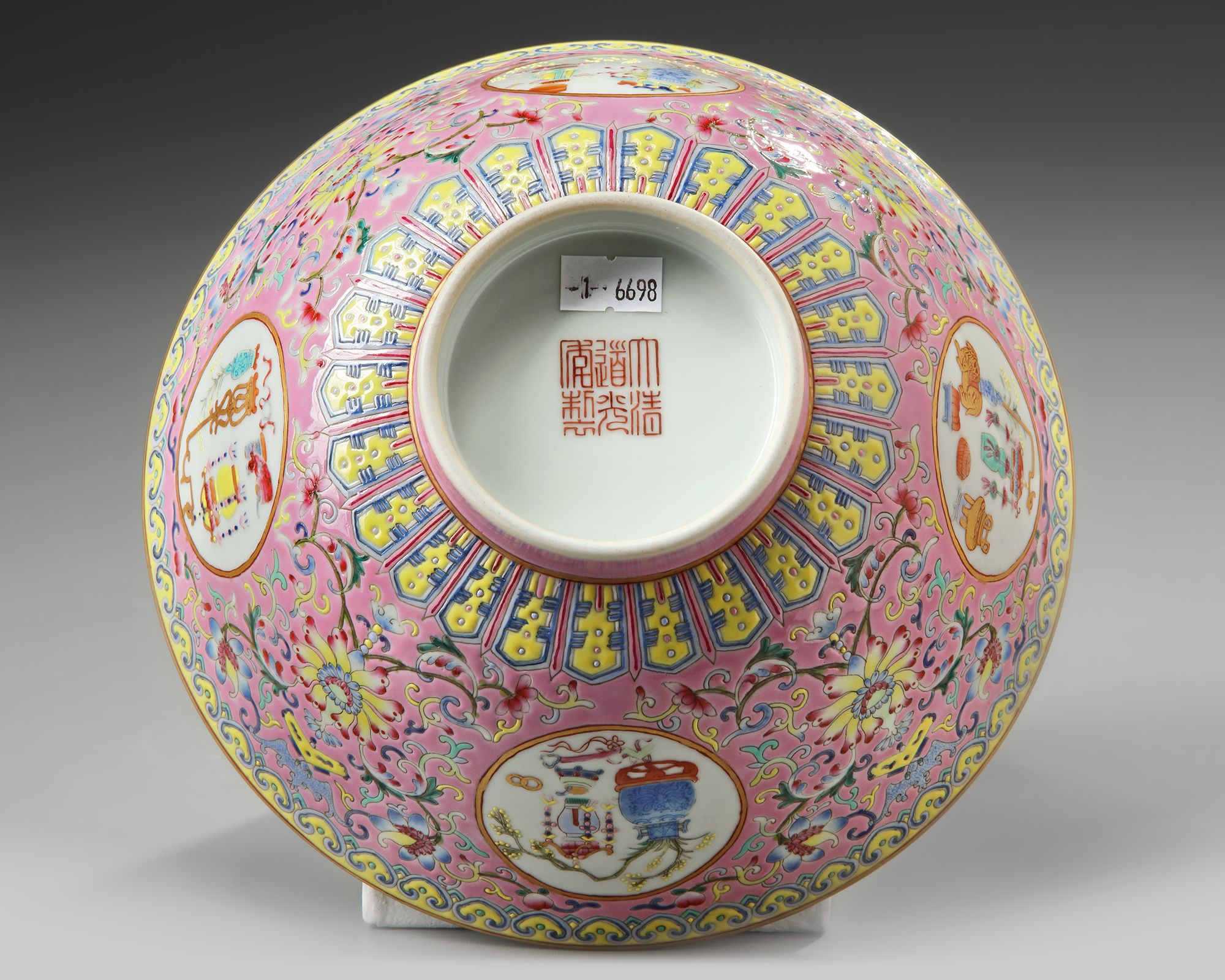 The exterior delicately enamelled with stylised lotus sprays on a pink sgraffito ground reserved with four circular panels of precious objects, set between a band of ruyi heads and a petal lappet order.