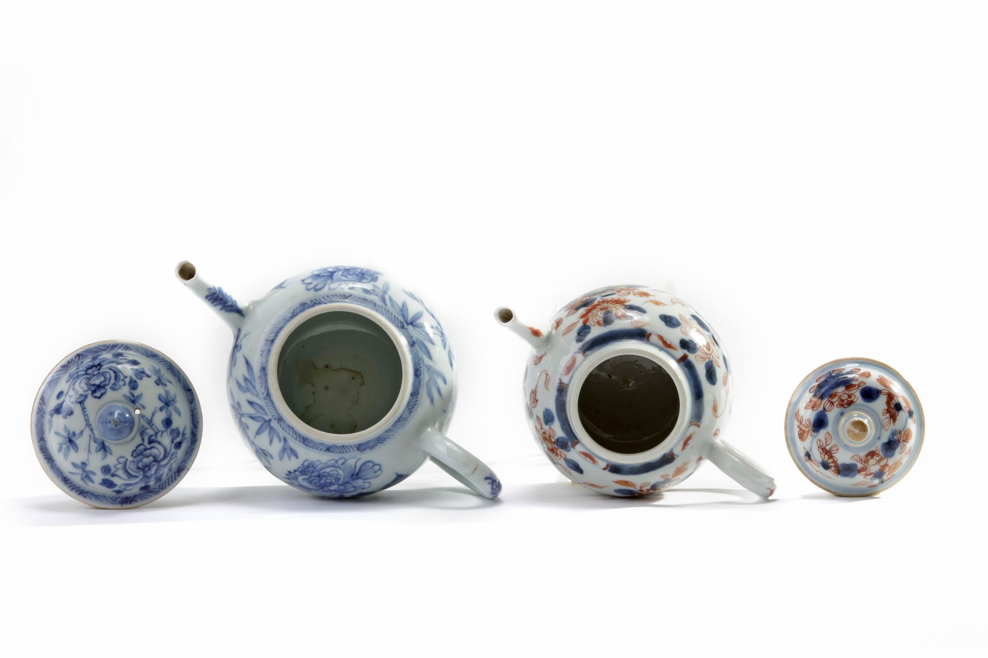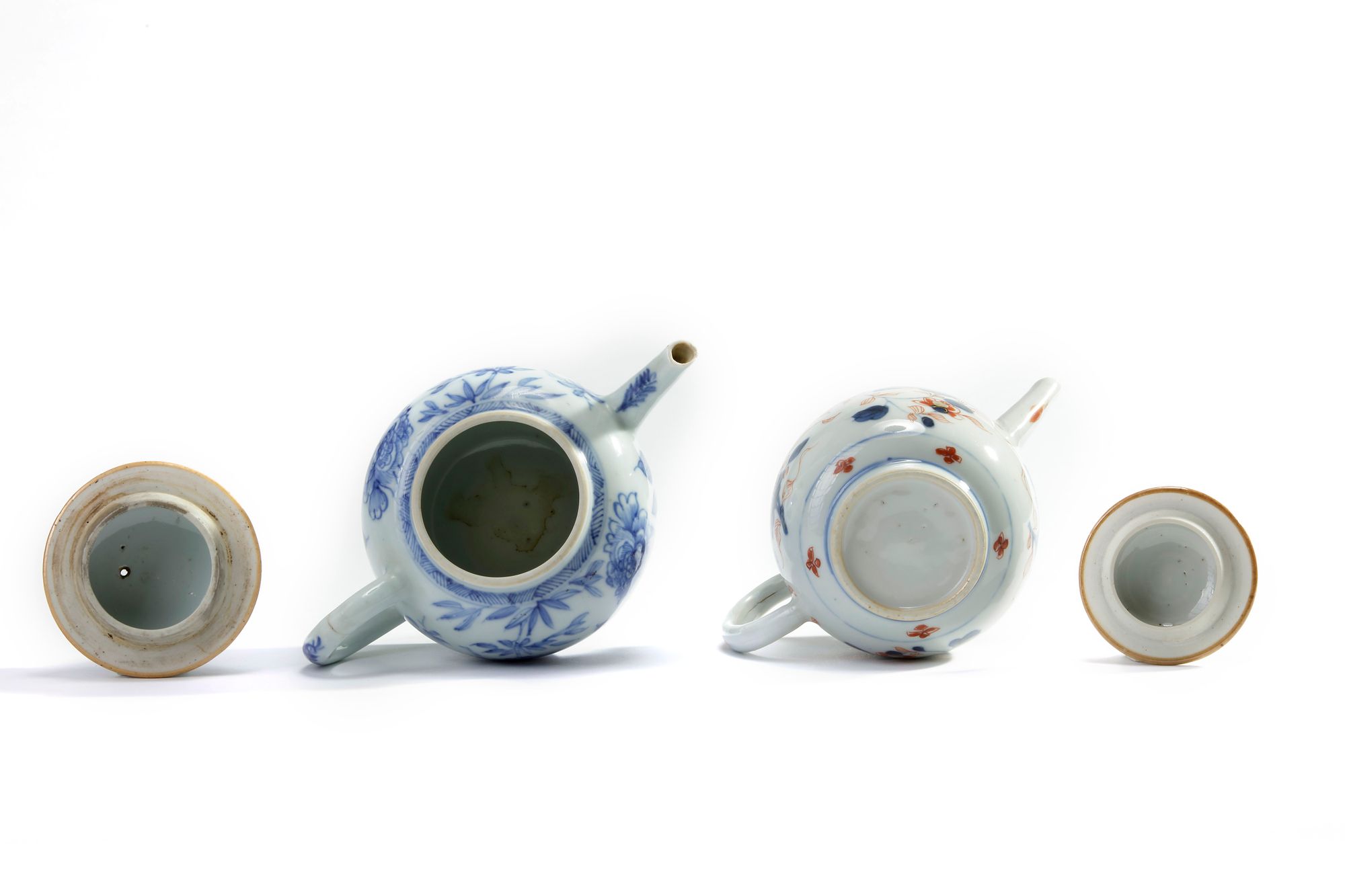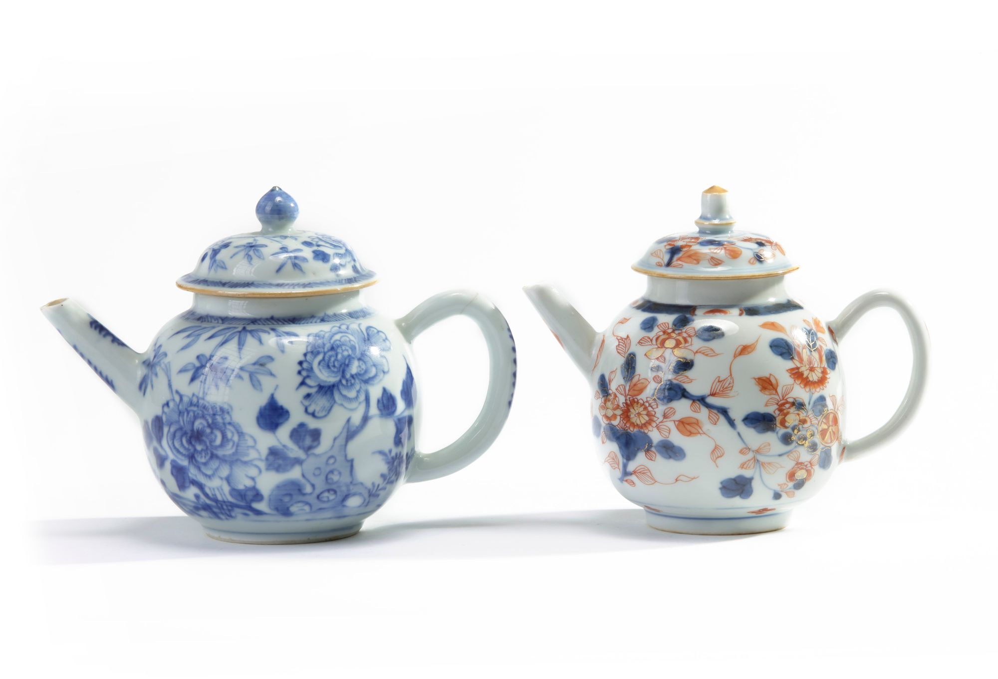 The Chinese imari teapot is decorated with iron red and gilt flowers on a leafy underglaze blue branches. The domed cover is similarly decorated with a hat-shaped finial with café-au-lait highlights to the rim and the top of the finial. The blue and white teapot is decorated with roses and bamboo amongst pierced rocks. The pierced cover is decorated with further flowers and bamboo and is surmounted by a lotus bud finial.