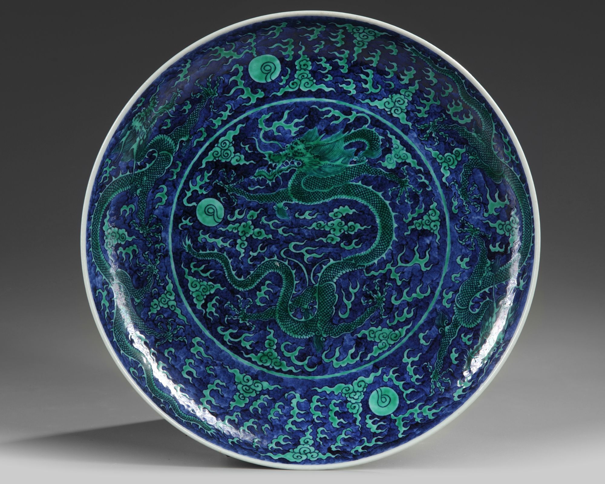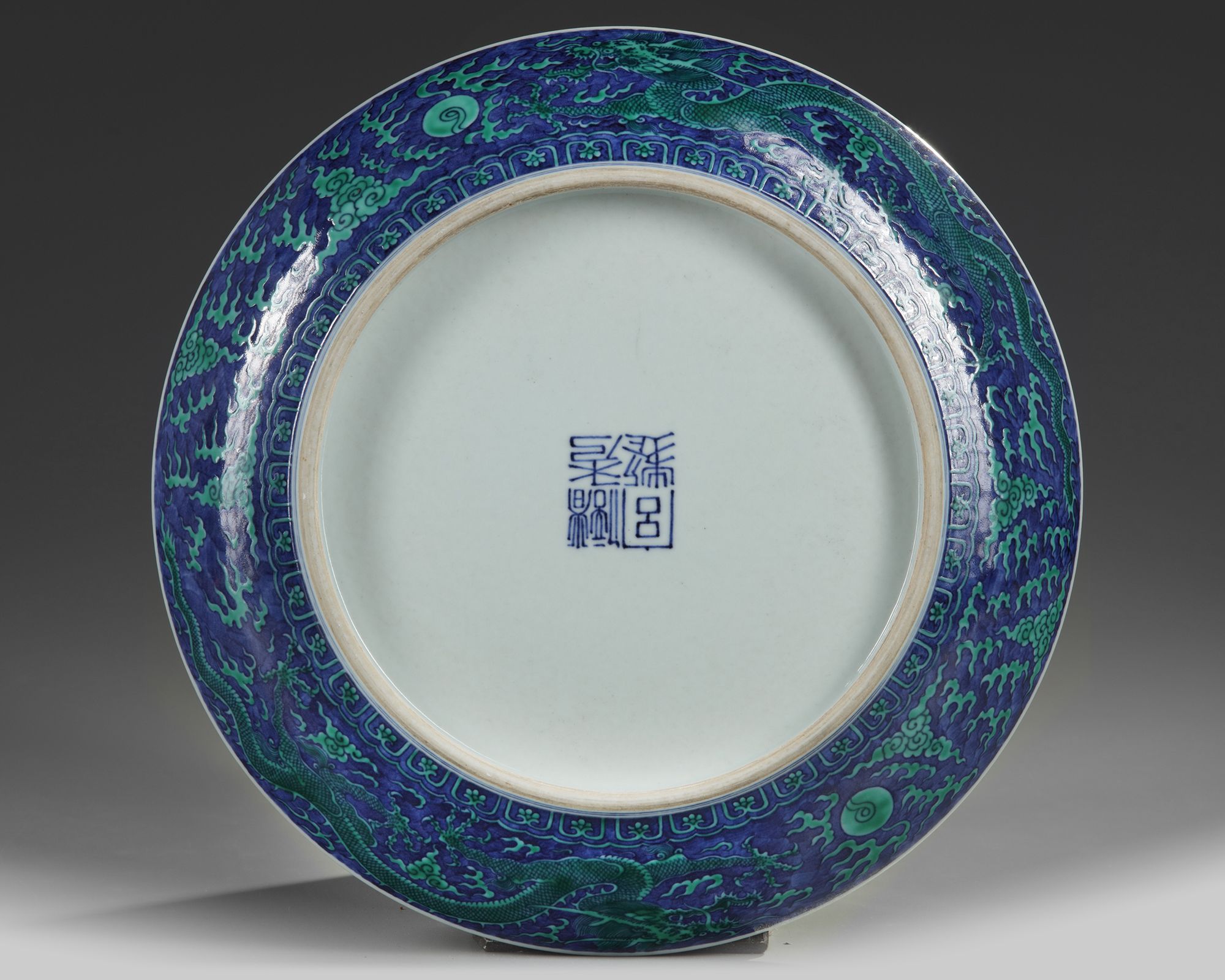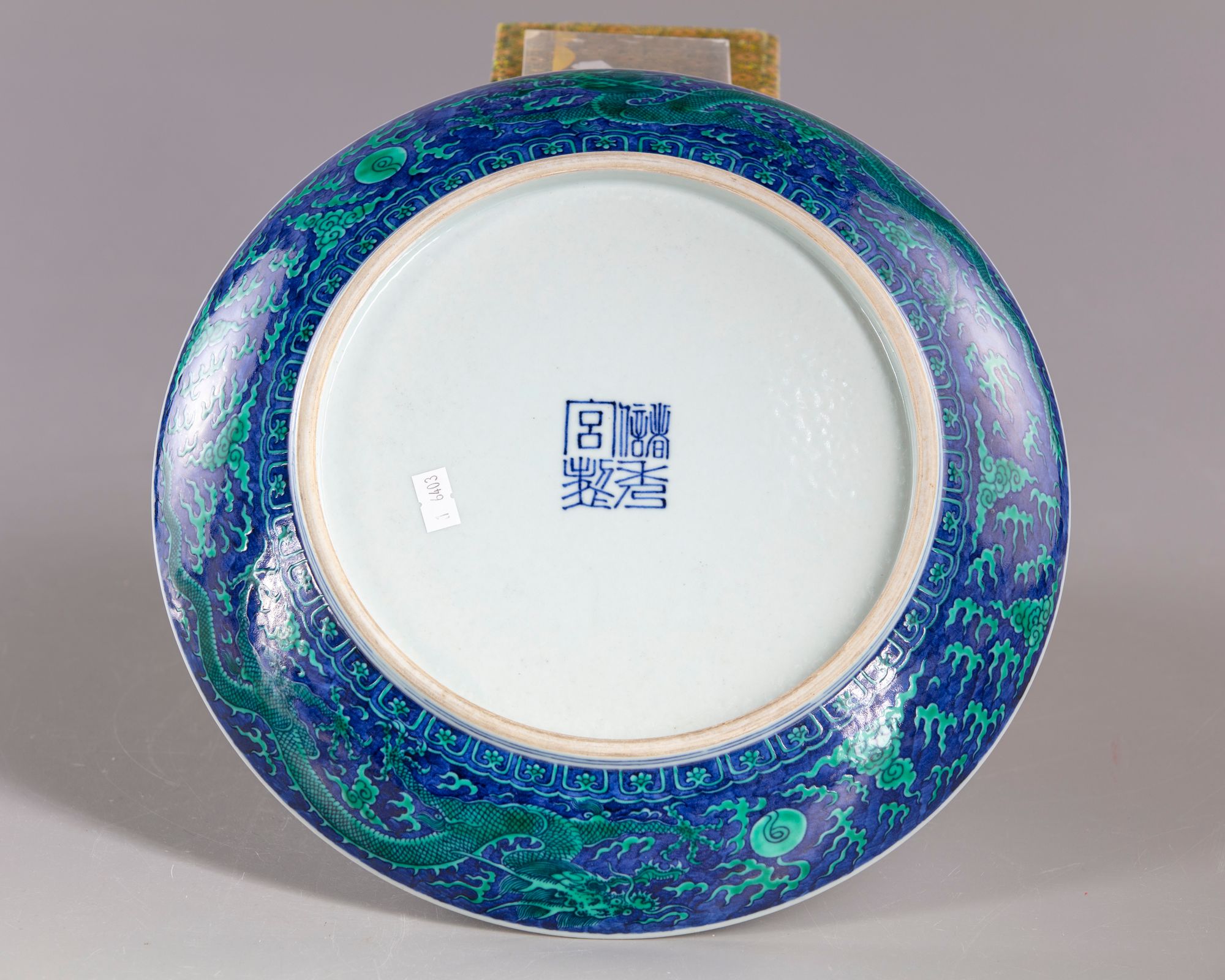 The dish is decorated to the exterior and the interior with five-clawed dragons chasing flaming pearls amongst clouds. The base bears the four-character seal mark "Chu Xiu Gong zhi" in underglaze blue.