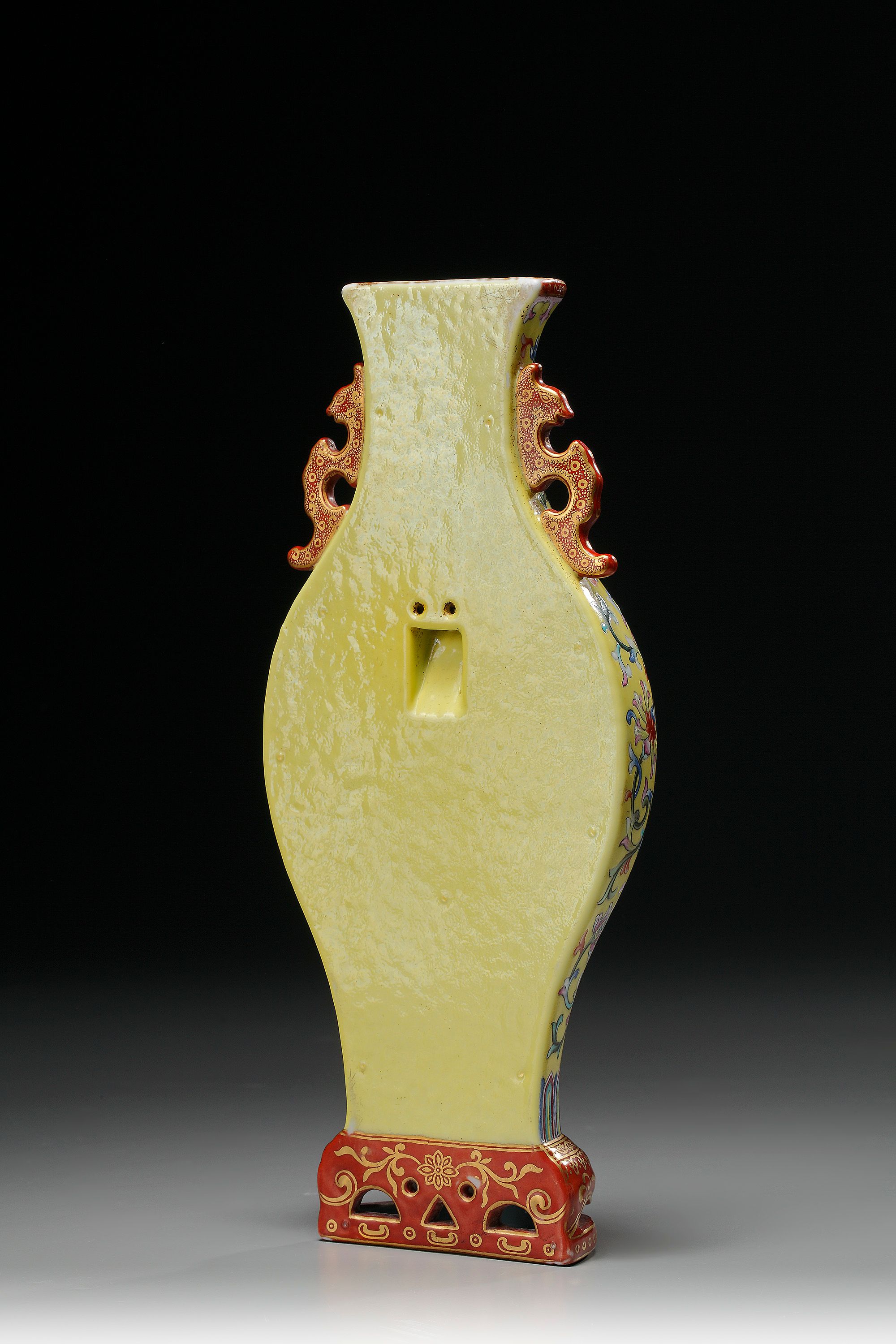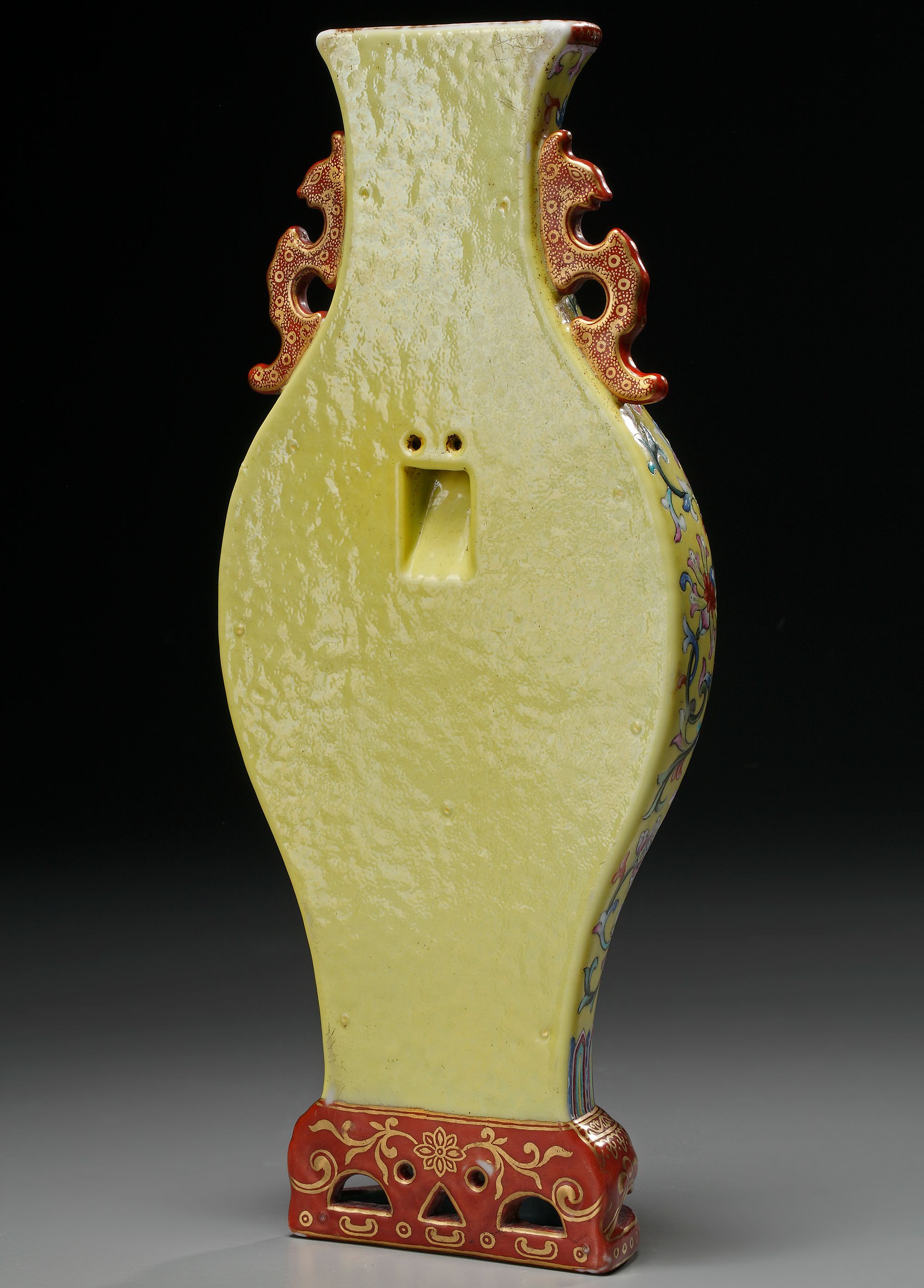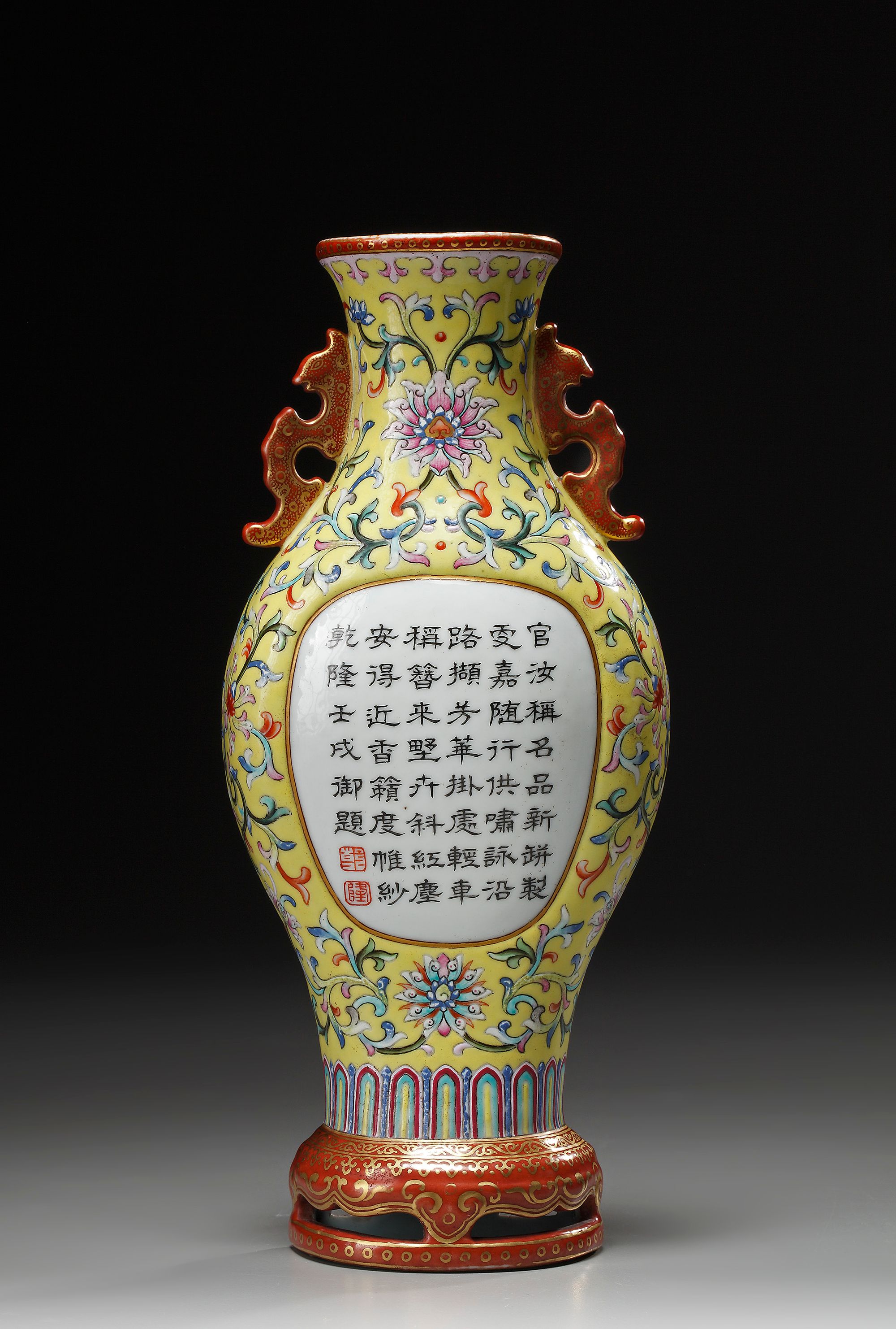 The raised panel on the baluster vase is inscribed with a calligraphic poem, reserved on a yellow ground embellished with floral motifs in famille rose and flanked by a pair of iron-red and gilt-decorated archaistic handles. The interior and base are covered in turquoise enamel, and the reverse has apertures for attachment. With Qianlong Six-Character Mark in Iron Red and possibly of the period (1736-1795)