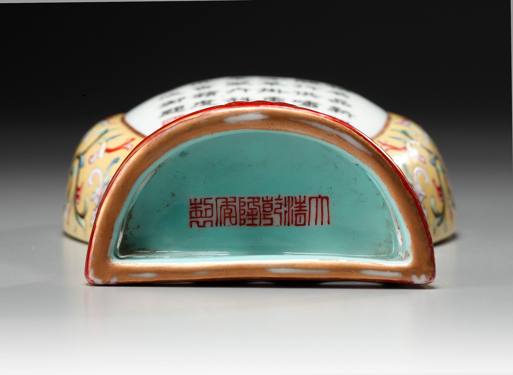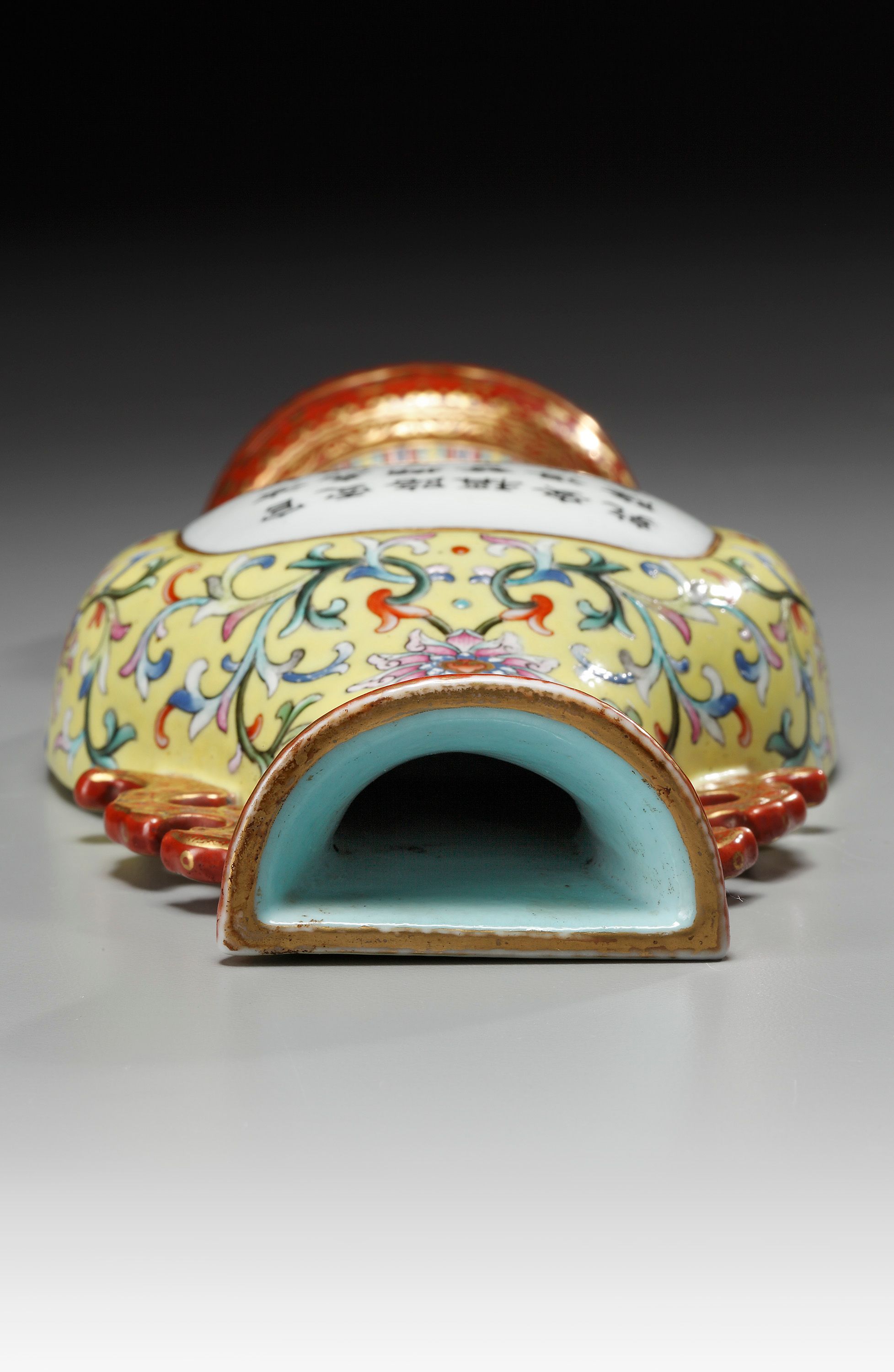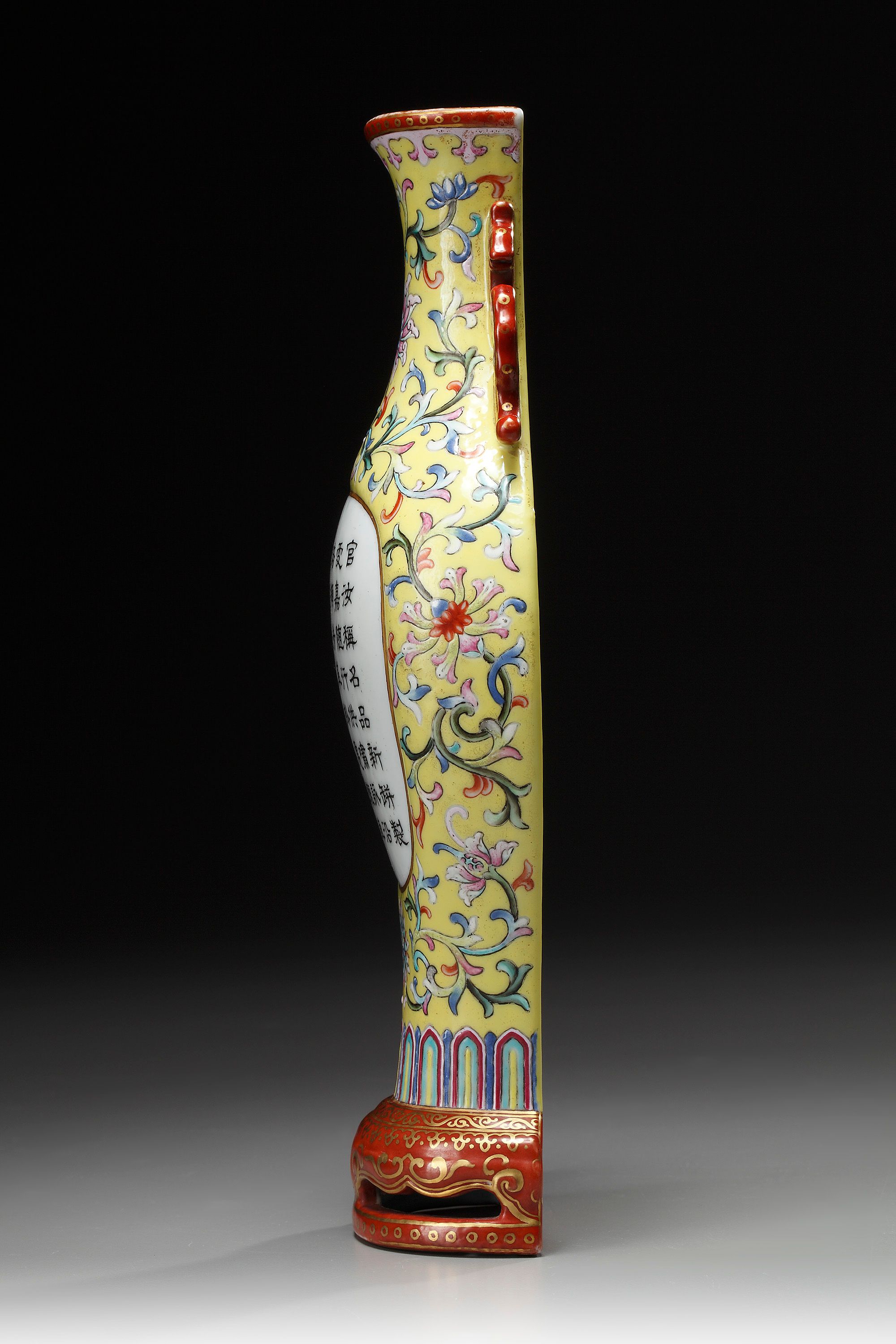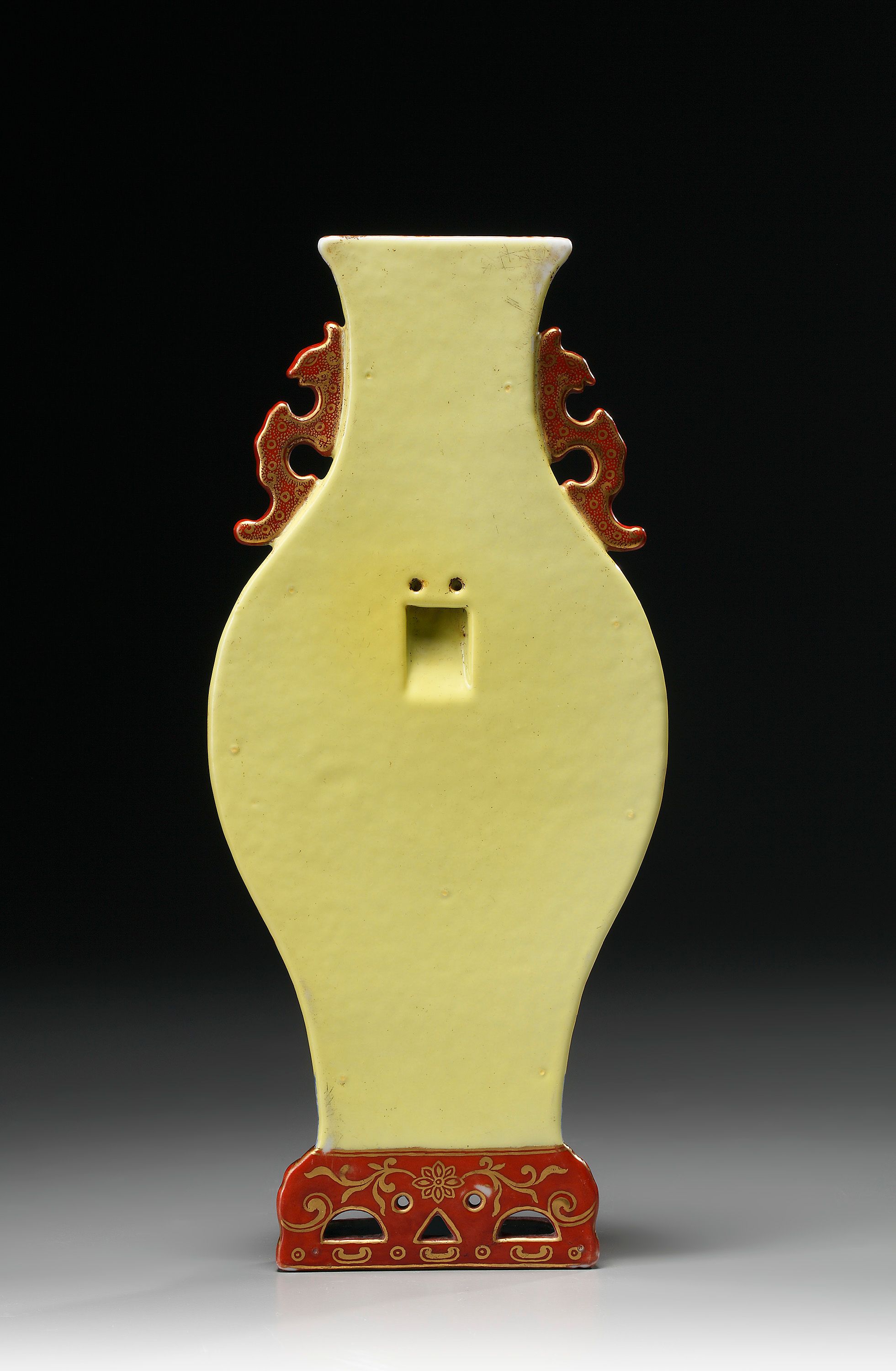 The raised panel on the baluster vase is inscribed with a calligraphic poem, reserved on a yellow ground embellished with floral motifs in famille rose and flanked by a pair of iron-red and gilt-decorated archaistic handles. The interior and base are covered in turquoise enamel, and the reverse has apertures for attachment. With Qianlong Six-Character Mark in Iron Red and possibly of the period (1736-1795)