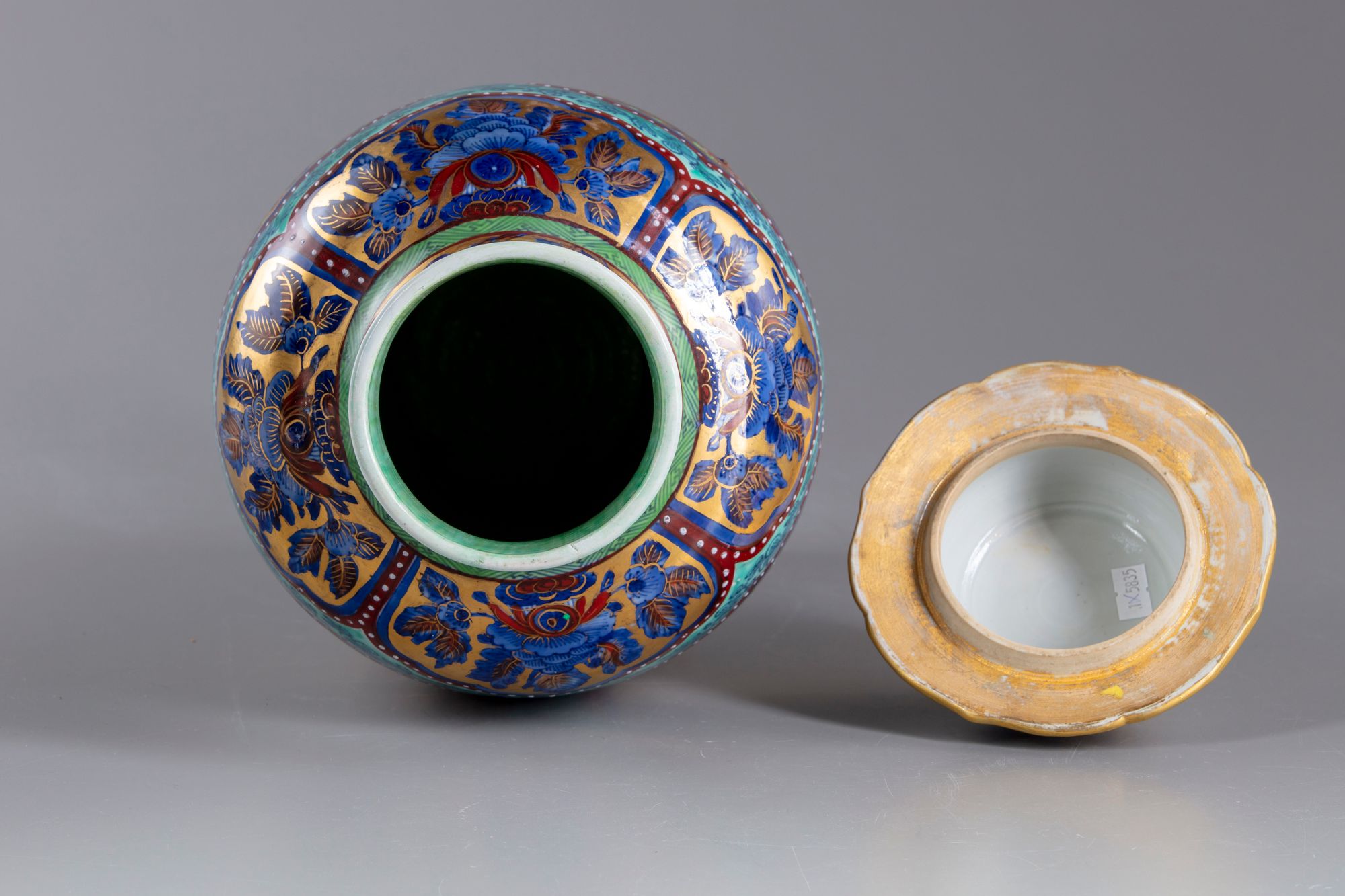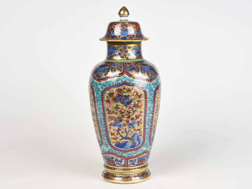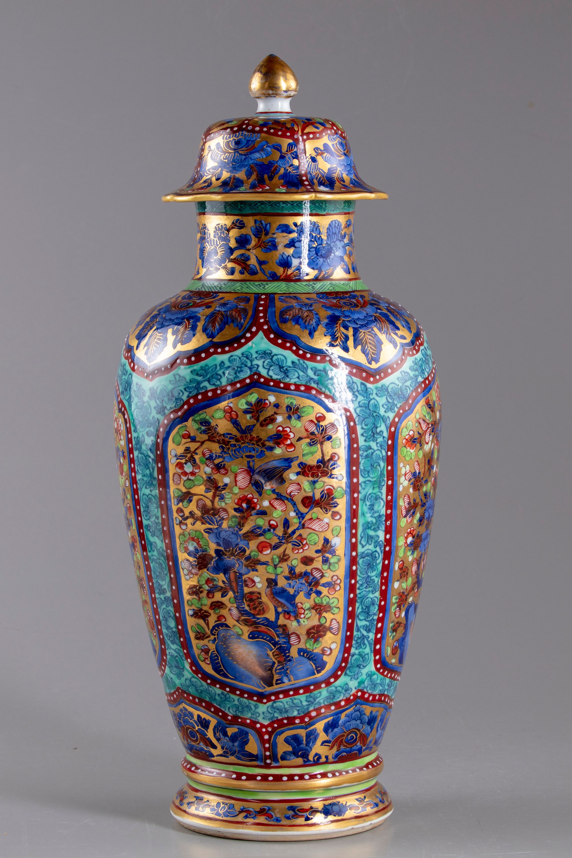 The vase is decorated with shaped panels enclosing birds and flowers growing from rocks, all surrounded by flower scrolls executed in pencil style. The shoulder and foot are encircled by a lappet band enclosing peonies, and the neck with a band of chrysanthemum. The cover is similarly decorated and is surmounted by a lotus bud finial. The vase is covered overall with later coloured enamels and gilding.