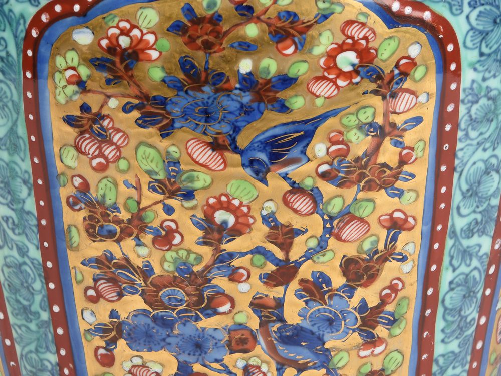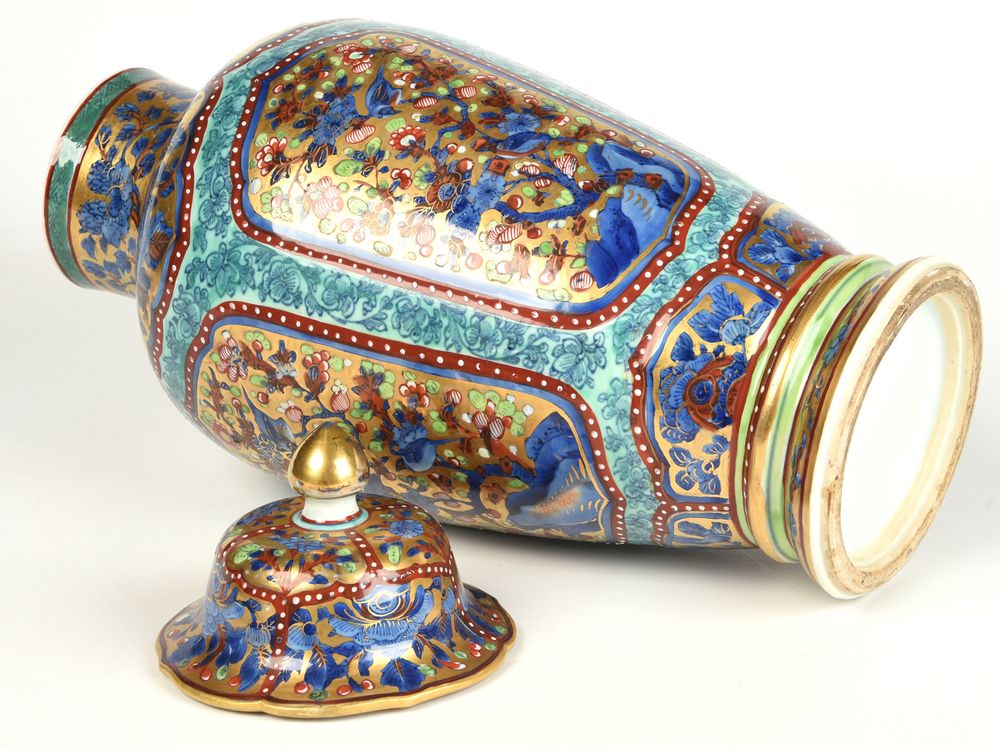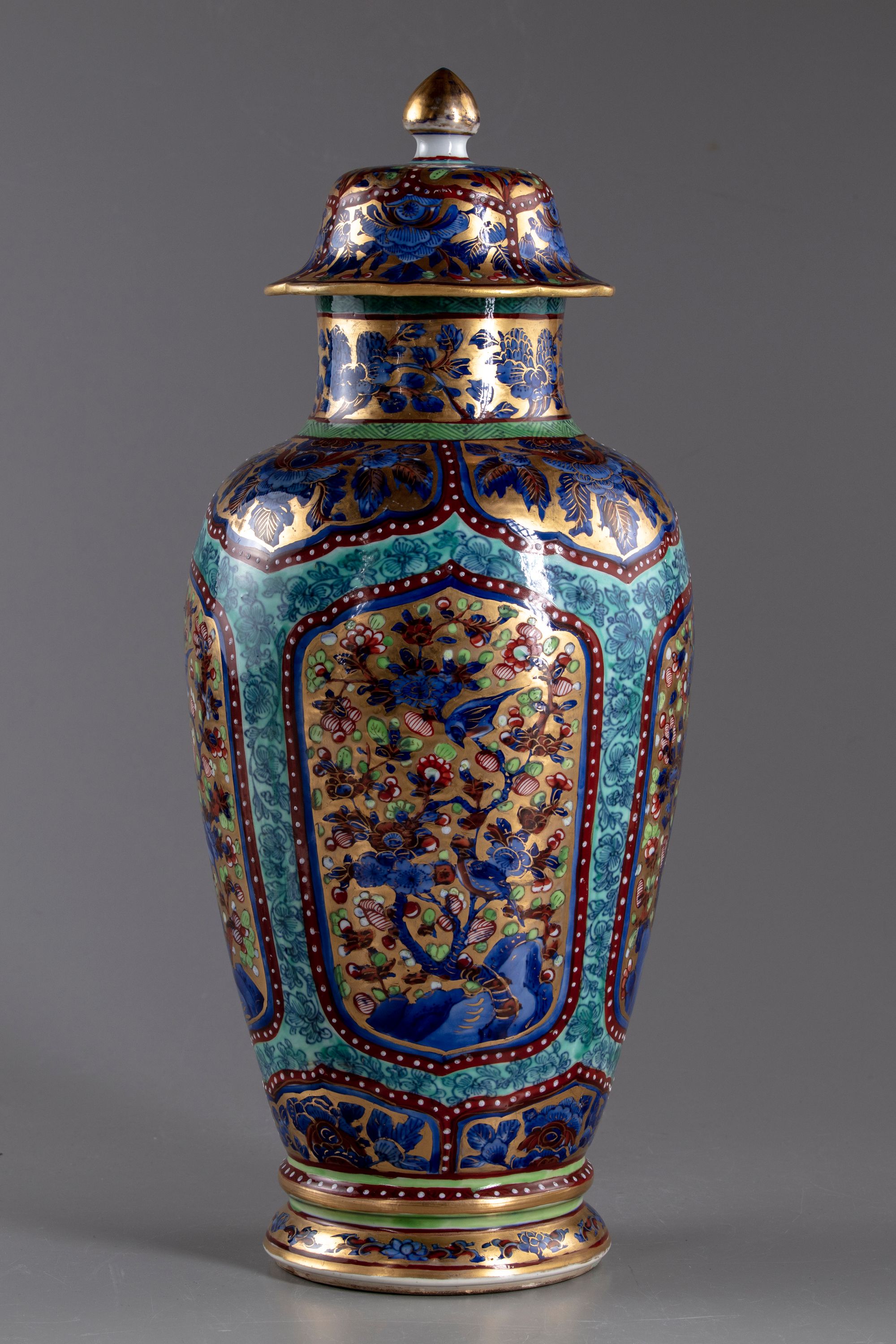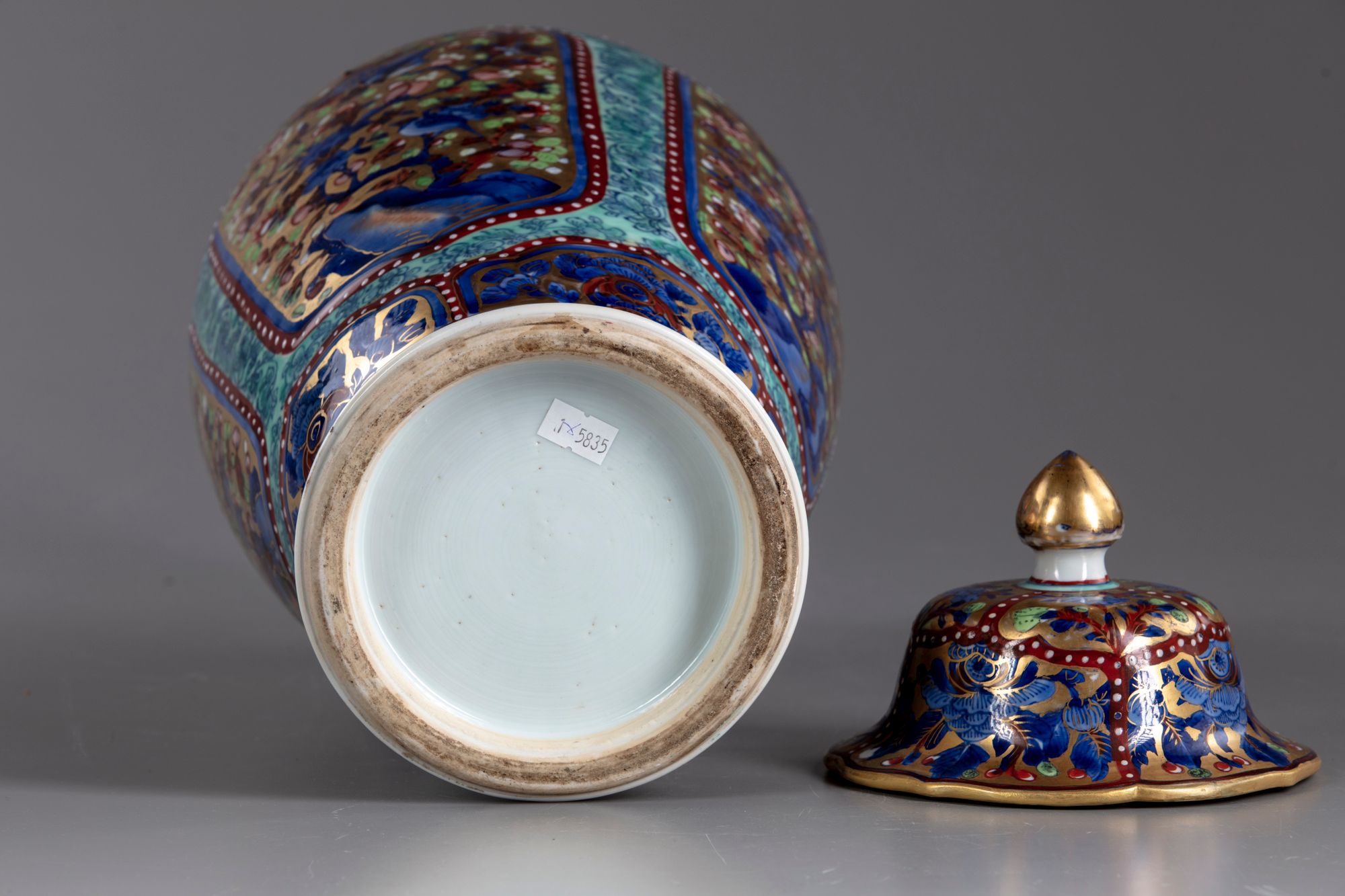The vase is decorated with shaped panels enclosing birds and flowers growing from rocks, all surrounded by flower scrolls executed in pencil style. The shoulder and foot are encircled by a lappet band enclosing peonies, and the neck with a band of chrysanthemum. The cover is similarly decorated and is surmounted by a lotus bud finial. The vase is covered overall with later coloured enamels and gilding.