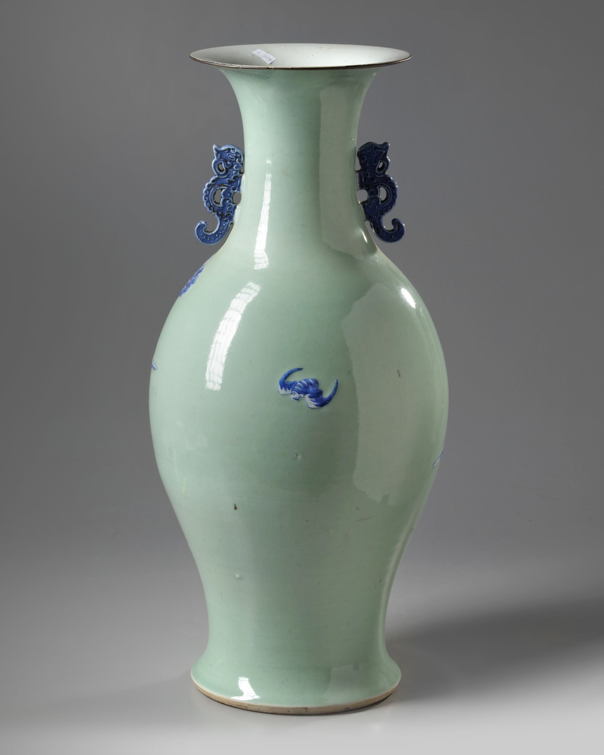 A large chinese vase stylised with dragon shaped handles, decorated in blue and white with "The eight immortal" in a landscape on a celadon glazed ground.