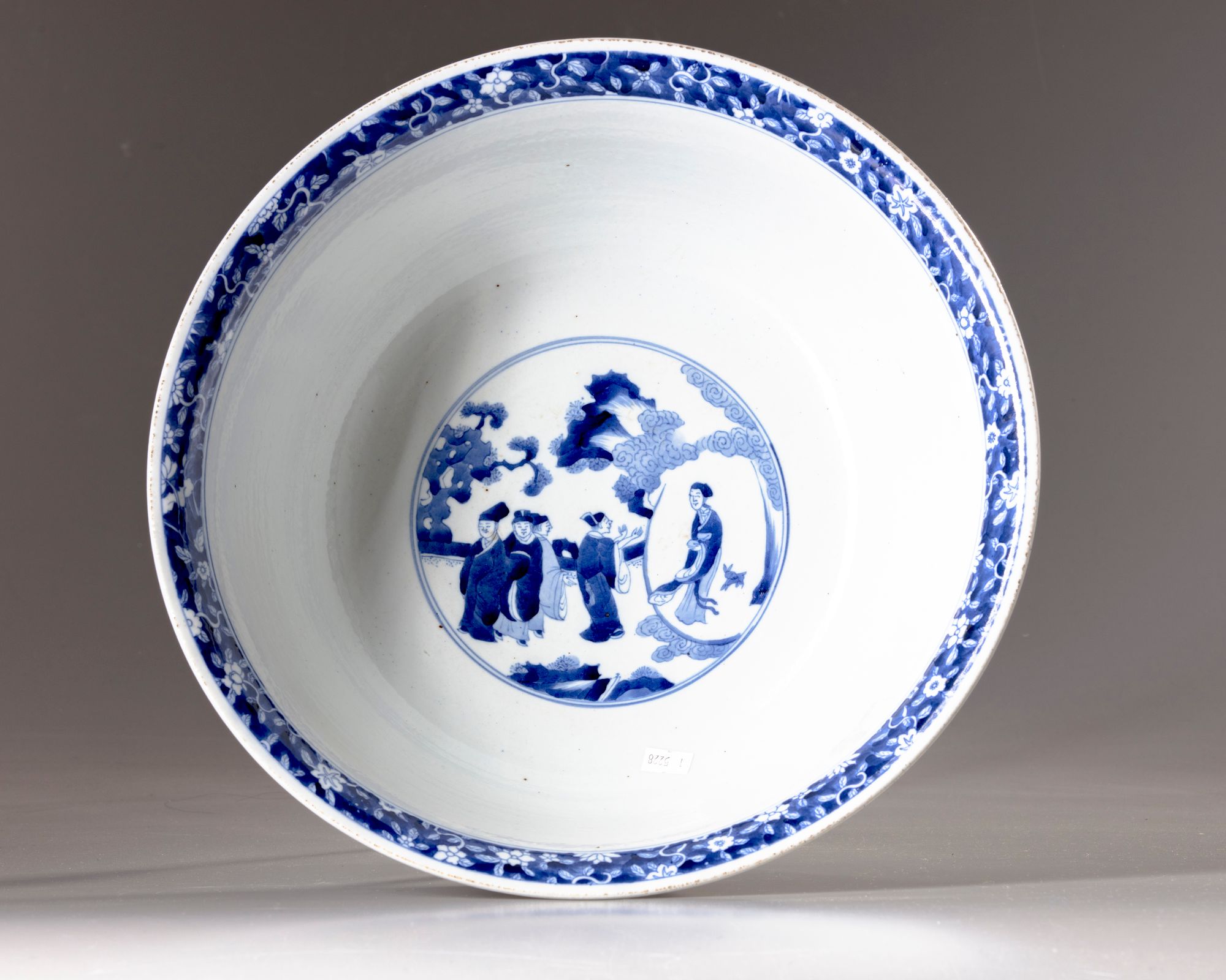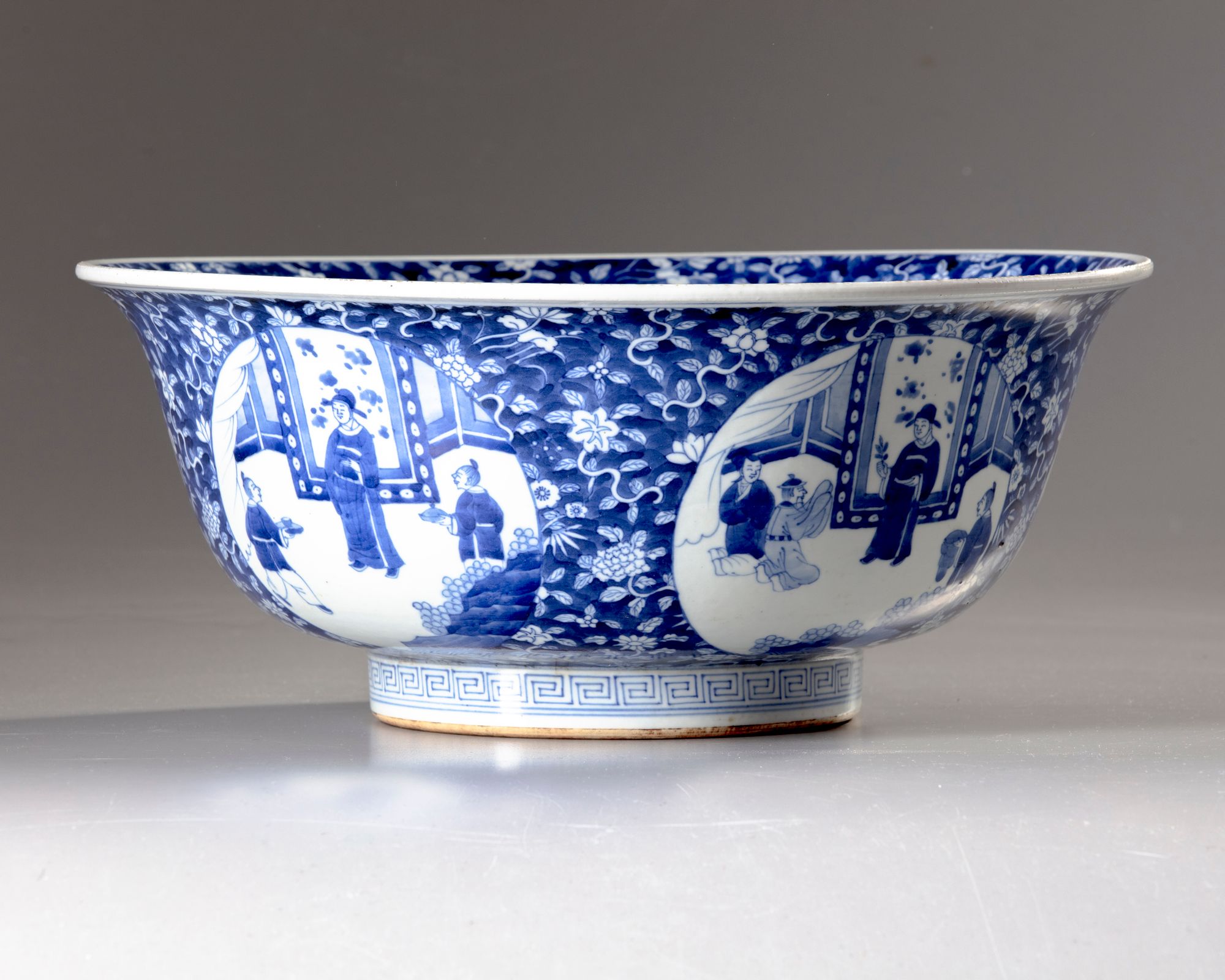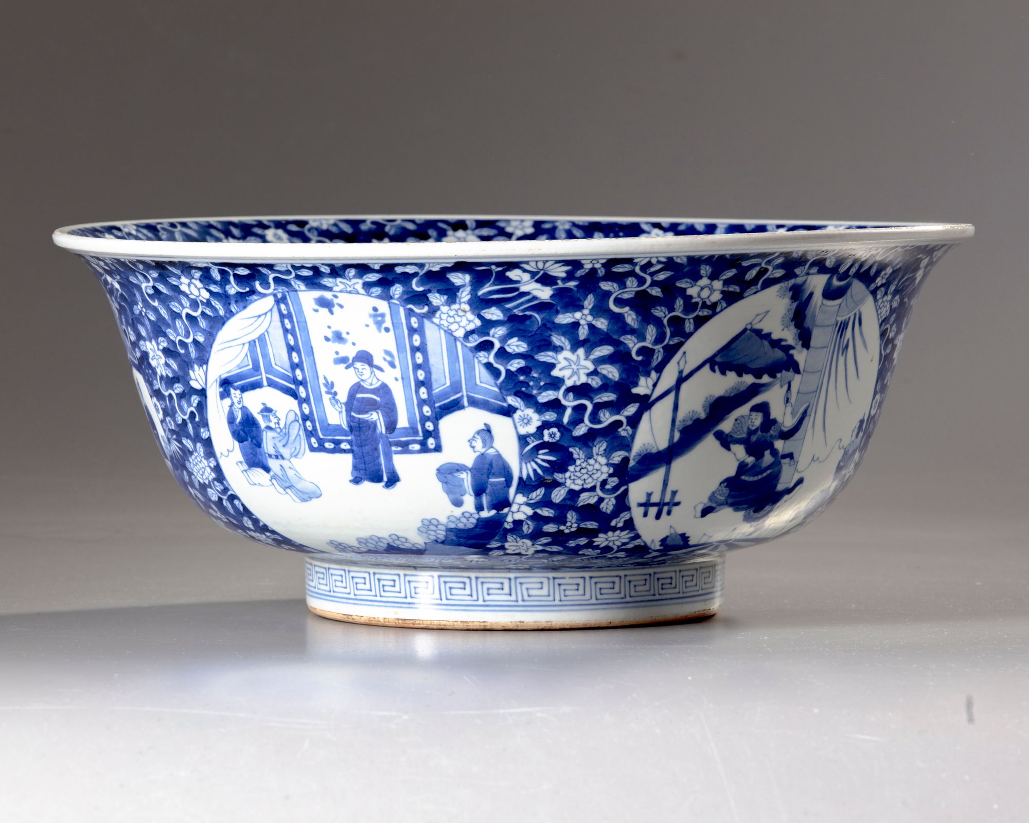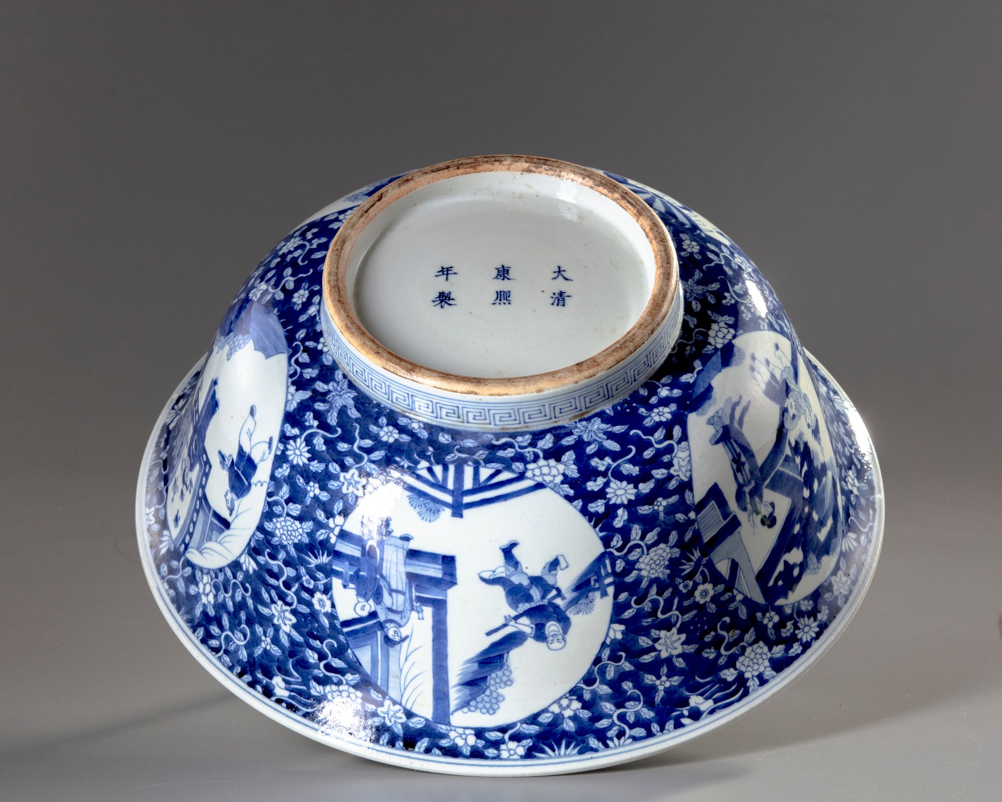 The large bowl is decorated to the interior with a roundel enclosing figures, the exterior with panels enclosing warriors, kids, a dignitary with his servants. All on flowers decorated ground, with a key fret chain the base. The bottom with a Kangxi six character mark.