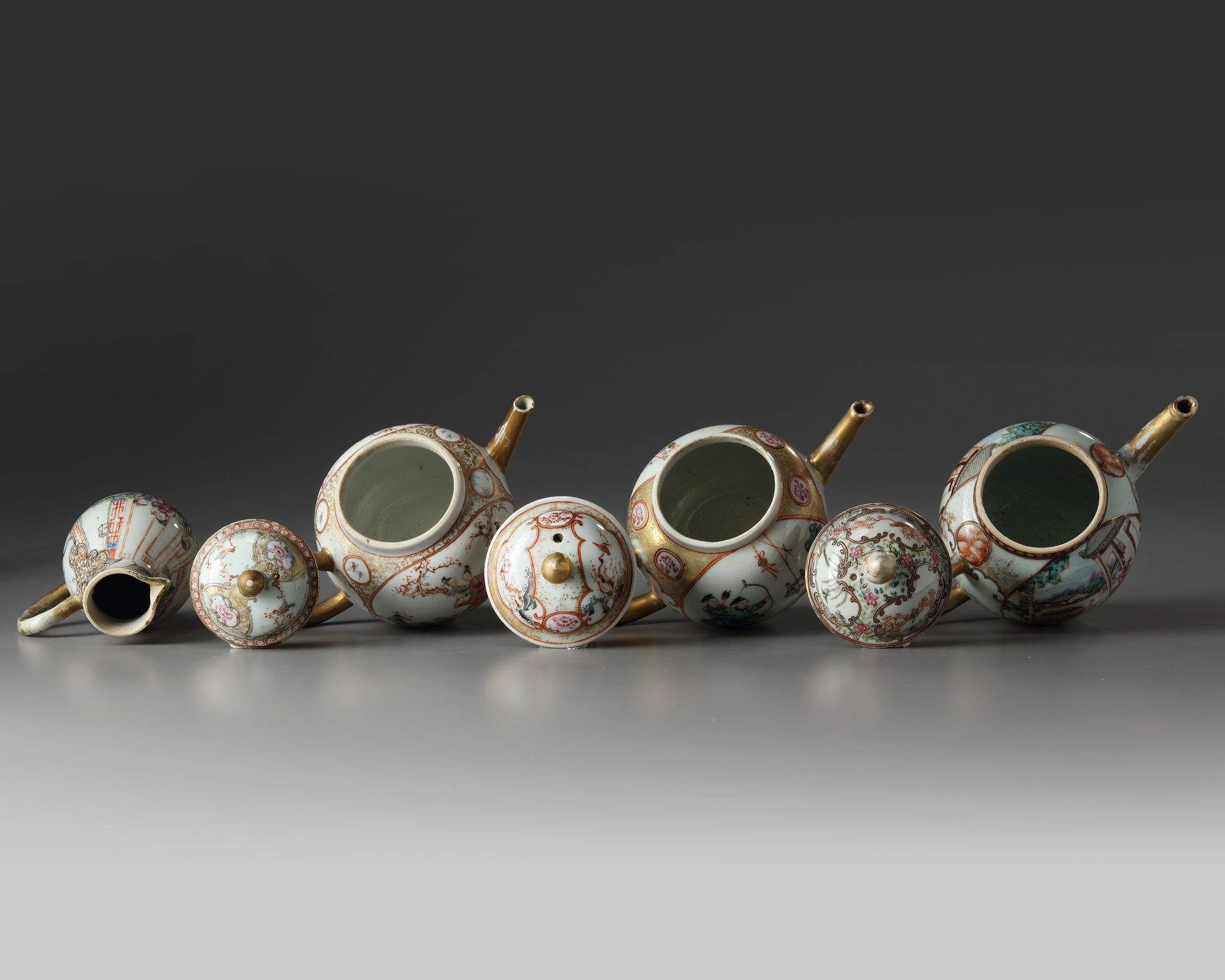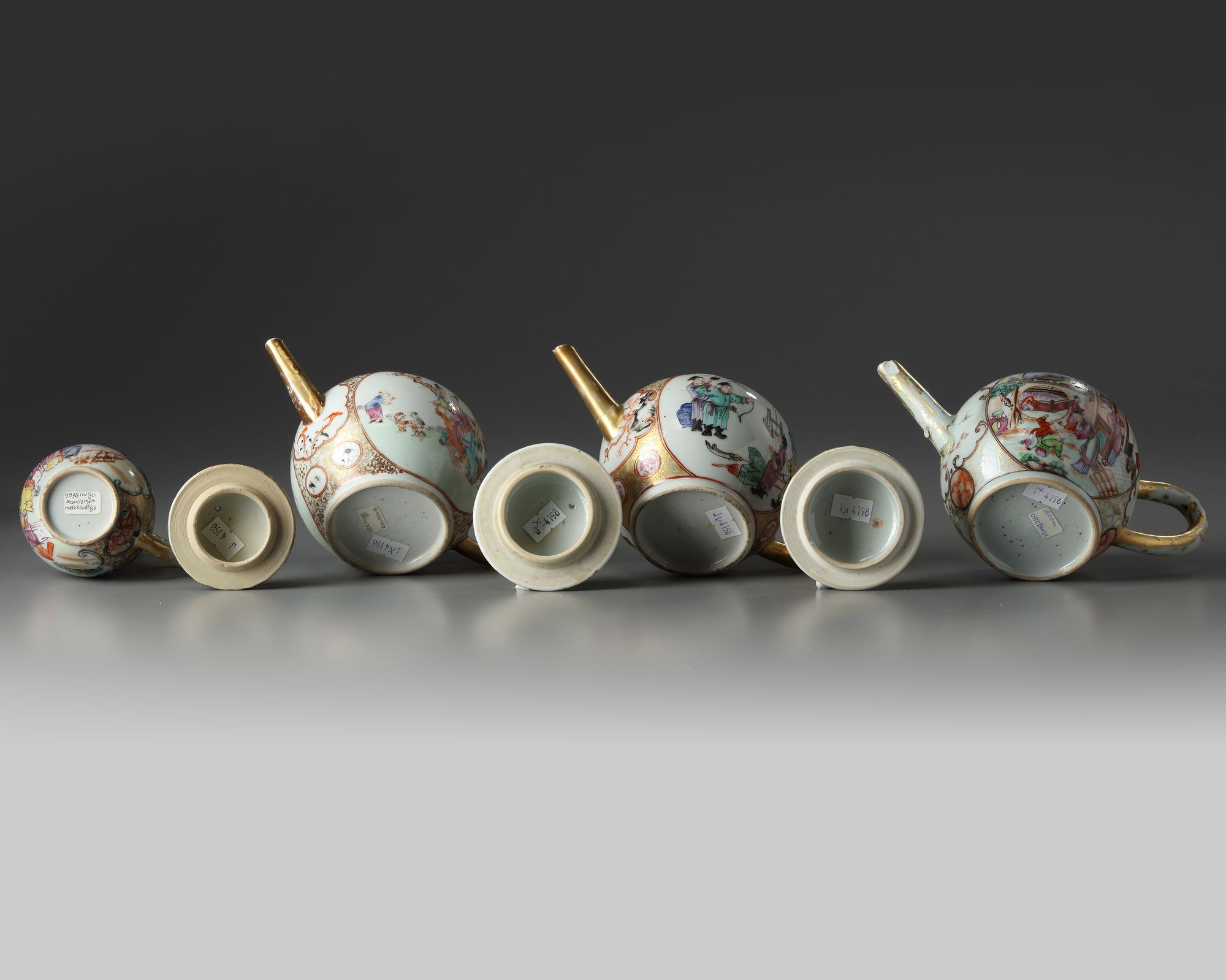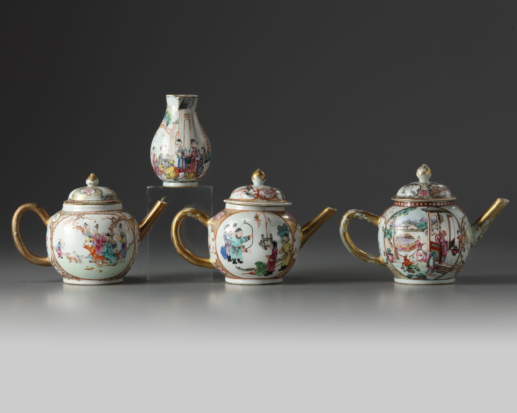 The group comprises three teapots and covers and a milk jug all decorated with large panels enclosing figures at leisure and conversing, separated by shaped panels enclosing bird and flower designs, all reserved on a densely-decorated gilt ground. The domed covers are similarly decorated.