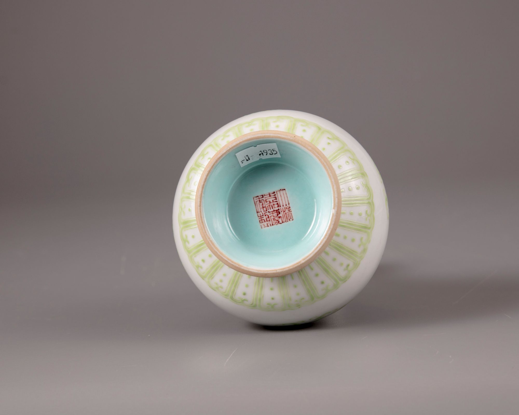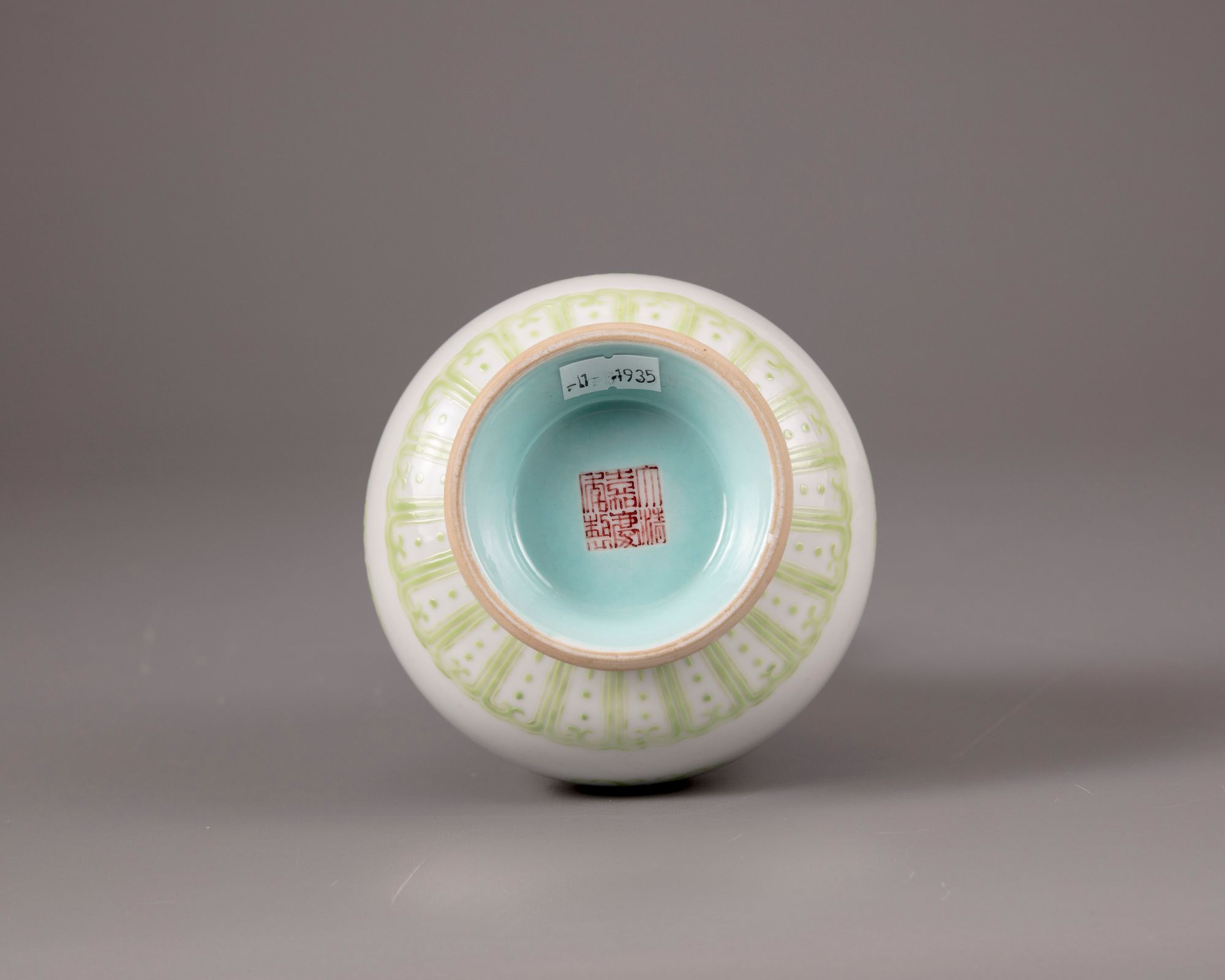 The vase is decorated to the globular body with confronting kui-dragon roundels above a floral band. The shoulder is decorated with a stiff leaf band, and a ruyi head band to the rim. The base with an apocryphal Jiaqing mark on a turquoise ground.