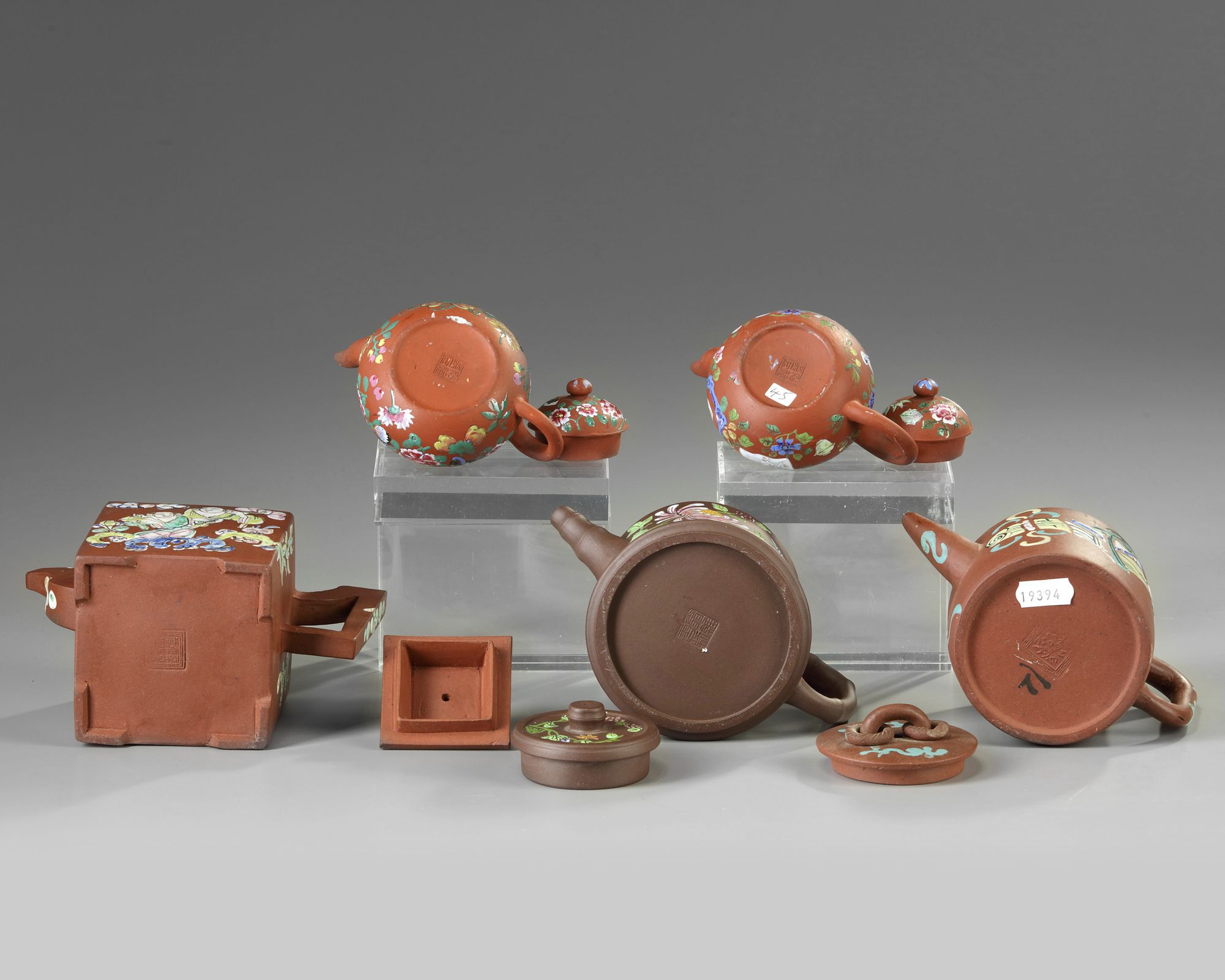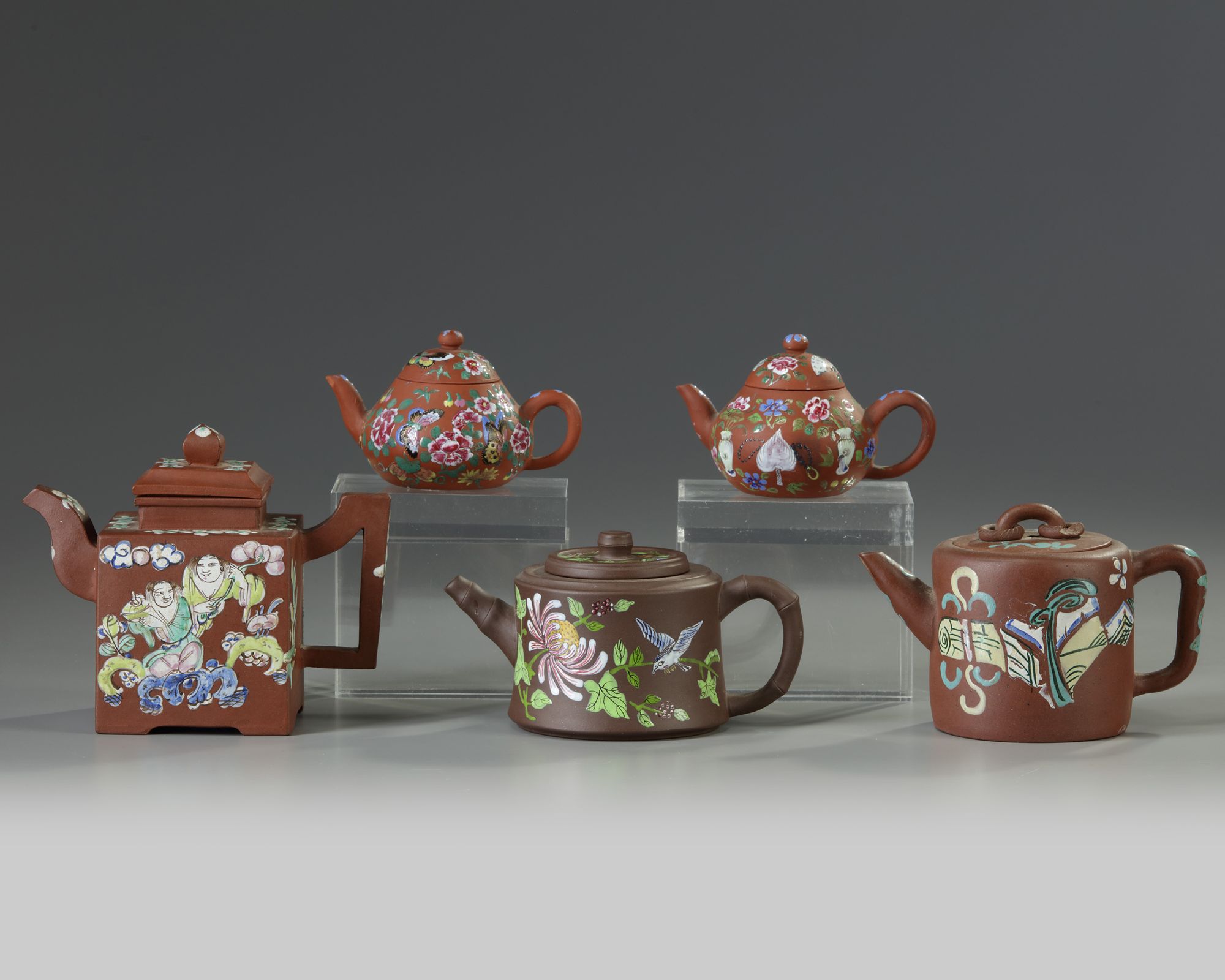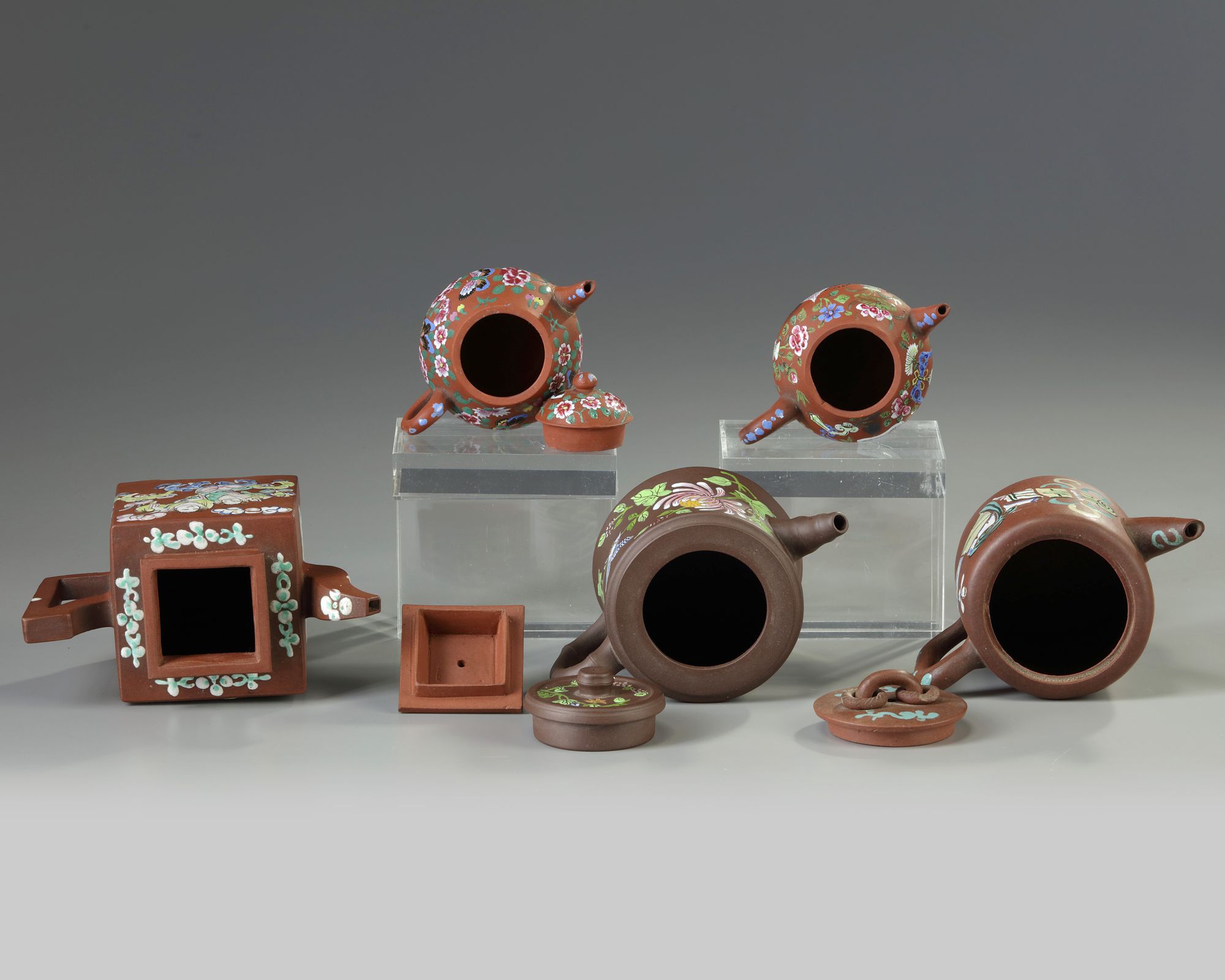 The group comprises: two similar small teapots, one decorated with precious objects, the other with flowers and butterflies, each stamped with a seal mark; a large square-section teapot decorated with the Laughing Twins (hehe erxian), lotus, and prunus flowers, the base is stamped with a ‘Yixing Zisha minghu’ mark, the underside of the cover is stamped with the maker’s mark ‘Yuan Ting’; a cylindrical teapot decorated with a bamboo-shaped handle and spout and chrysanthemum to the body, the base stamped ‘Weng Weiyun zhi’; a cylindrical teapot with a straight spout decorated with auspicious attributes, the flat cover is surmounted by a finial with two loose rings, the base is stamped with a floral mark and the underside of the cover with a stamped pictorial mark.