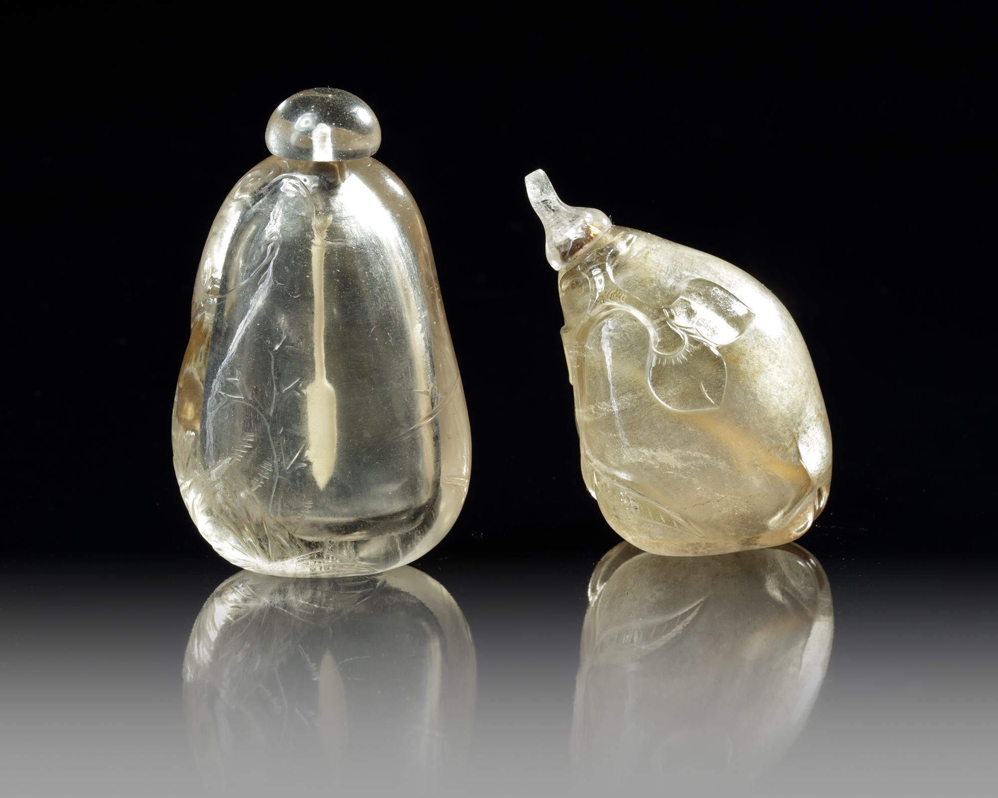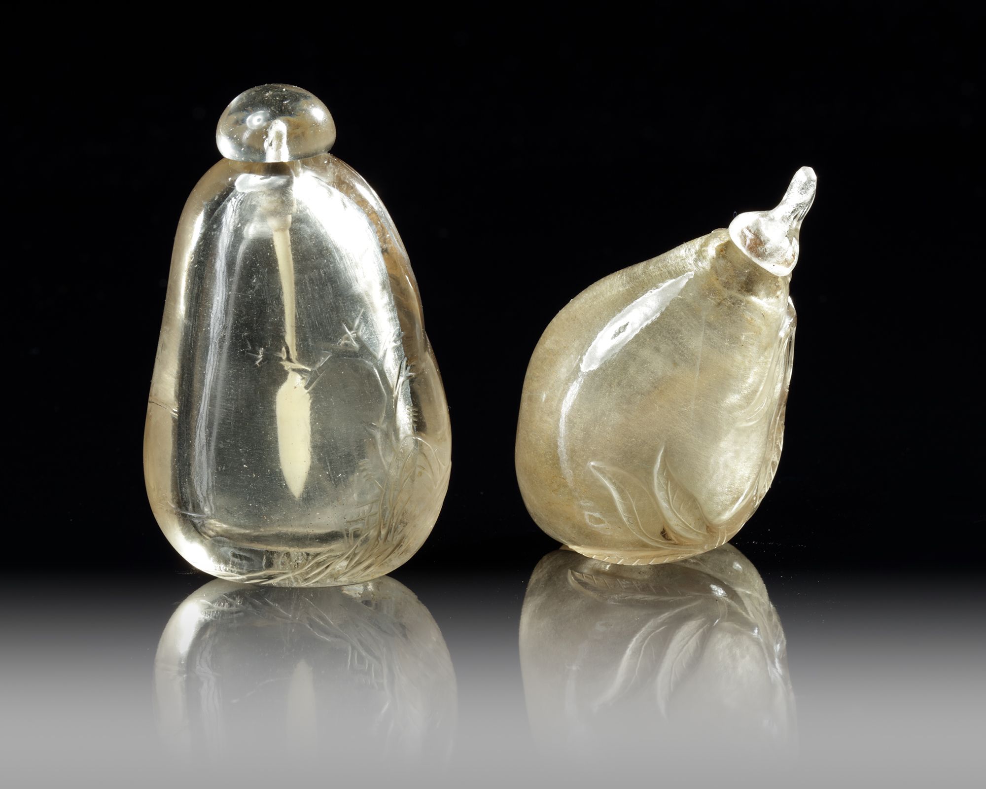 The first pebble-shaped snuff bottle is carved in relief with a landscape scene, and the other pebble-shaped snuff bottle is carved with two peaches on a leafy vine. 6.00 and 7.00 CM high.