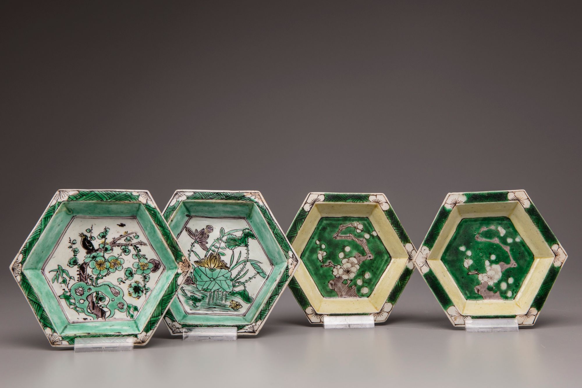 Each pair of the dishes is variously decorated with flowering prunus and lotus, the rims with a prunus blossom to the corners on a geometric band.