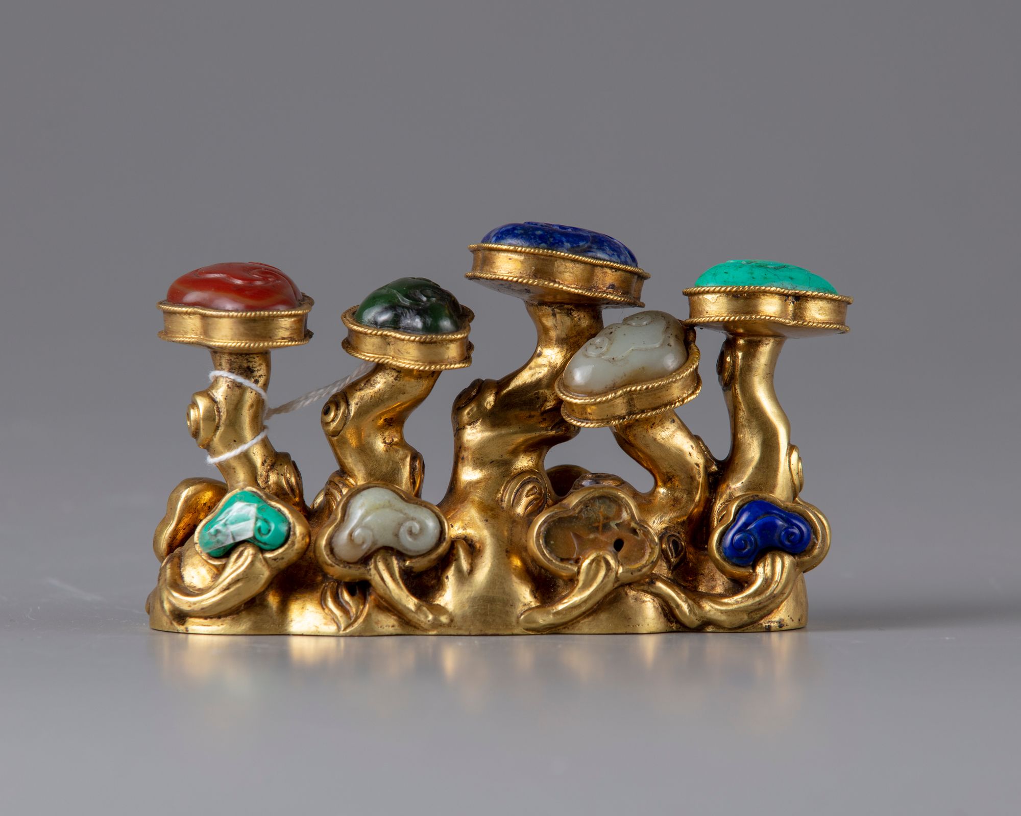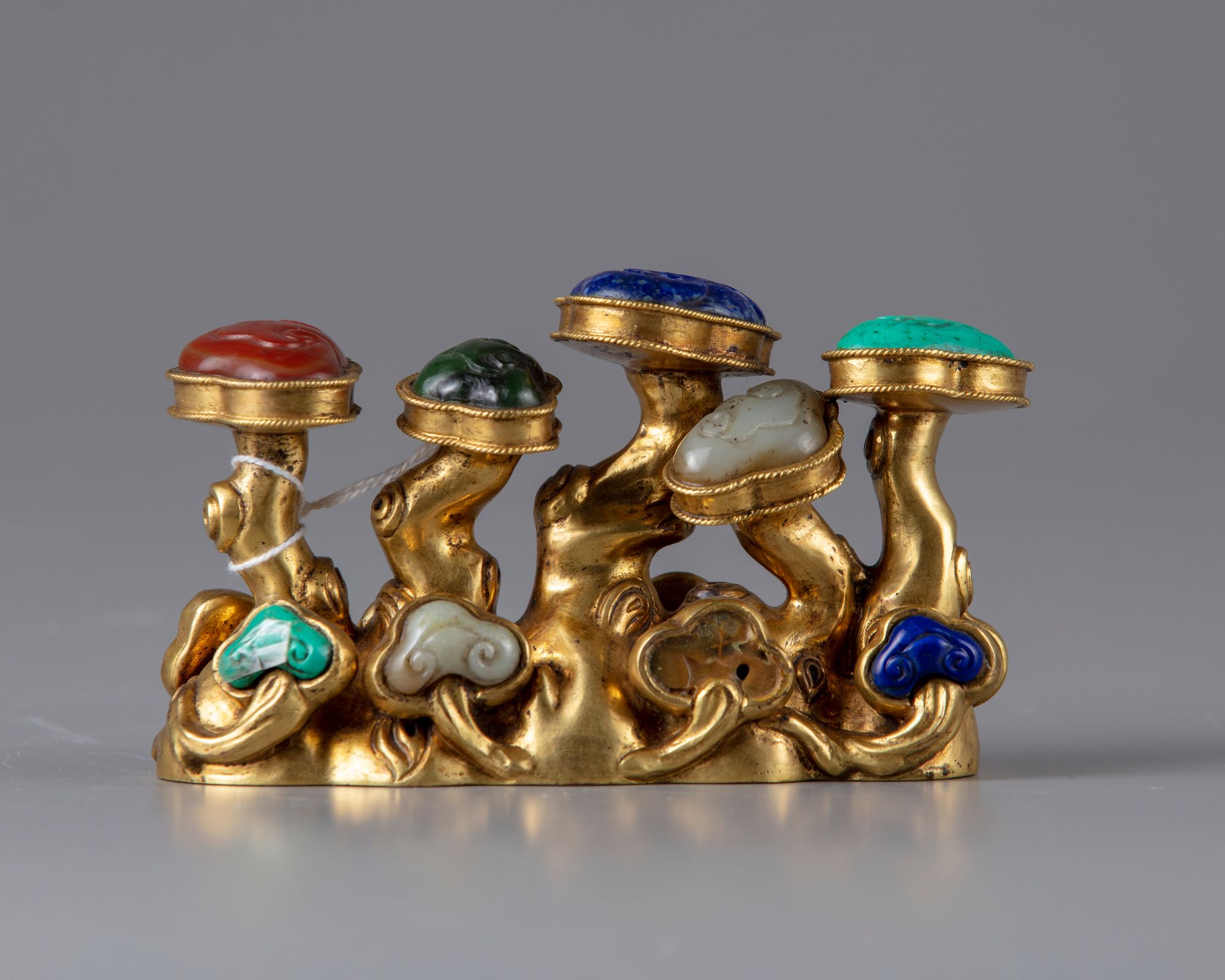 The brush rest is modelled as a group of lingzhi fungus, with the heads inlaid with various types of hard stones, including turquoise, agate, lapis lazuli and jade.