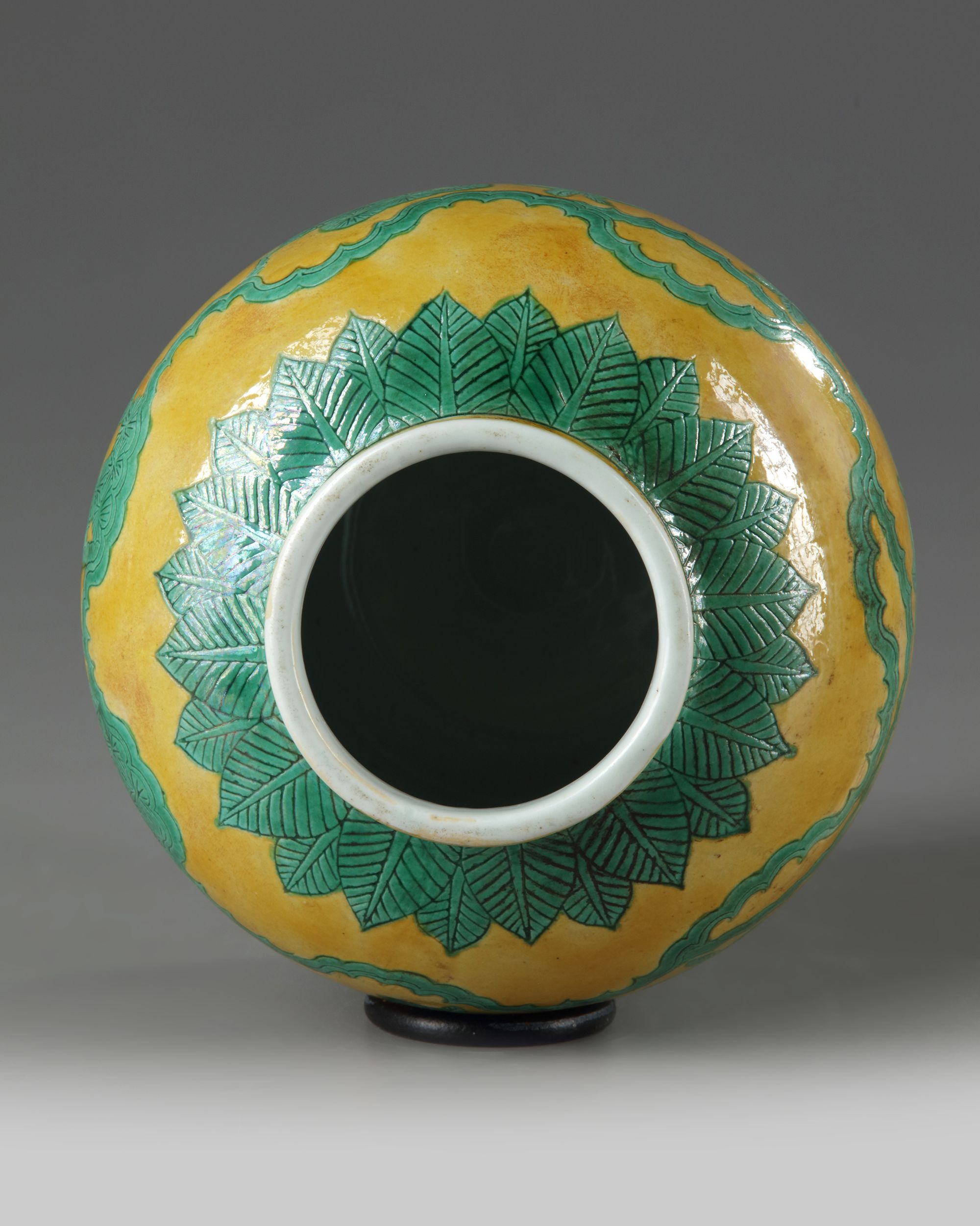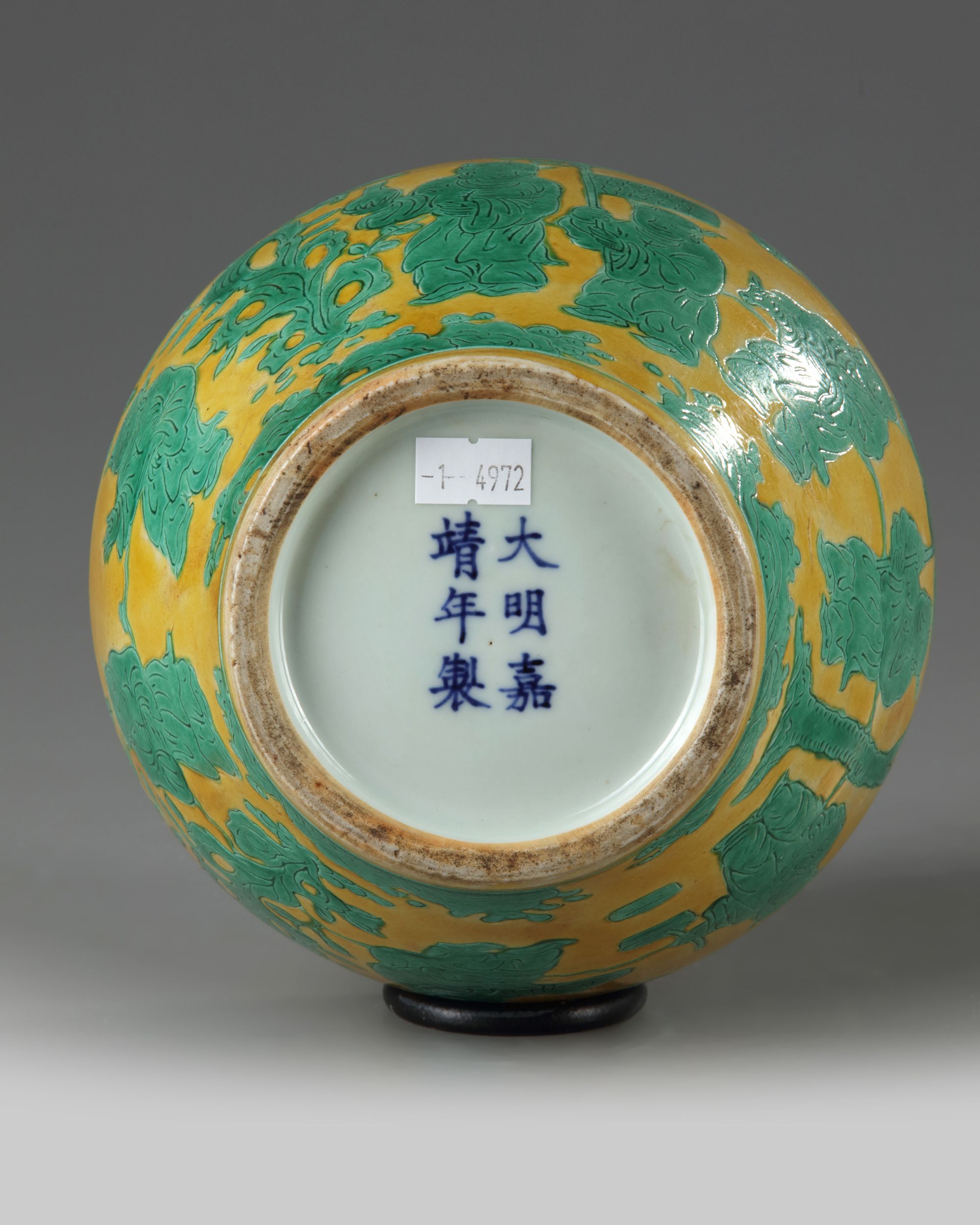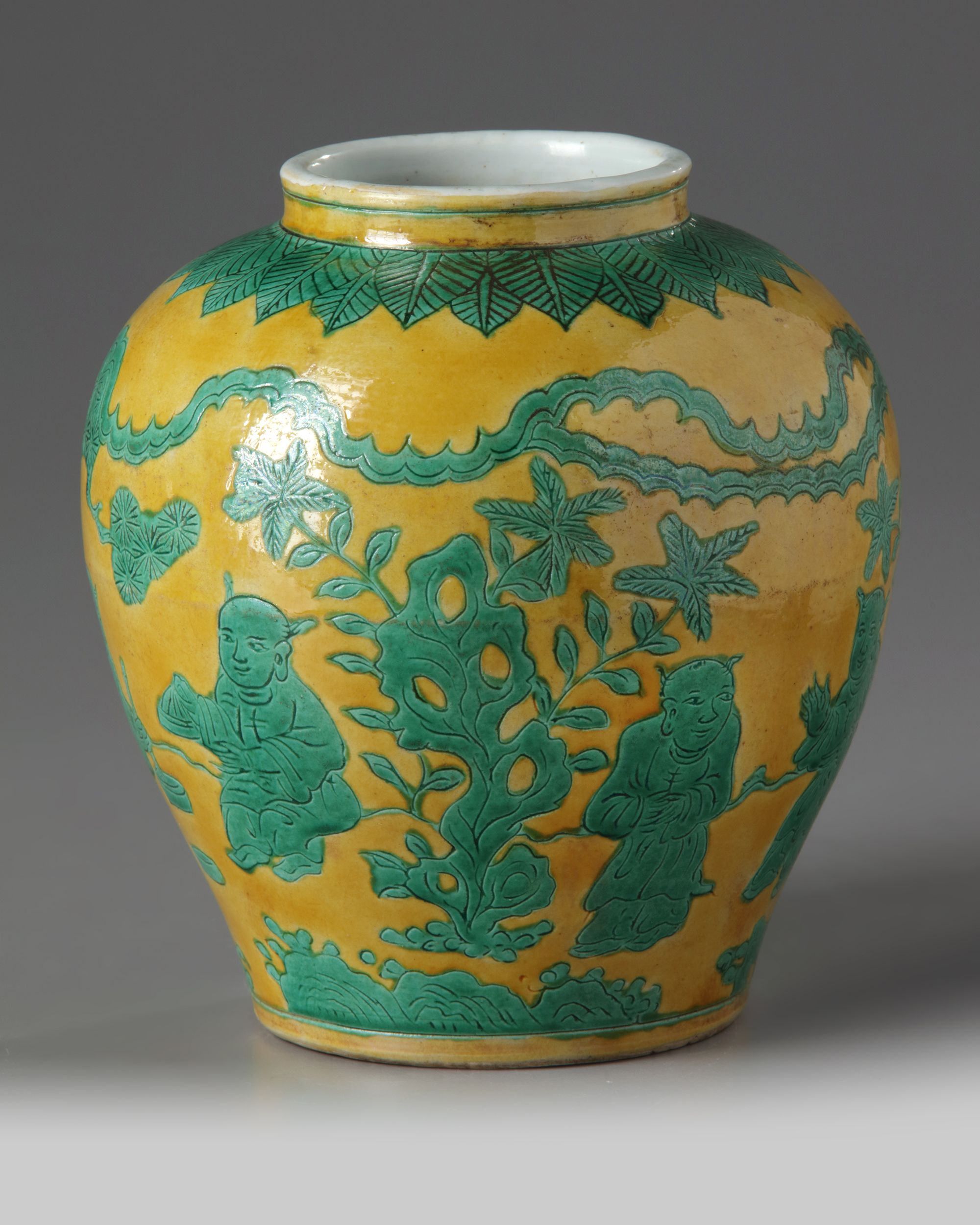 Decorated with an incised decoration of boys at play and in a procession amongst rocks and pine trees, the neck with a stiff leaf border. The white-glazed base with an apocryphal Wanli mark.