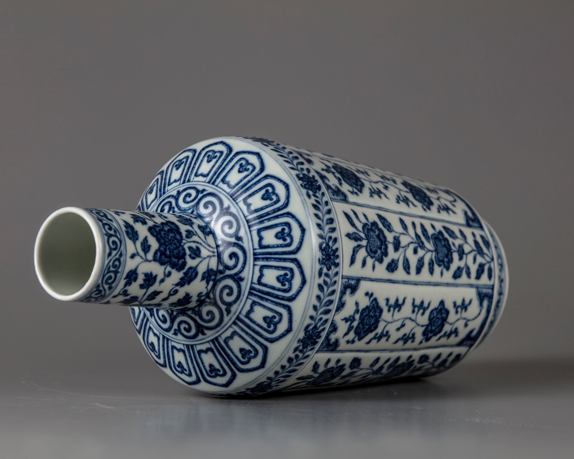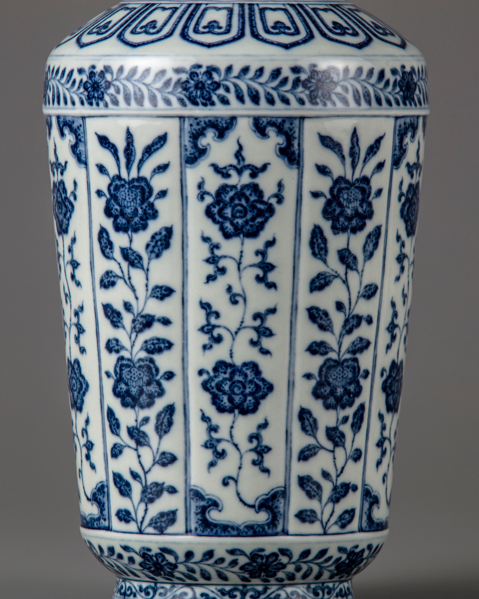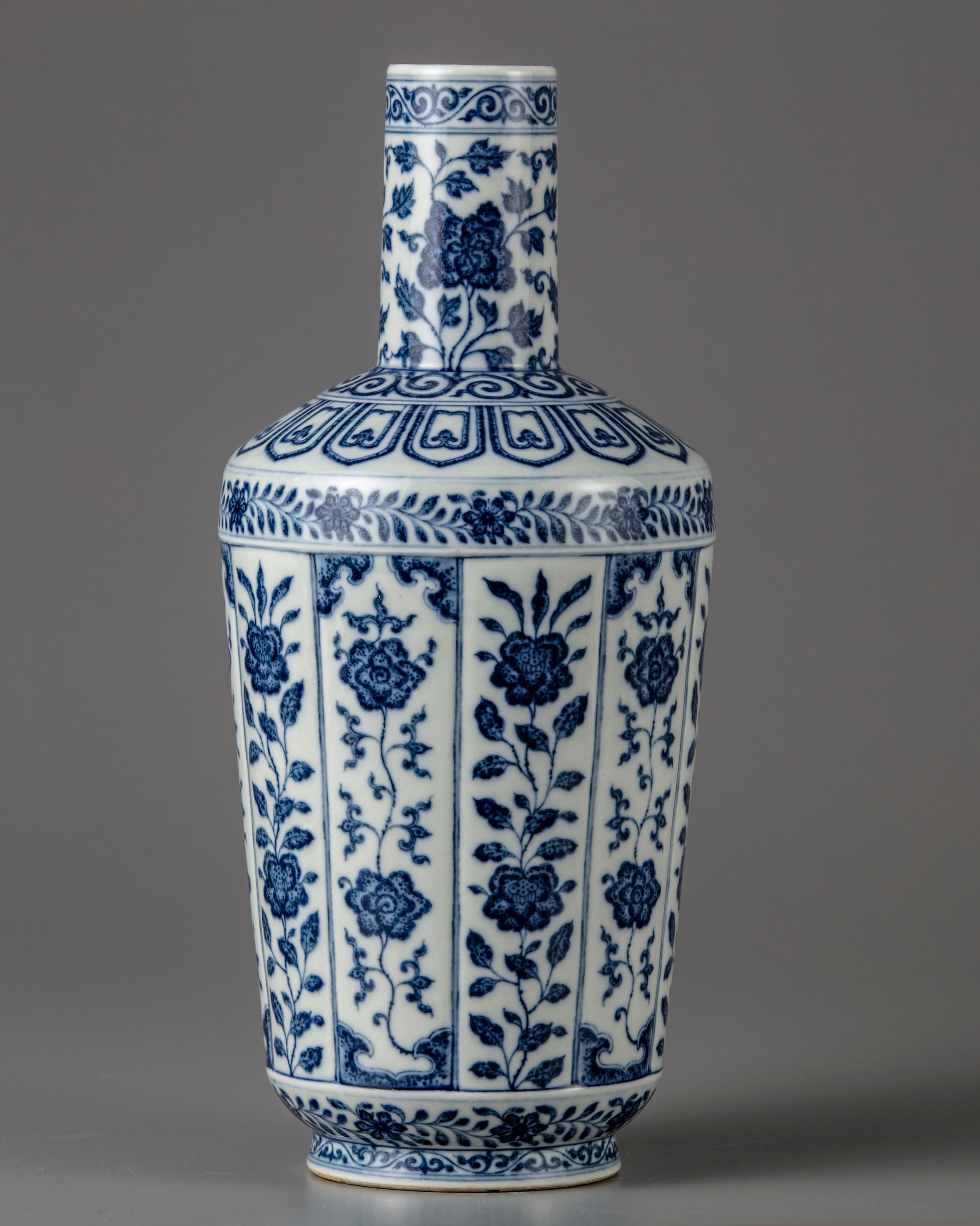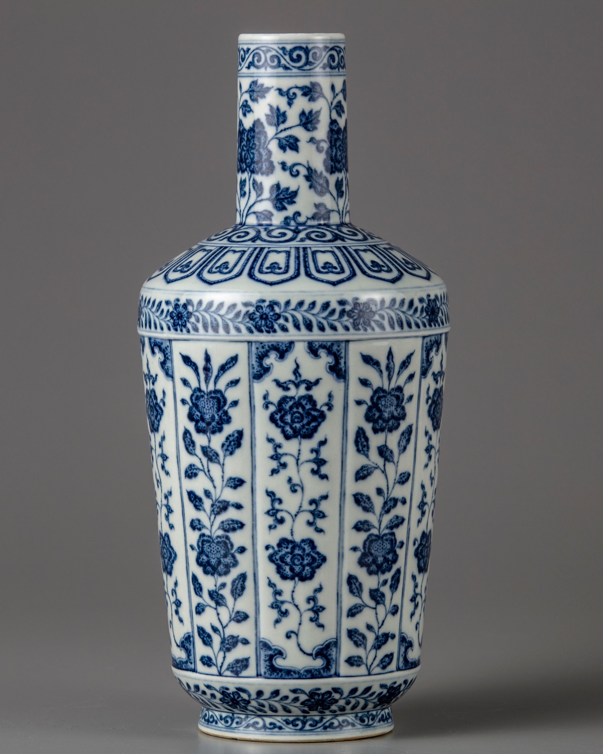 The vase is meticulously decorated with underglaze blue highlighted with stipples in imitation of the ‘heaping and piling’ effect. The slightly tapering cylindrical body is decorated with vertical panels enclosing leafy flower sprays, all between two bands of flower scrolls. The shoulder is decorated with a lappet band below a band of scrolls, and the neck is decorated with further leafy flowers below a band of leafy scrolls to the rim which is repeated on the foot.