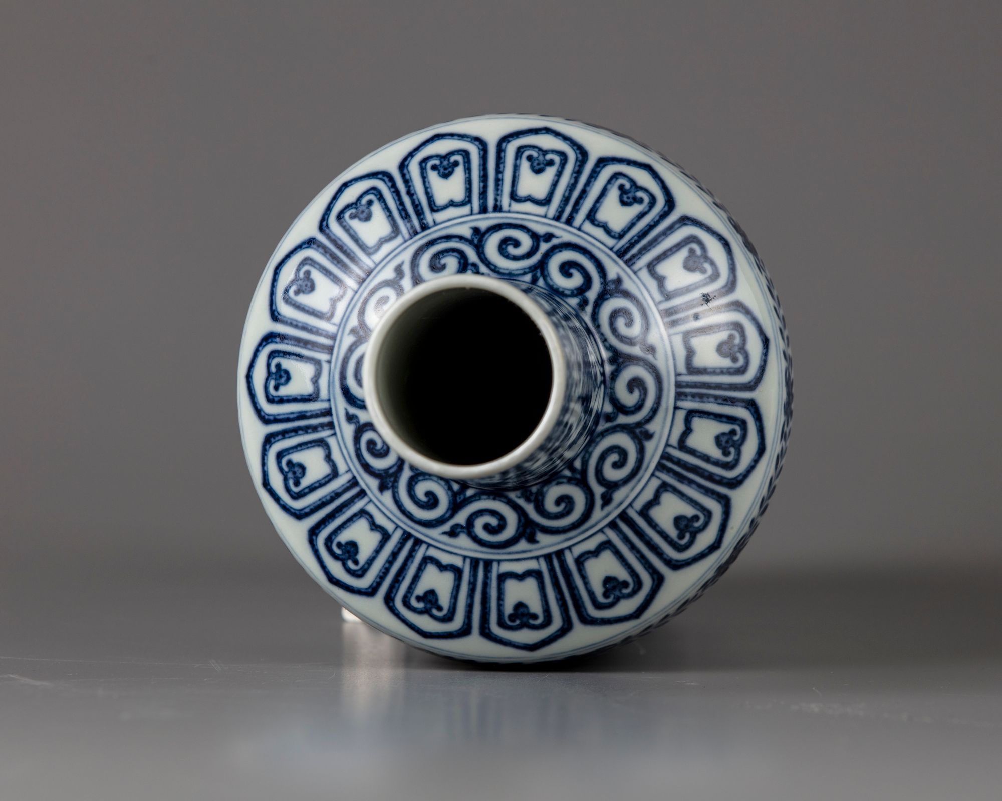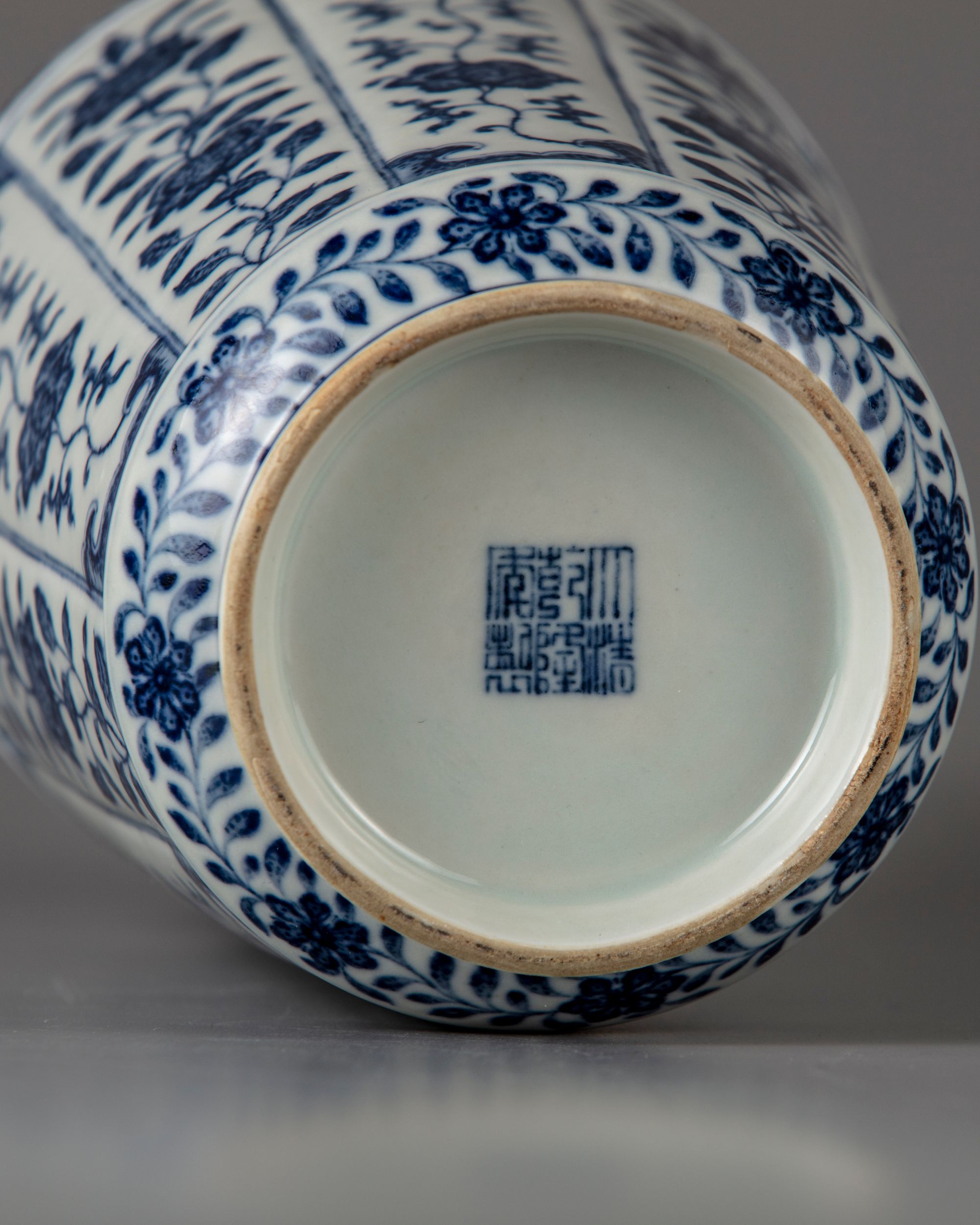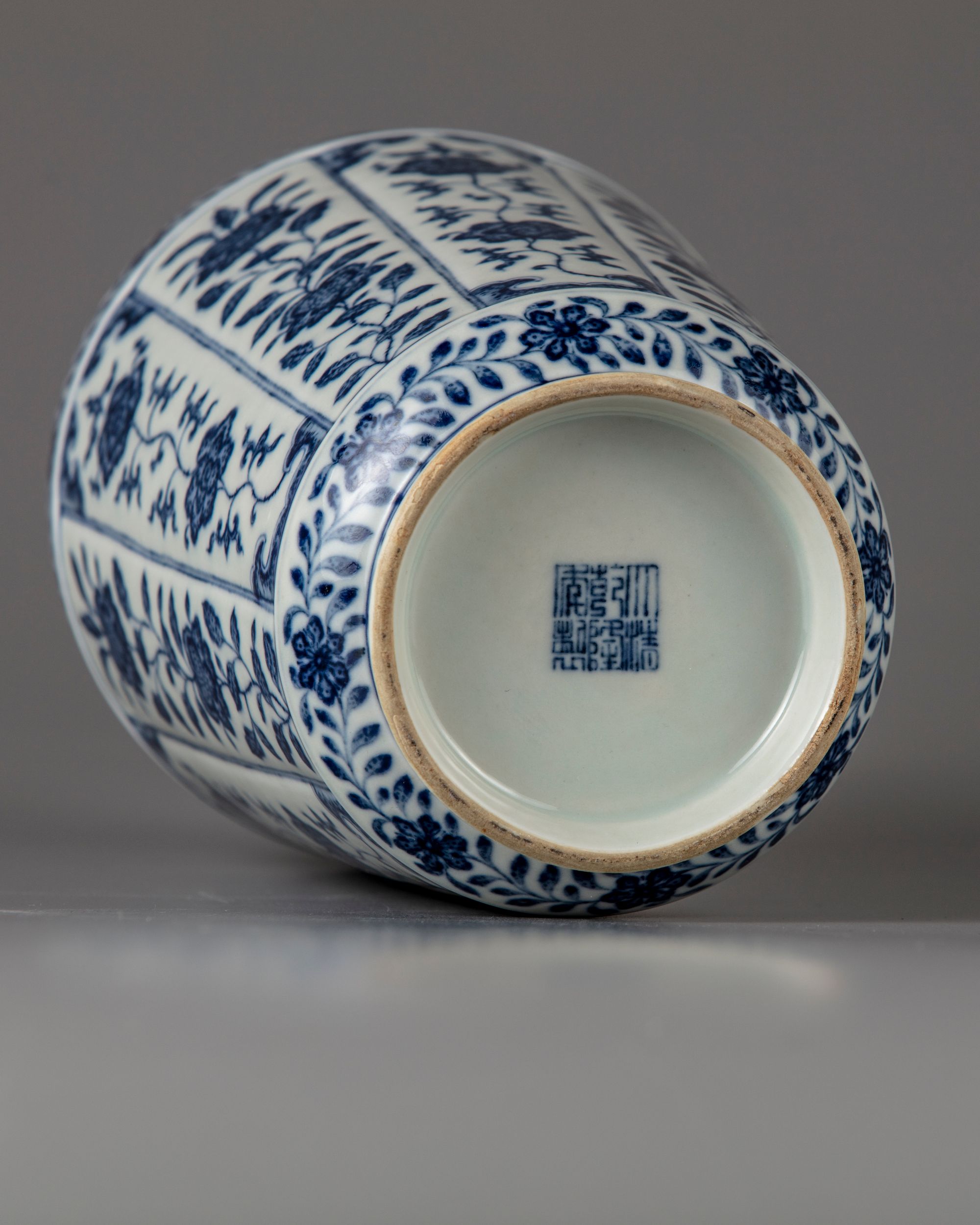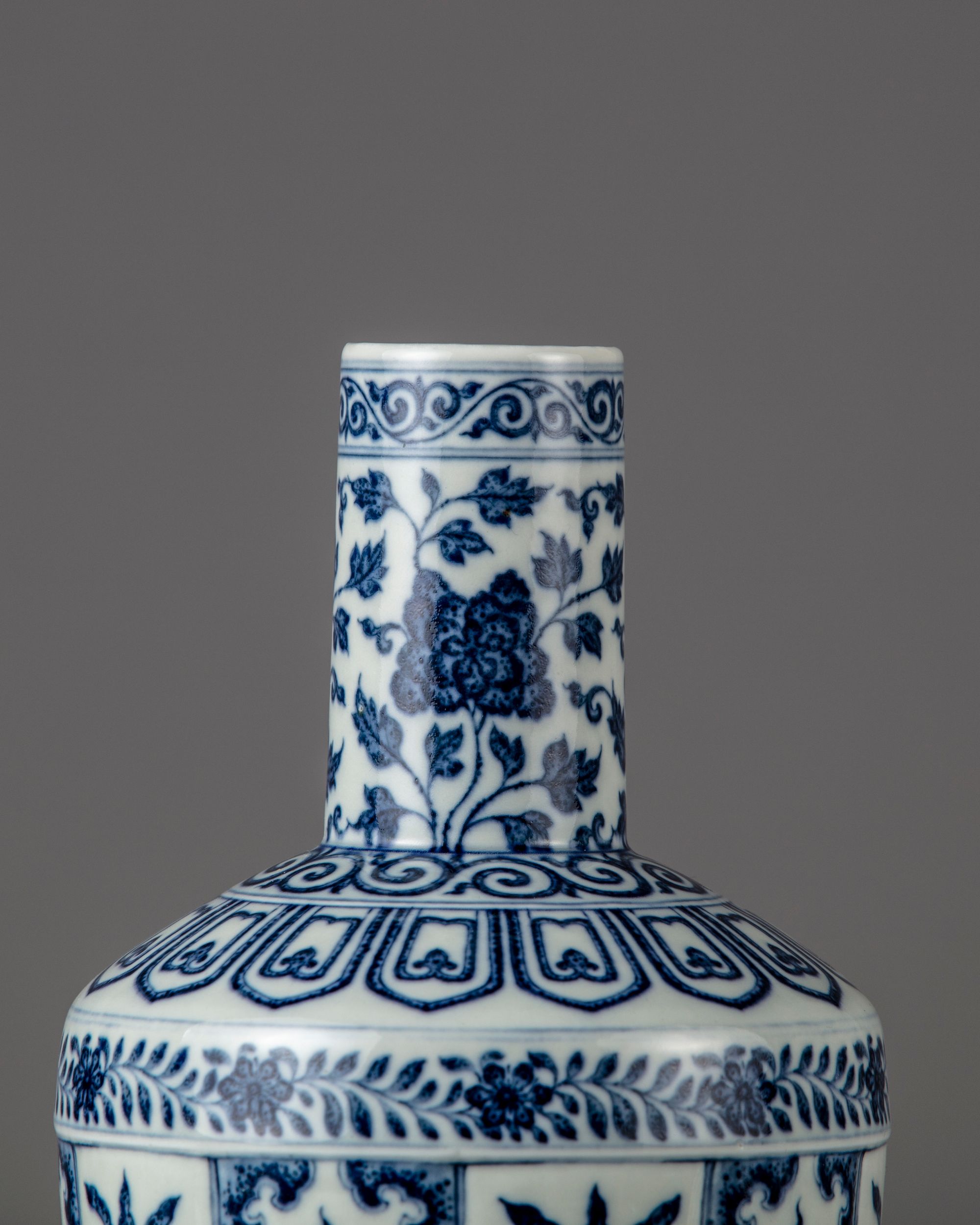 The vase is meticulously decorated with underglaze blue highlighted with stipples in imitation of the ‘heaping and piling’ effect. The slightly tapering cylindrical body is decorated with vertical panels enclosing leafy flower sprays, all between two bands of flower scrolls. The shoulder is decorated with a lappet band below a band of scrolls, and the neck is decorated with further leafy flowers below a band of leafy scrolls to the rim which is repeated on the foot.
