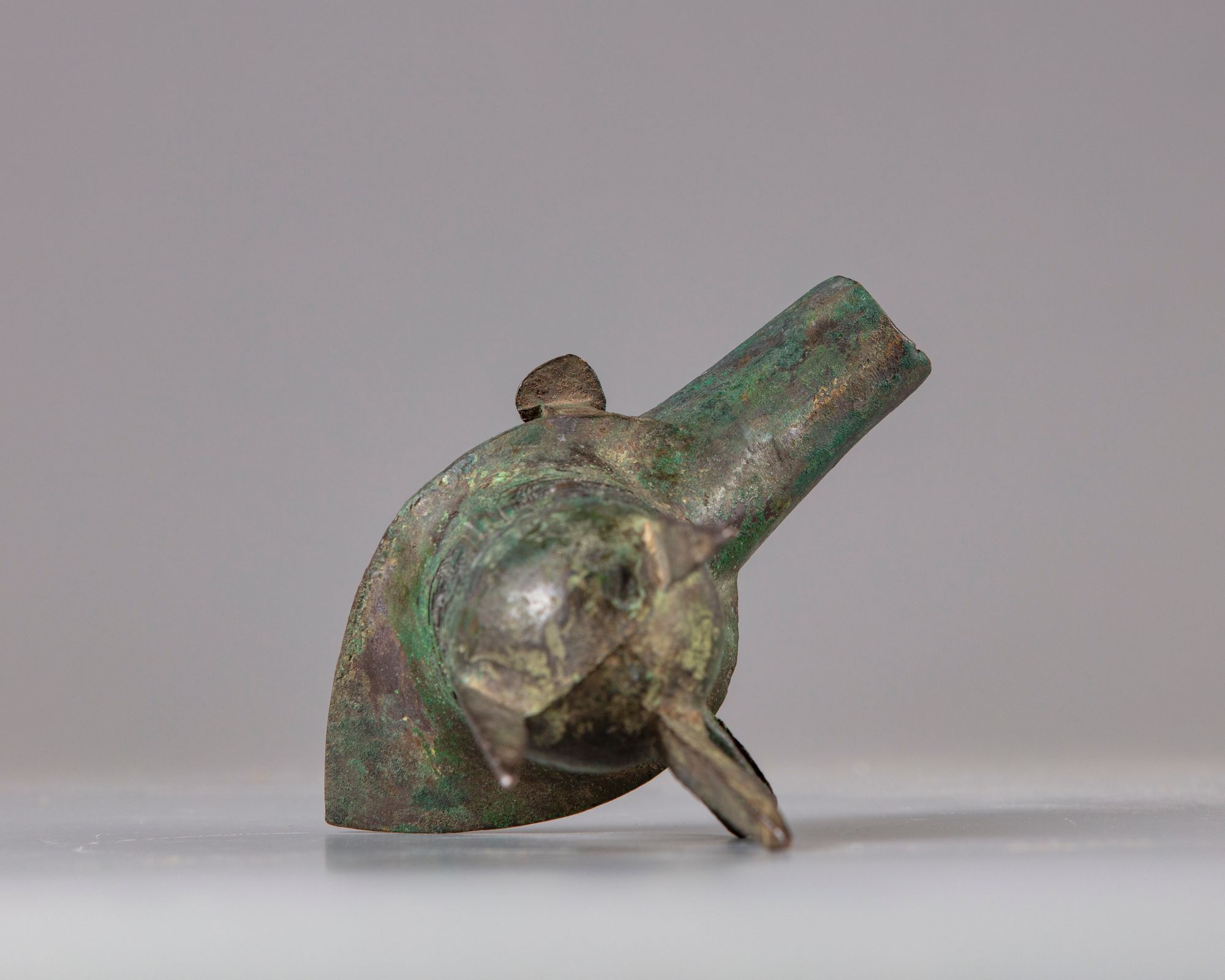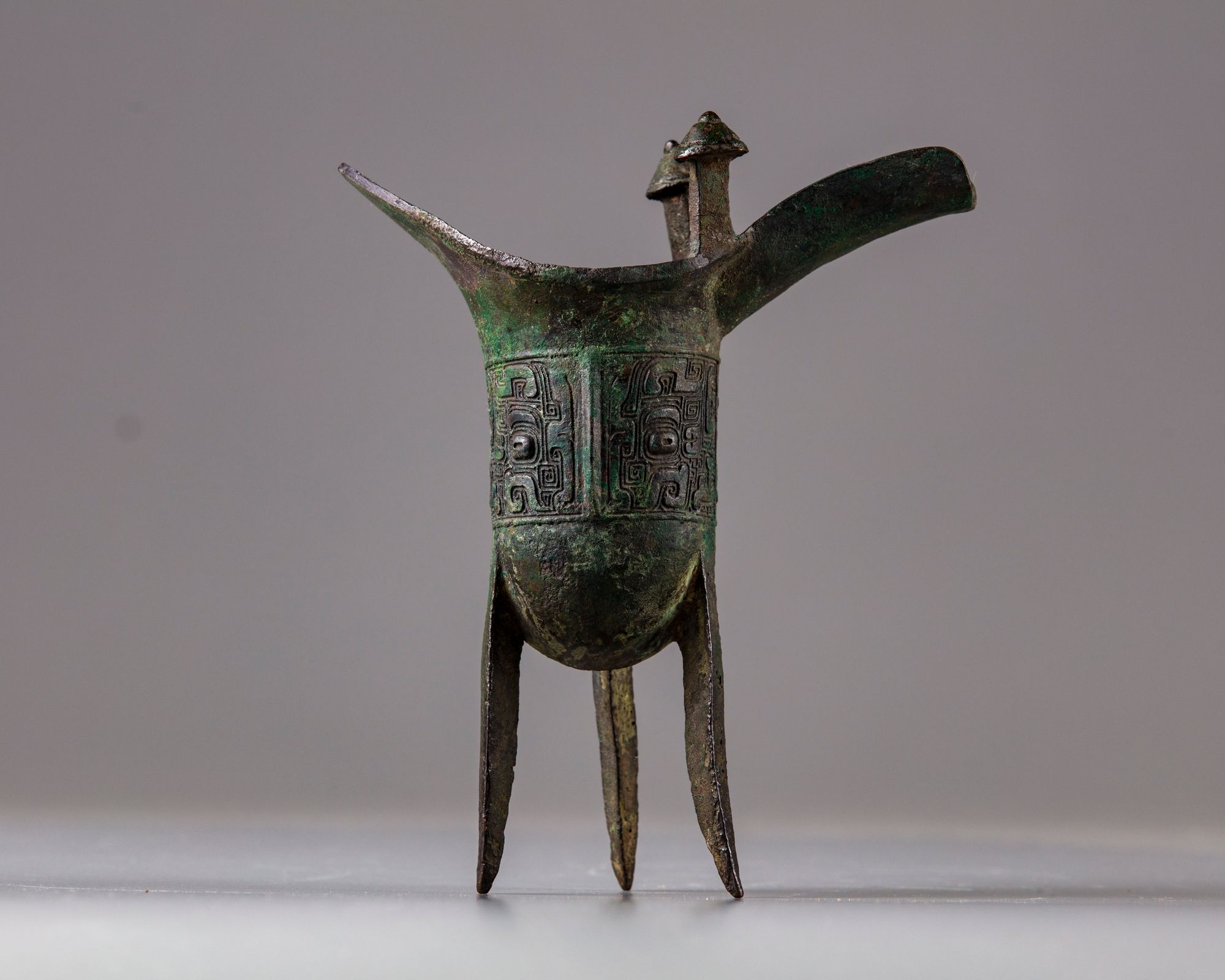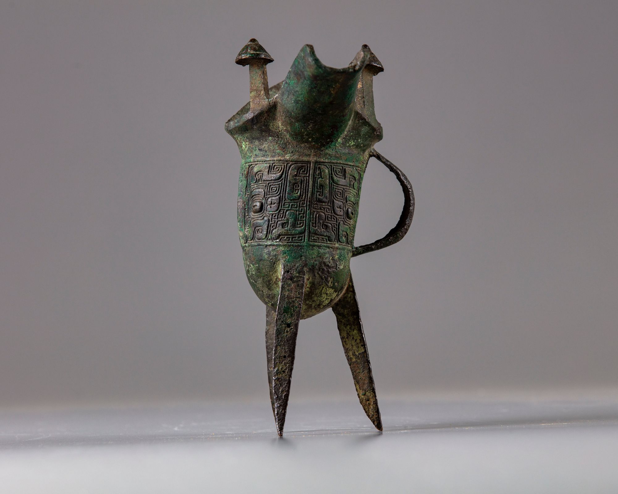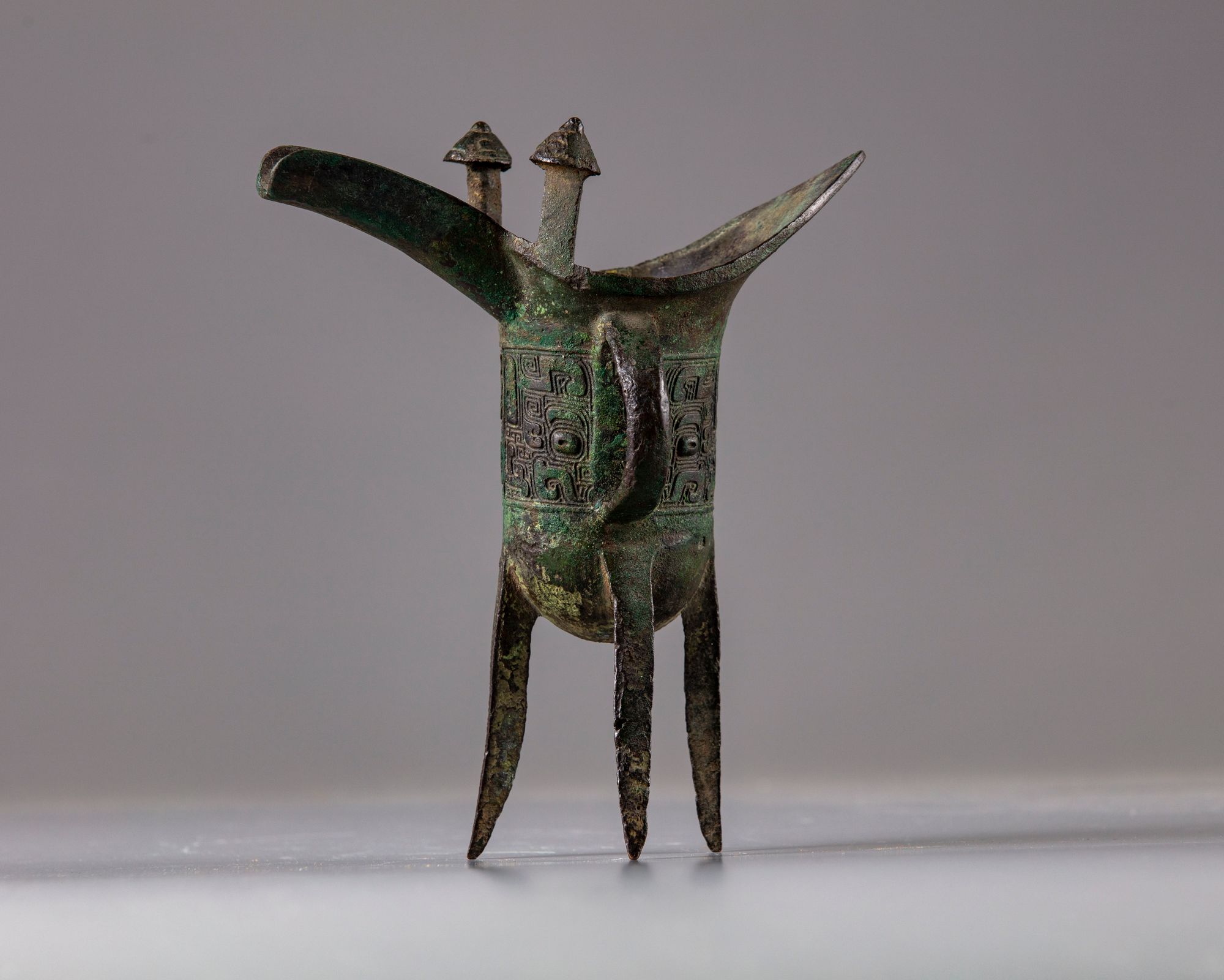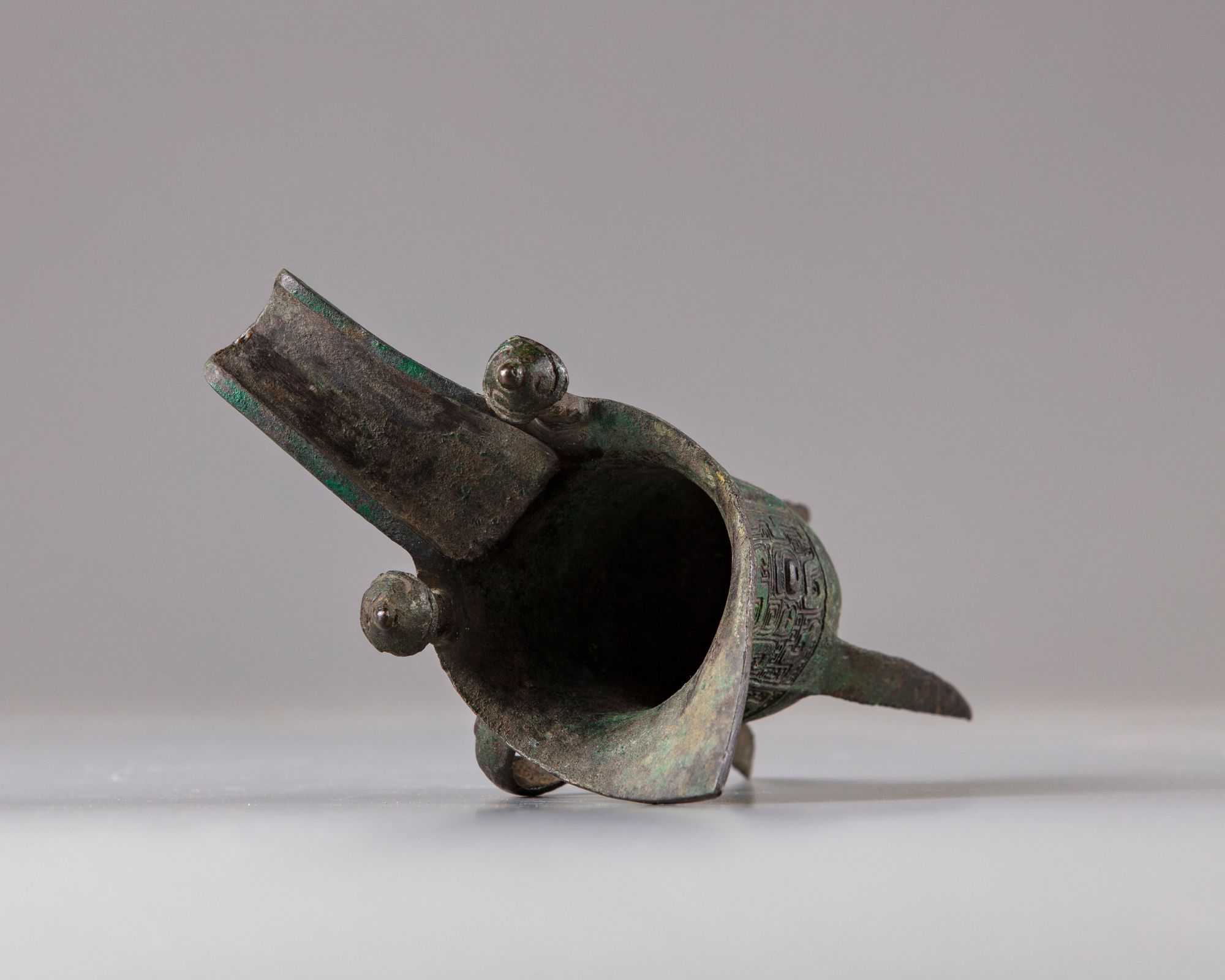 Raised on three blade-form supports, the sides cast with a band of two taotie masks reserved on a leiwen ground and separated by narrow notched flanges, one mask centered on a third flange, the other centered on the C-scroll handle issuing from a bovine mask, with a pair of capped posts rising from the rim, with mottled green patina