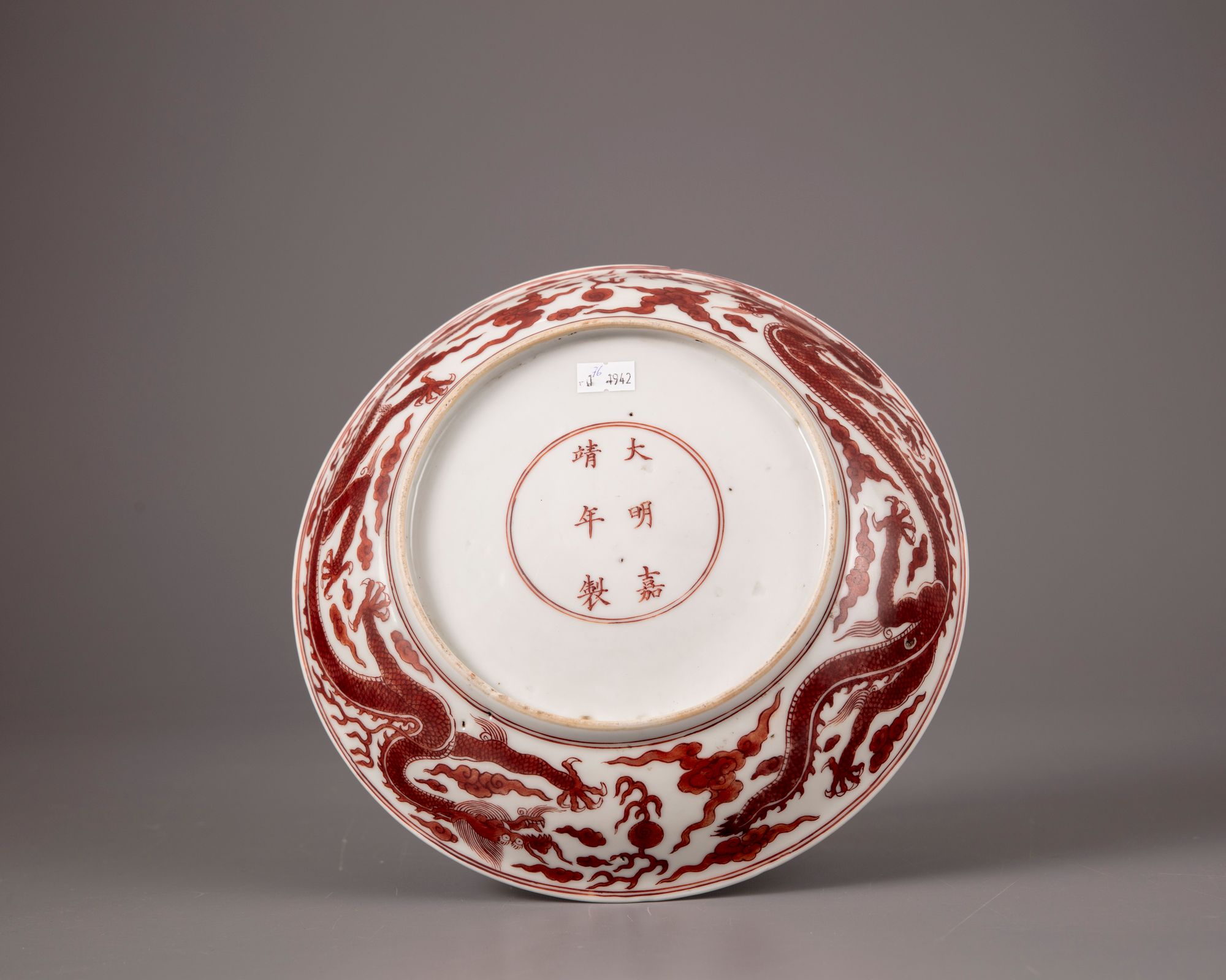 The dish is decorated to the centre with a dragon chasing the flaming pearl amongst cloud scrolls. The cavetto is decorated with further dragons, and the exterior is similarly decorated. The base with an apocryphal Jiajing mark.