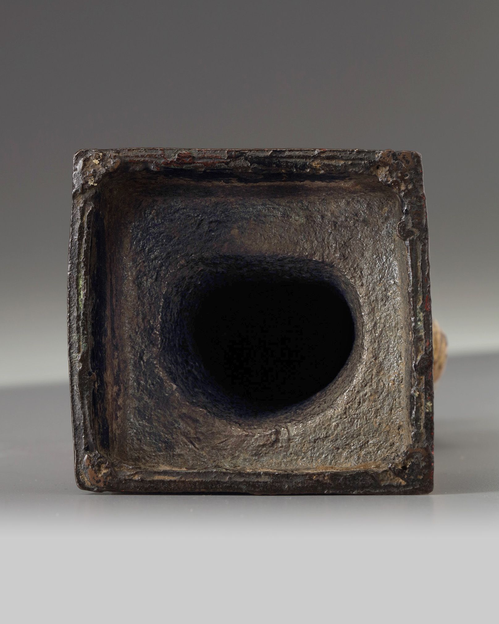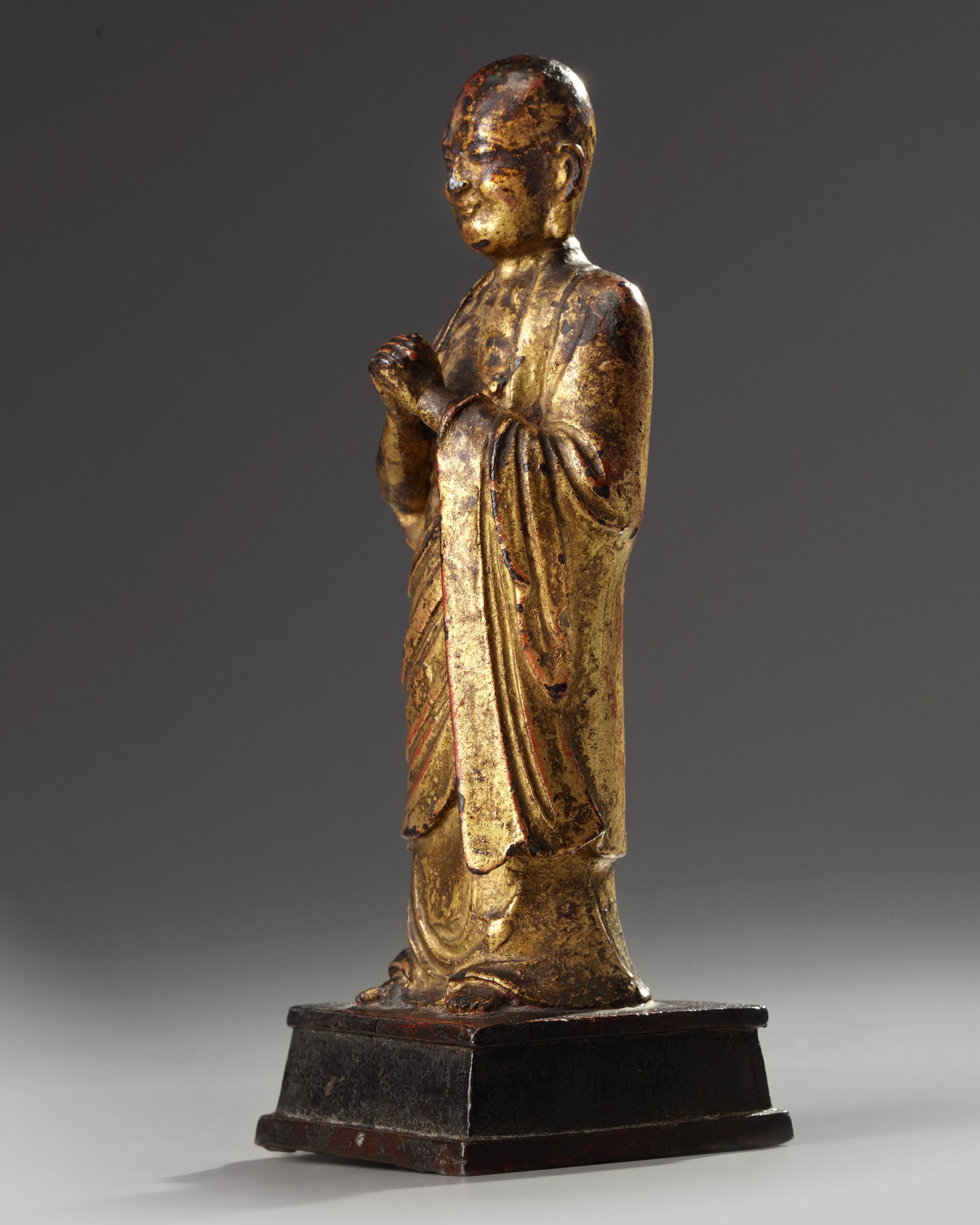 The figure is carved with a serene expression on his face and wearing long robes which are open at the chest, and his hands held together in front of him. He stands on a square plinth base.