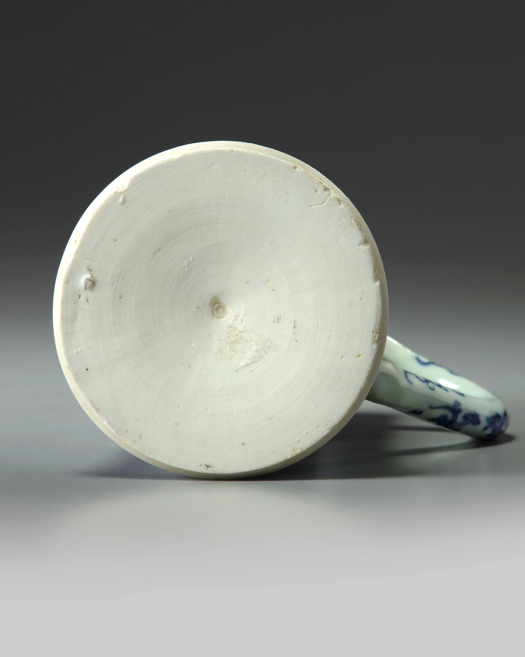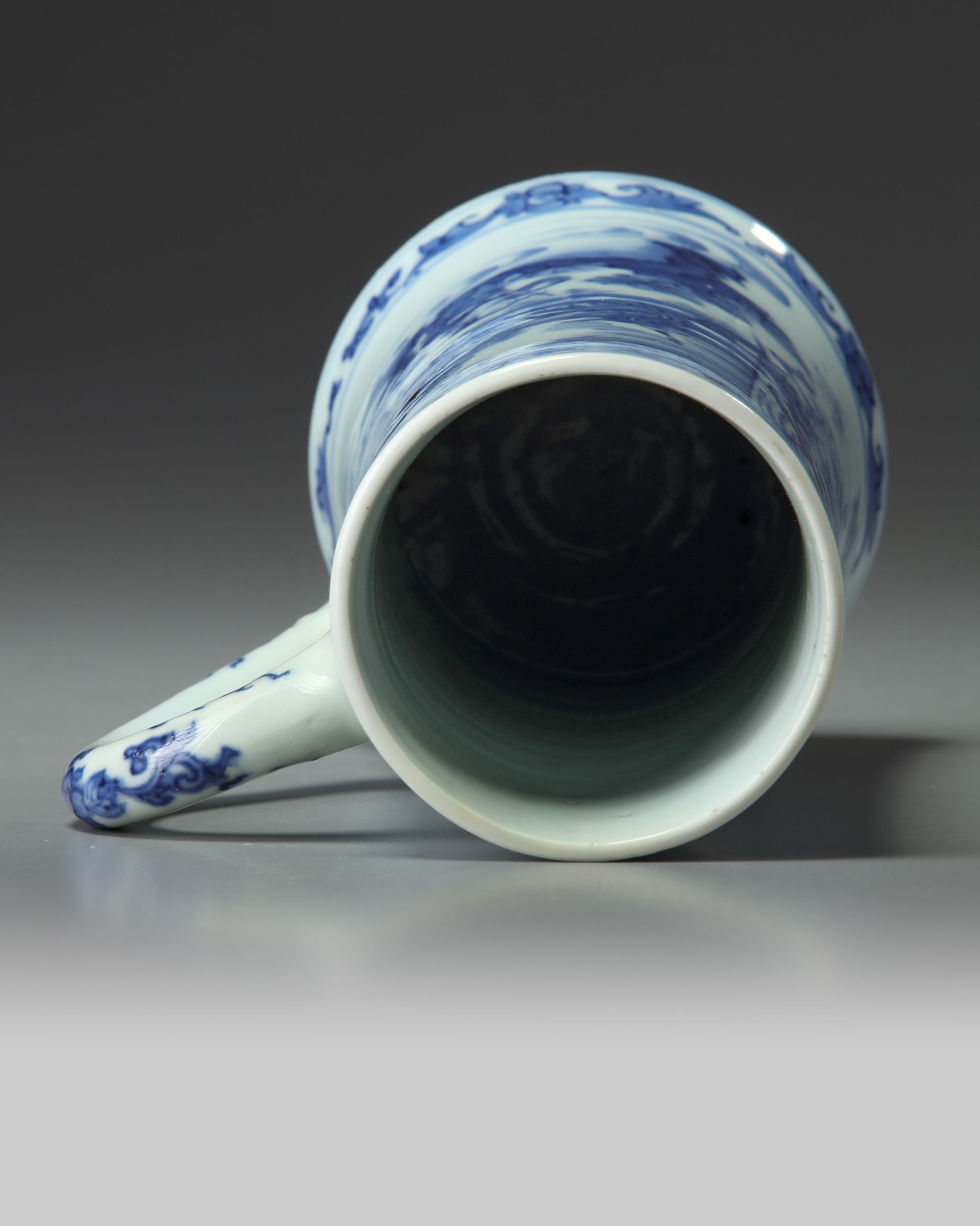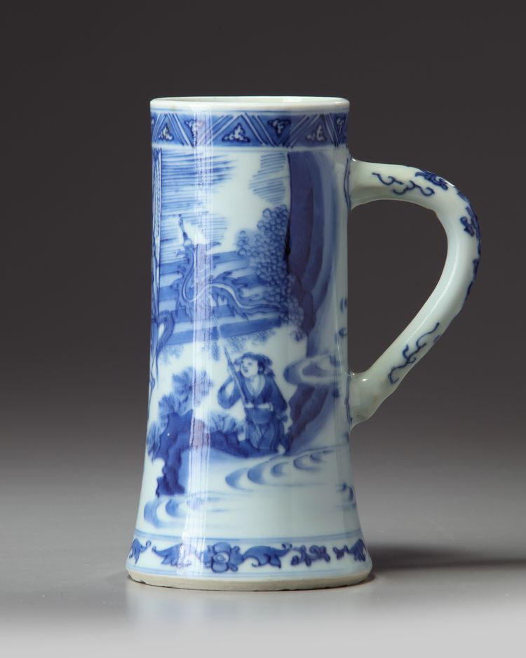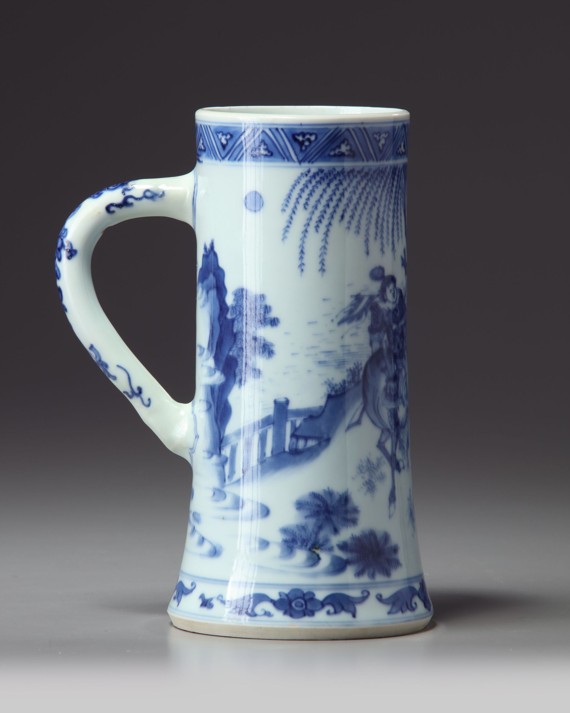 Of gently tapering form with a soldier on horseback with an attendant bearing a pennant in front a willow tree in a rock strewn misty landscape, the rim with triangular border and the foot with arabesque flower sprays, the handle with a further flower spray.