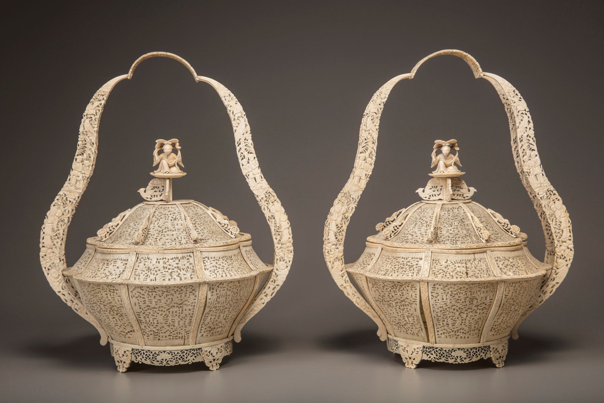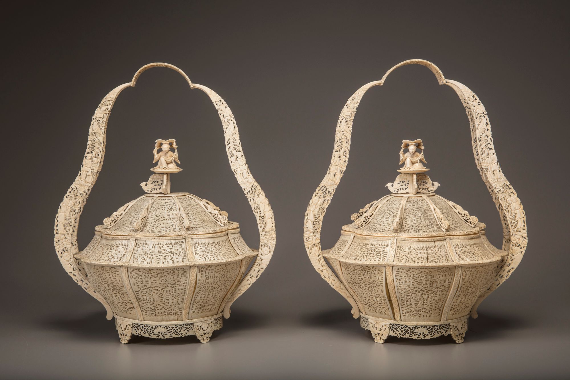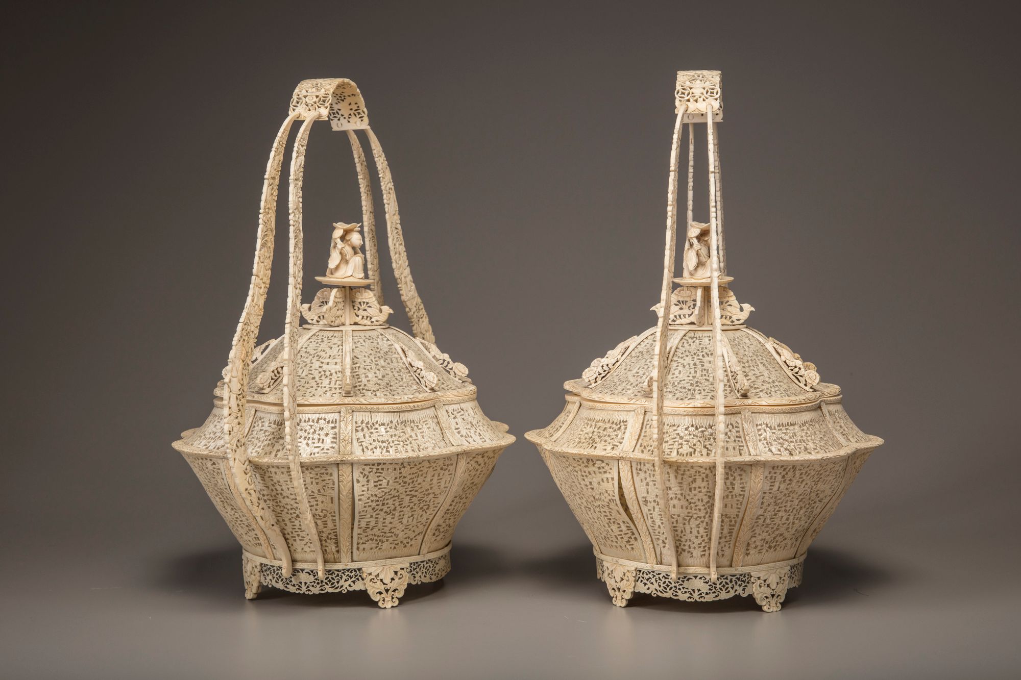 Each basket is of foliate form, with each panel delicately pierced with figures amongst pavilions separated by carved floral bands at the shoulders. Each stands on four floral feet attached by openwork peony and foliate friezes. The upright handle is carved with figures amongst flowers and birds, the apex is carved with bats and pierced cash symbols. The covers are similary decorated, the panels are each separated by bird and flower flanges, and are surmounted by a lady and lotus finial on a platform supported by four bird and flower spandrels. The panels of the interior of the basket are carved with peonies.