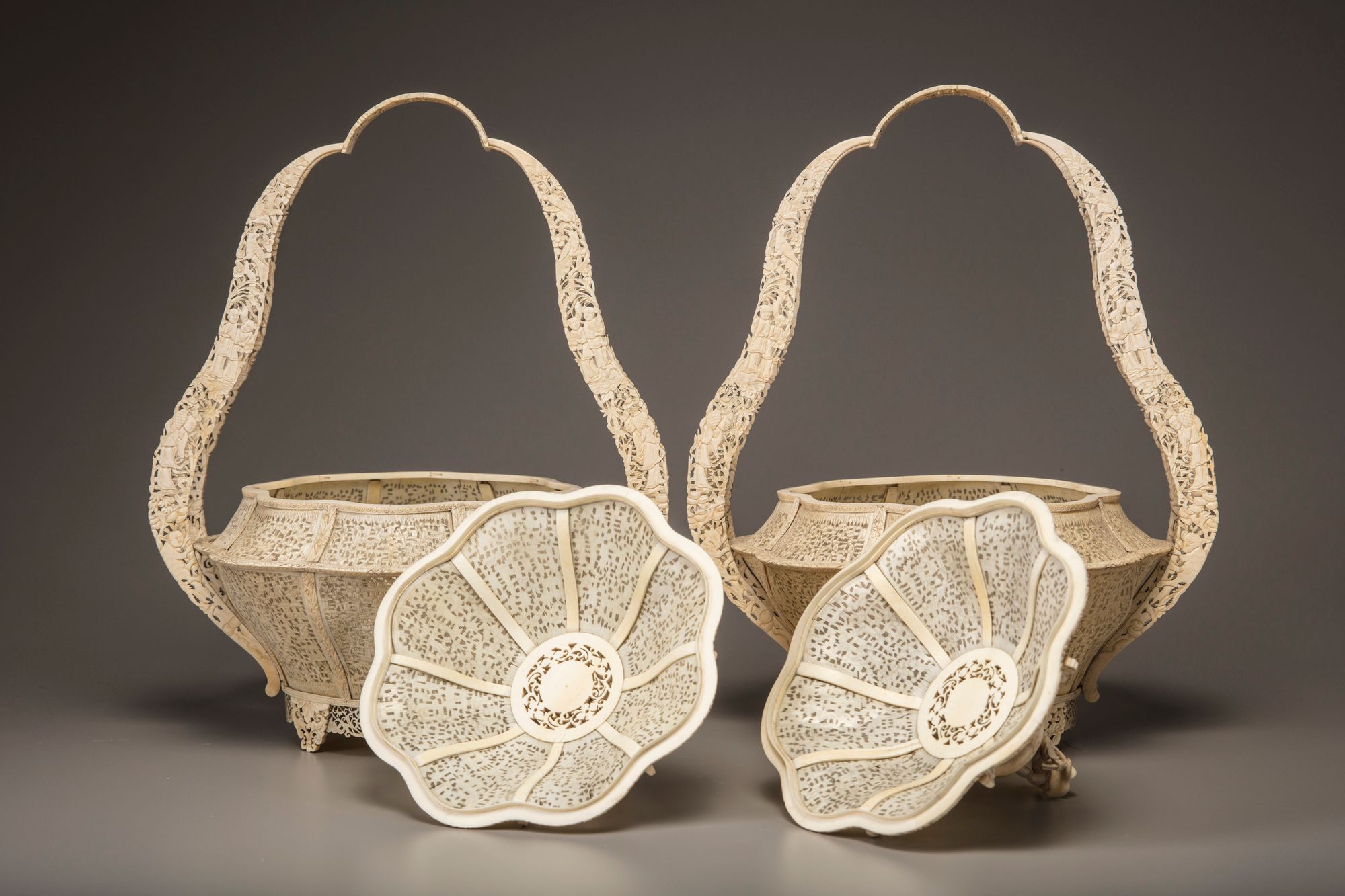 Condition: one basket with a bird and flower sprandrel reinforced with glue; the other basket with one loose handle, two bird and flower spandrels missing, a small area of restoration to the reverse of the lady (approx. 1 cm.); both baskets with slight loosening of the panels; chips and fine cracks to the ivory consistent with age.