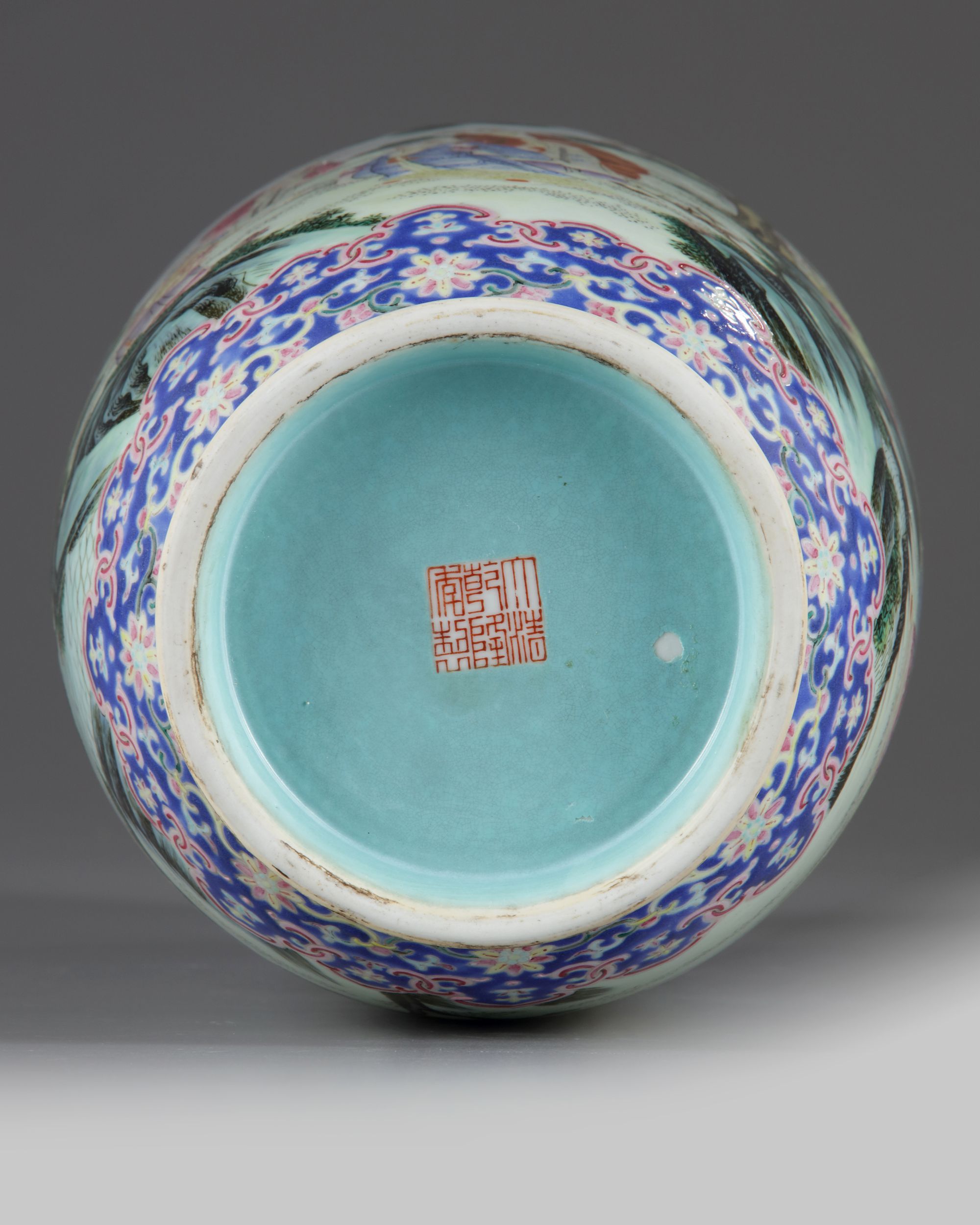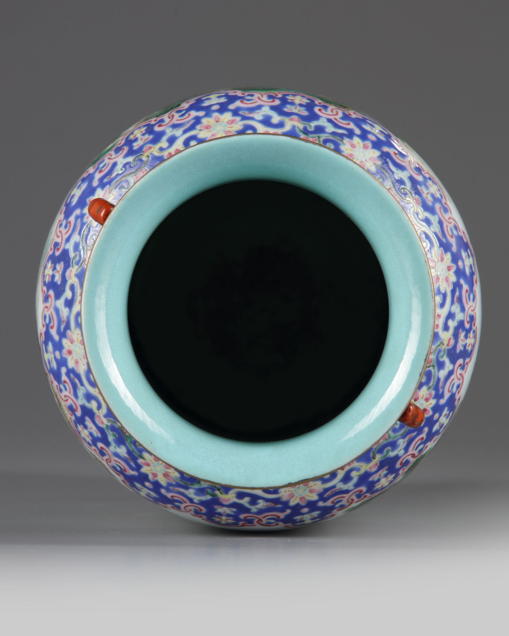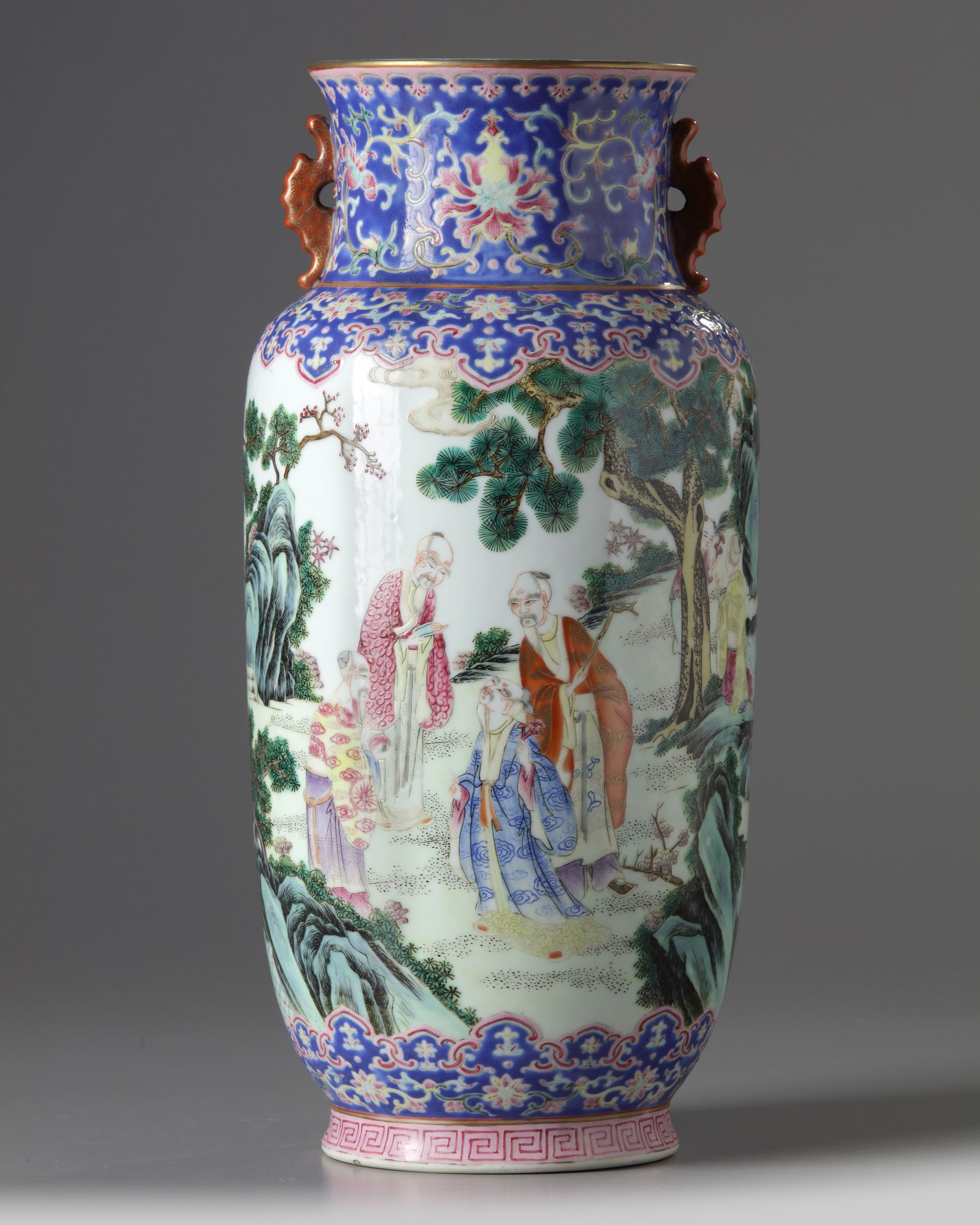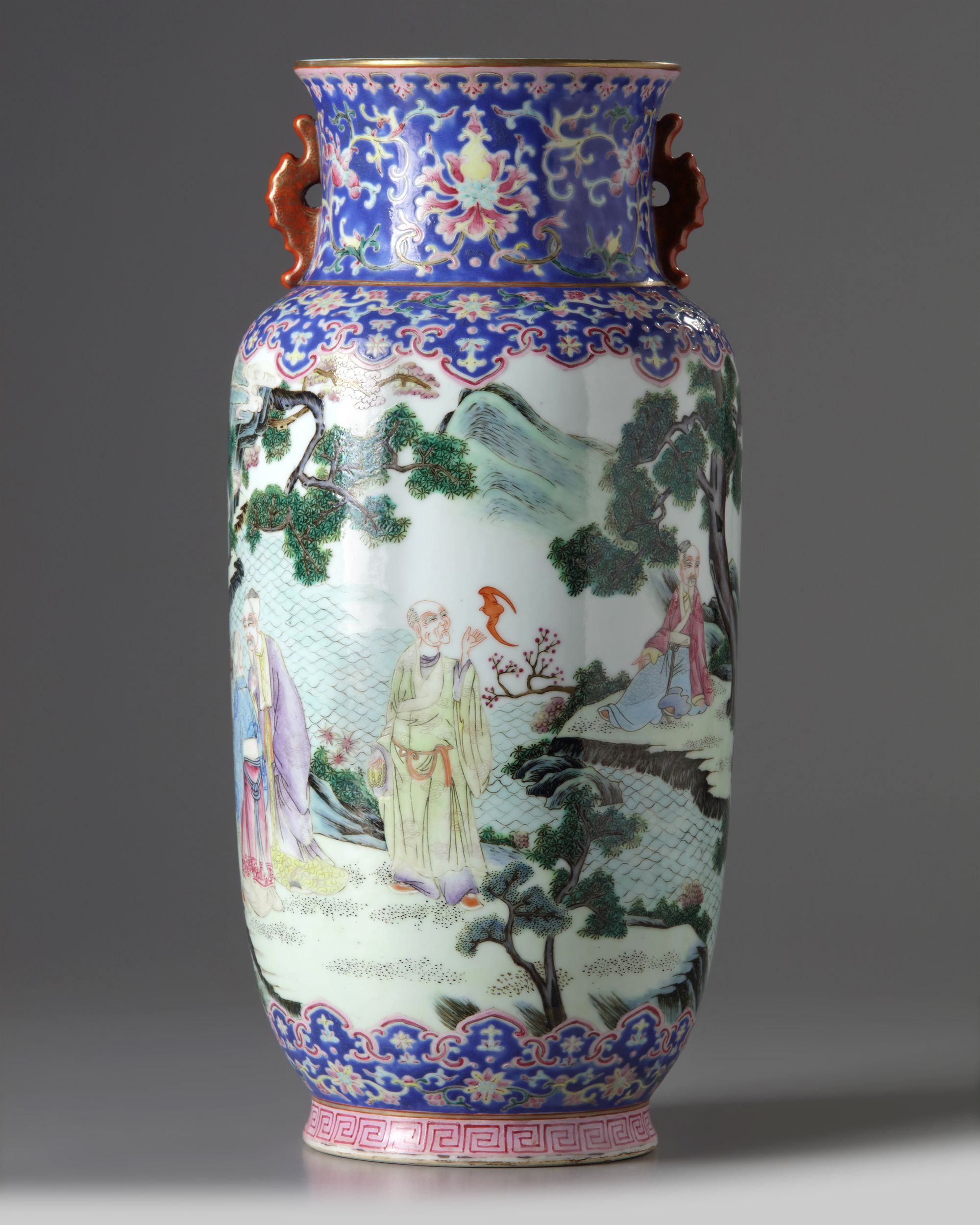The central section of the body is decorated in the round with nine scholars in a mountainous river landscape, the neck is decorated with two iron red and gilt bat-shaped handles and lotus scrolls on a blue ground. The base is enamelled turquoise and bears an apocryphal Qianlong mark.