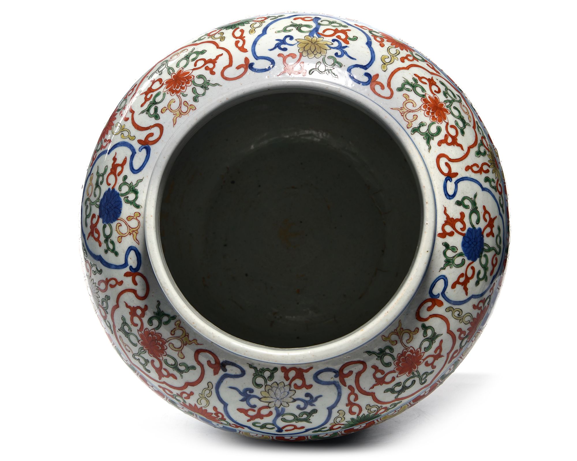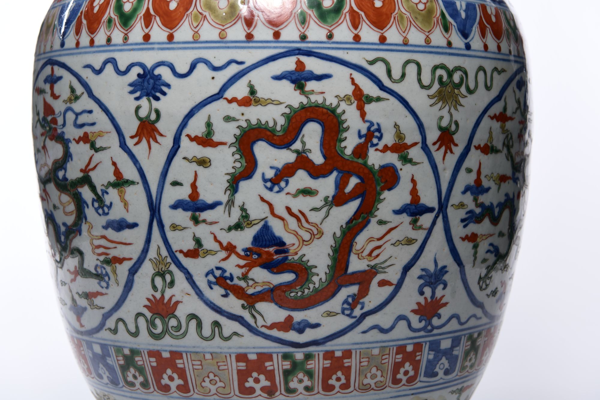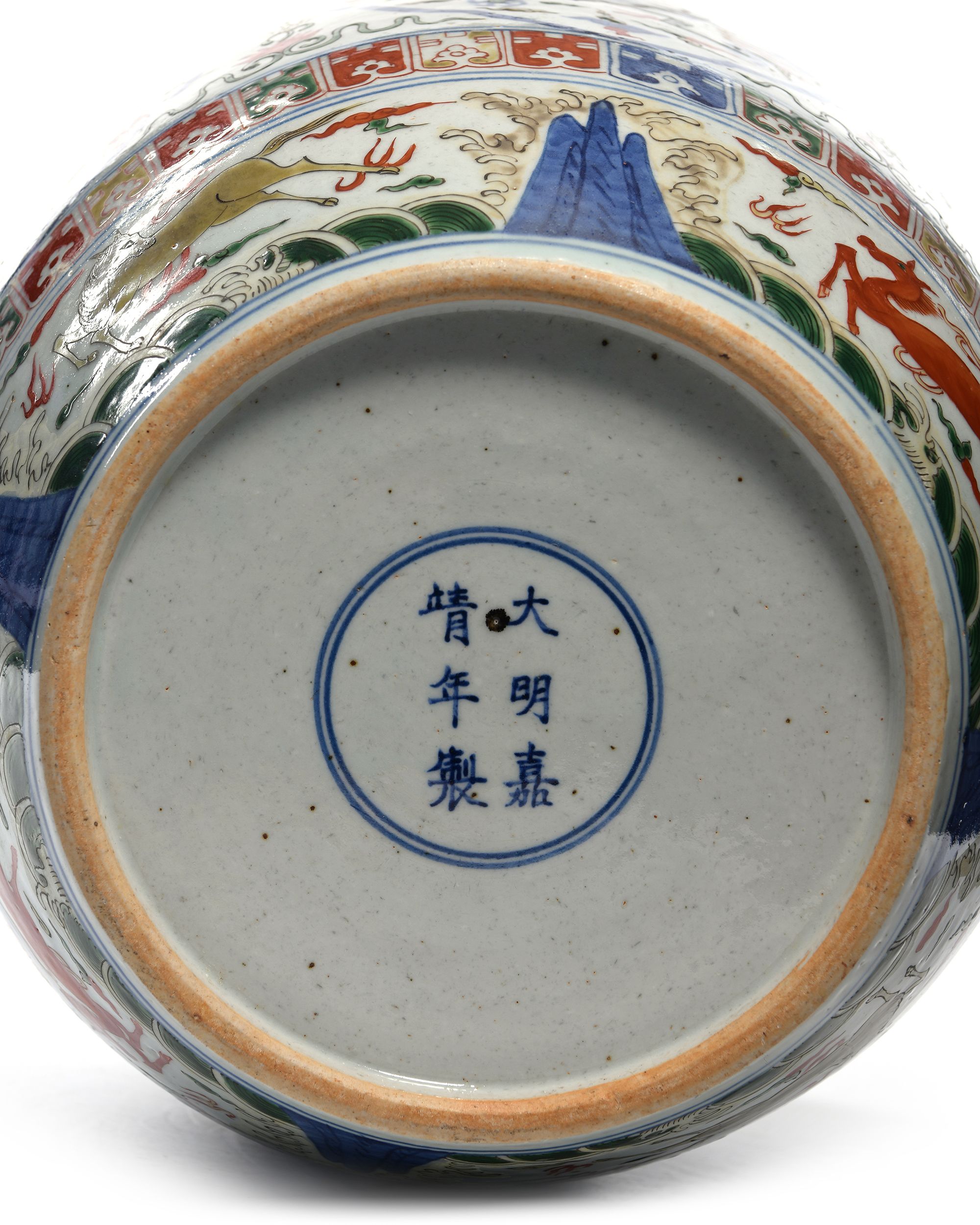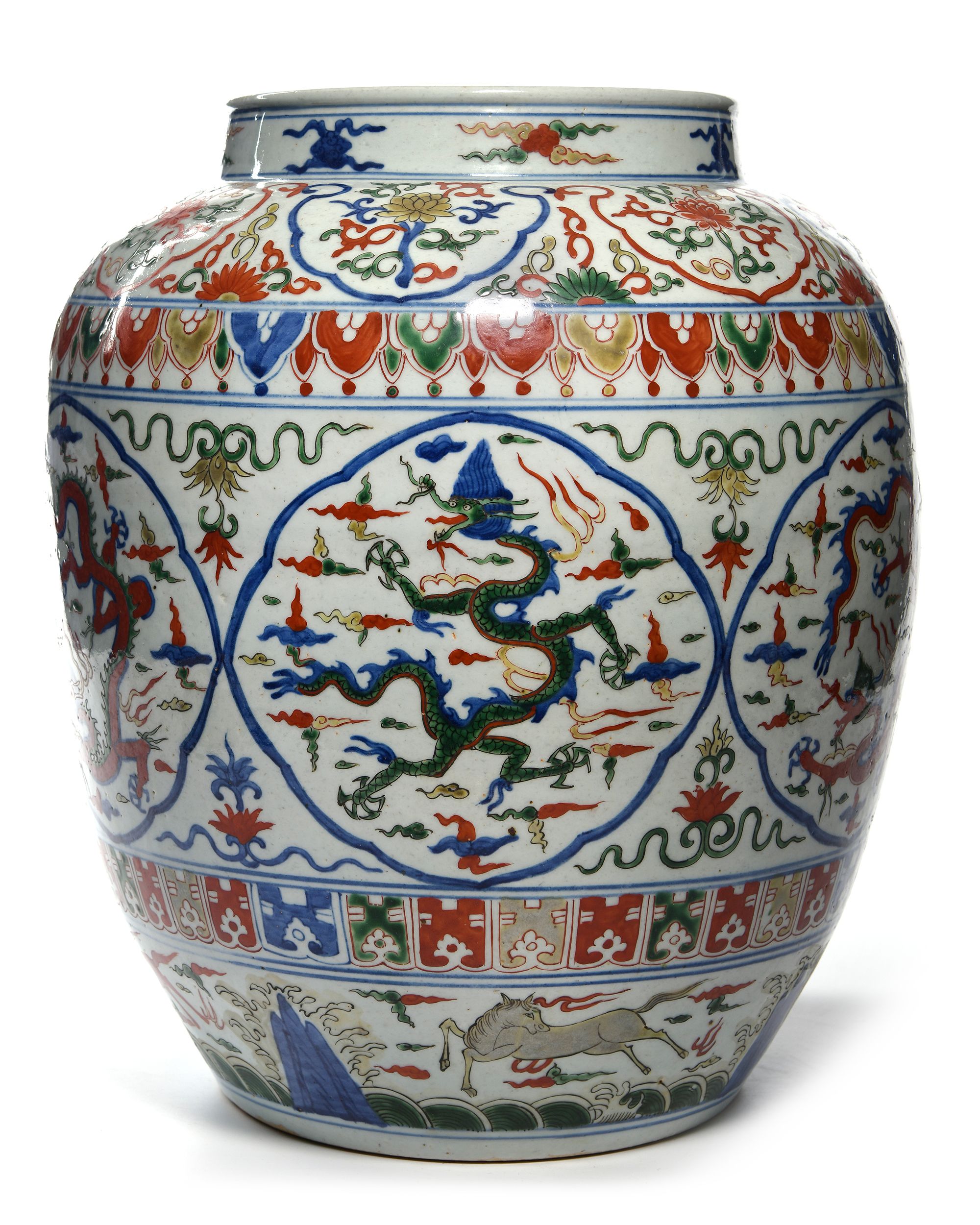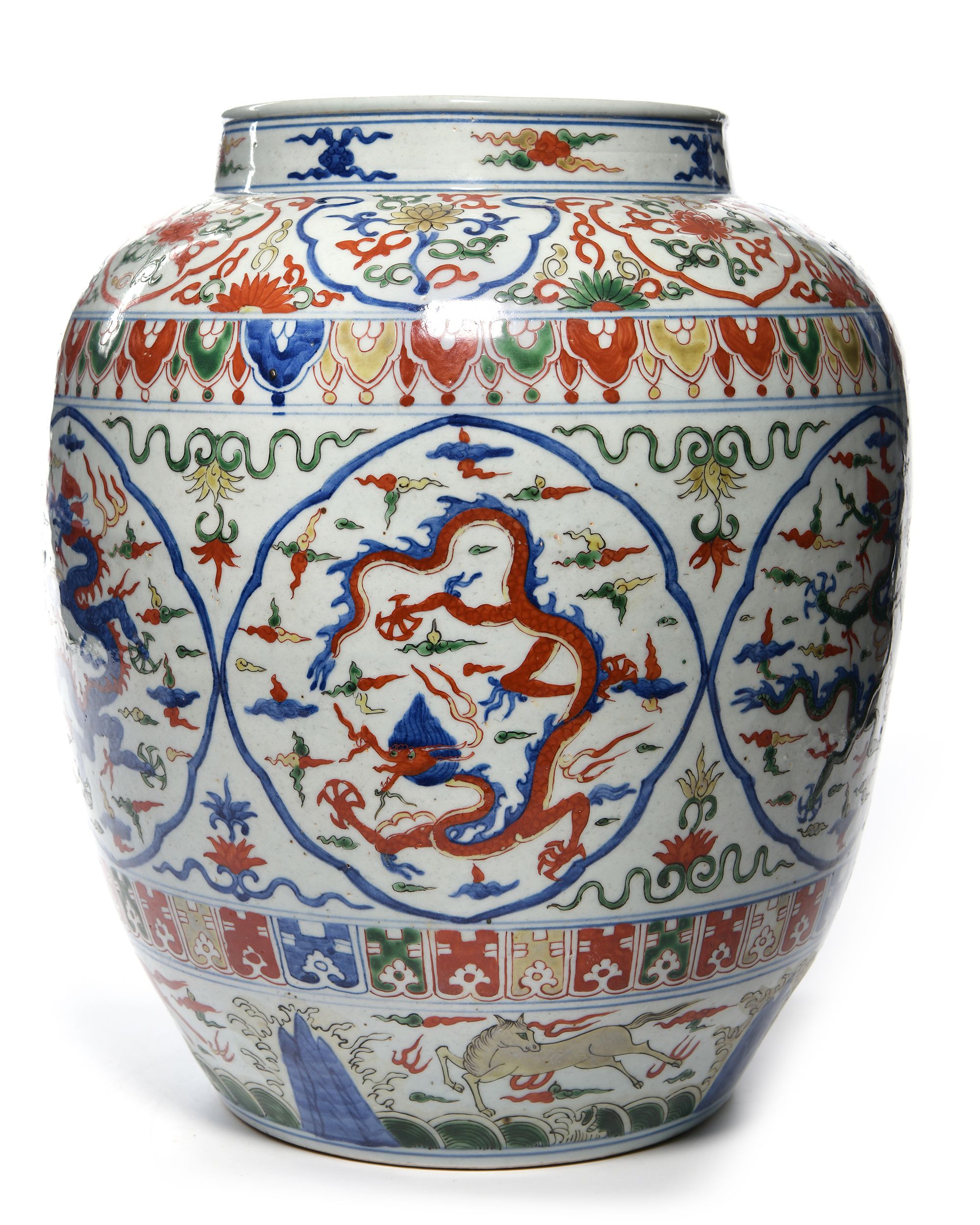 A Chinese porcelain jar decorated with roundels of dragons in different postures mongst clouds, set between a band of ruyi heads and a petal lappet border. The shoulder with a band of ruyi heads enclosing flower sprigs and foliage. The base with horses flying amongst clouds over seawaves. The bottom with a Chinese Jiajing six character mark. H.54.cm