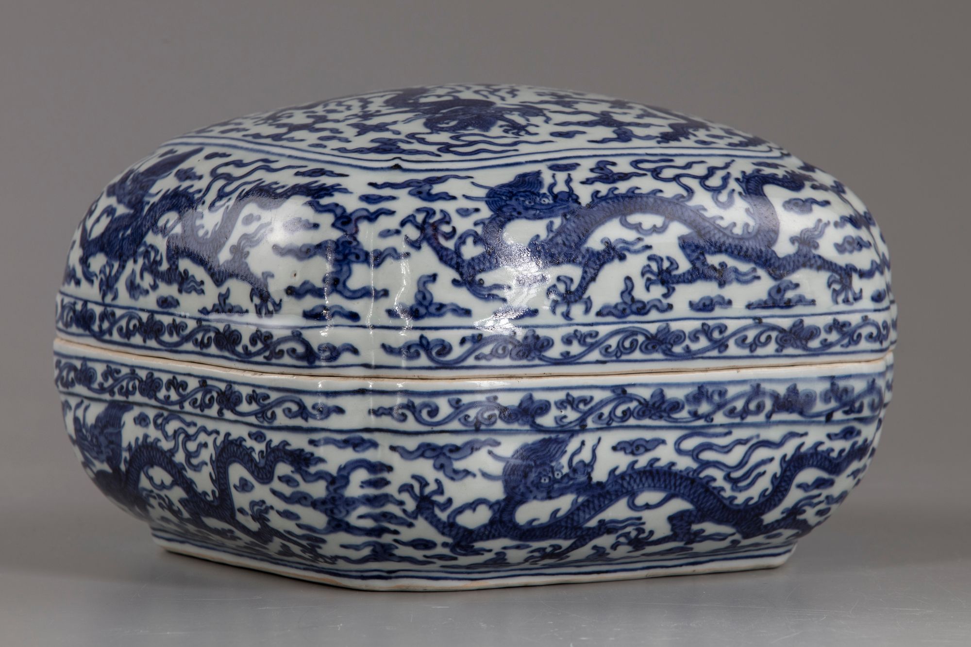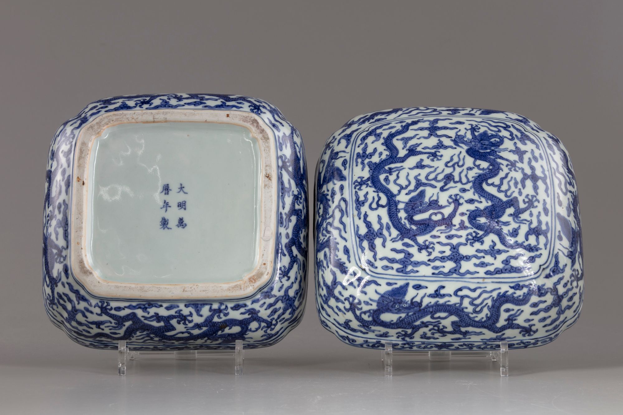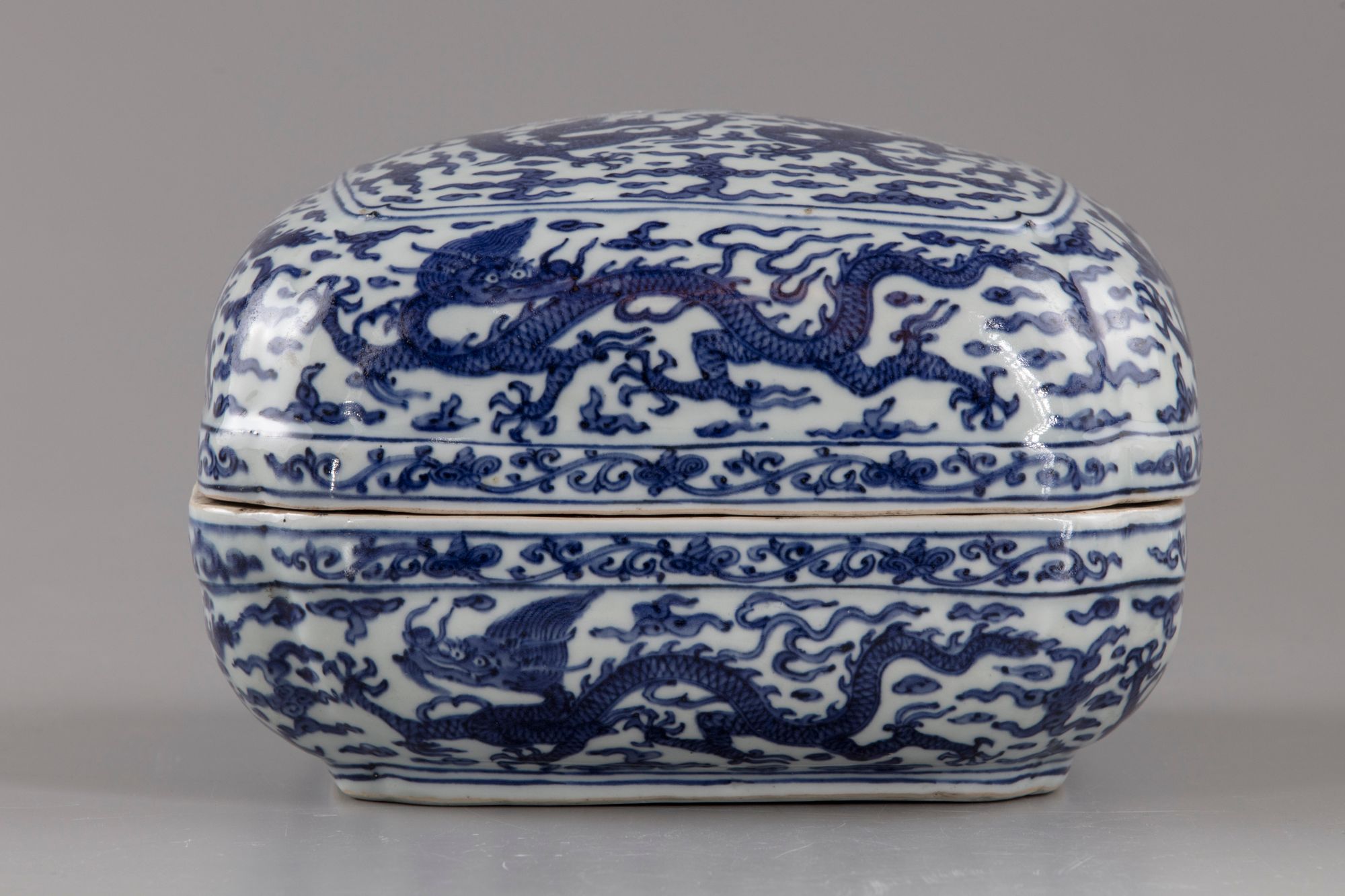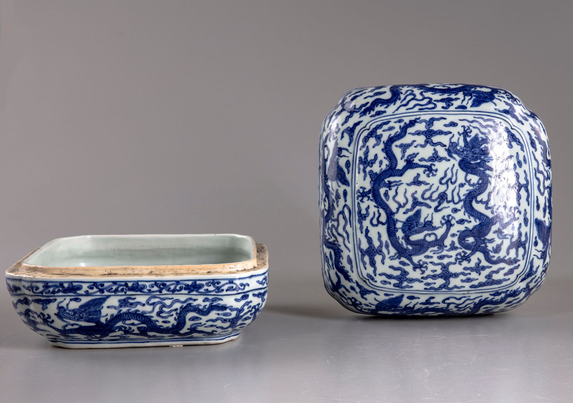 The box is decorated to the cover with two confronting dragons chasing the flaming pearl, and the sides with striding dragons amongst cloud scrolls. The rim of the cover and base are decorated with scrolling lingzhi. The base bears and apocryphal Wanli mark. 17 x 24 cm.