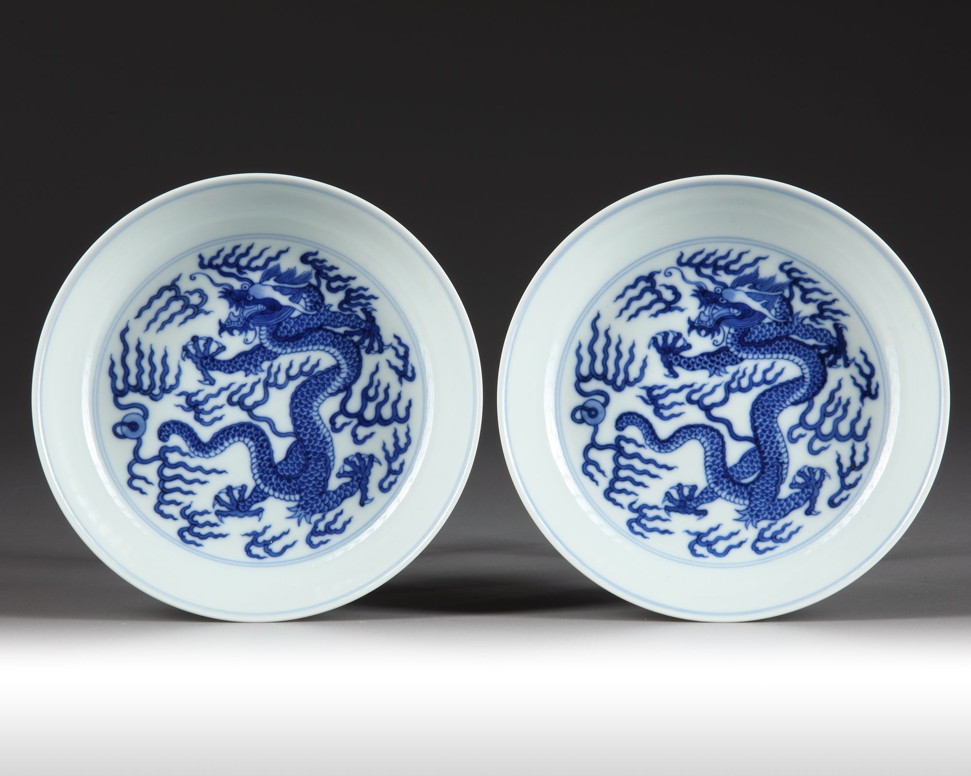 A PAIR OF CHINESE BLUE AND WHITE 'DRAGON' DISHES, TONGHZI SIX CHARACTER MARK