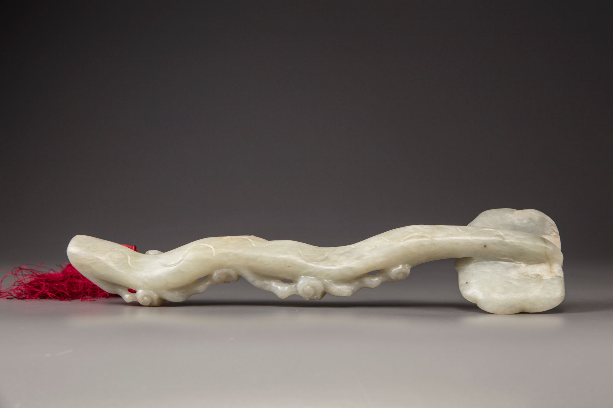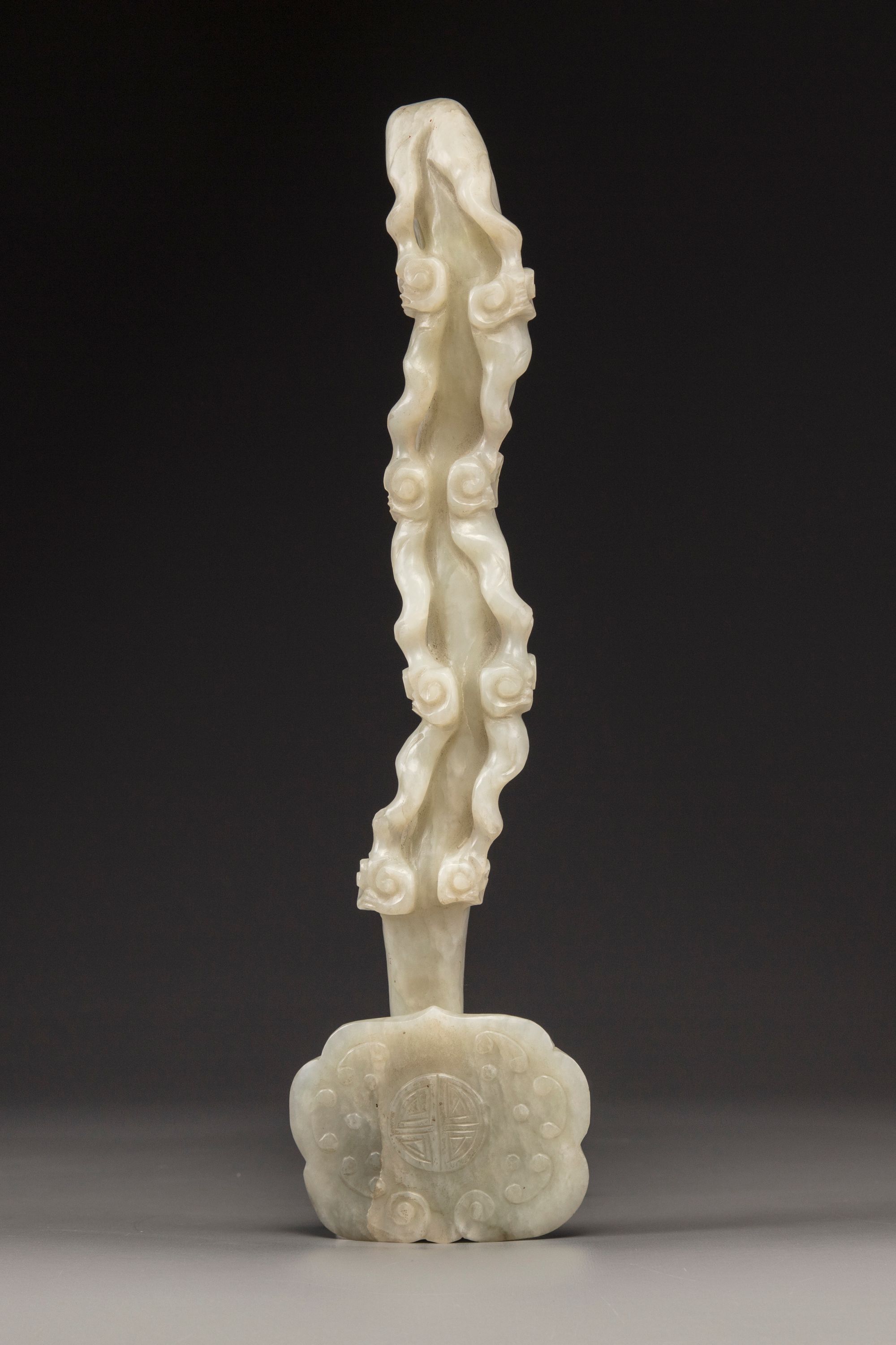 The shaft is carved with a double vertical row of lingzhi fungus with gnarled stems, all leading to the ruyi-shaped head which is carved with a 'shou' (longevity) character roundel surrounded by c-scrolls.