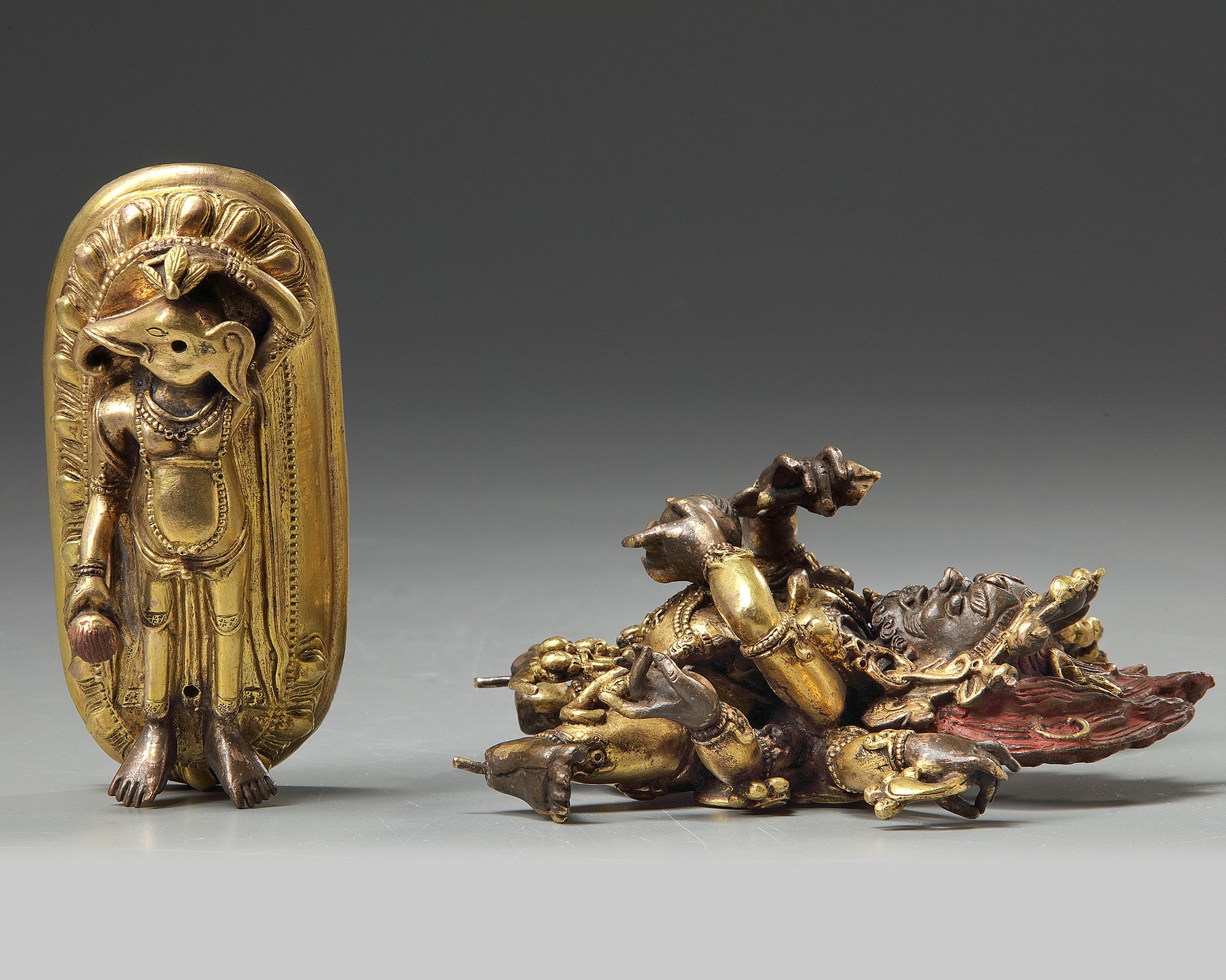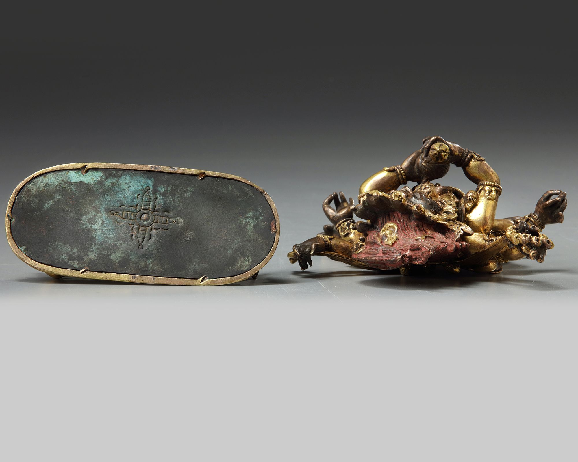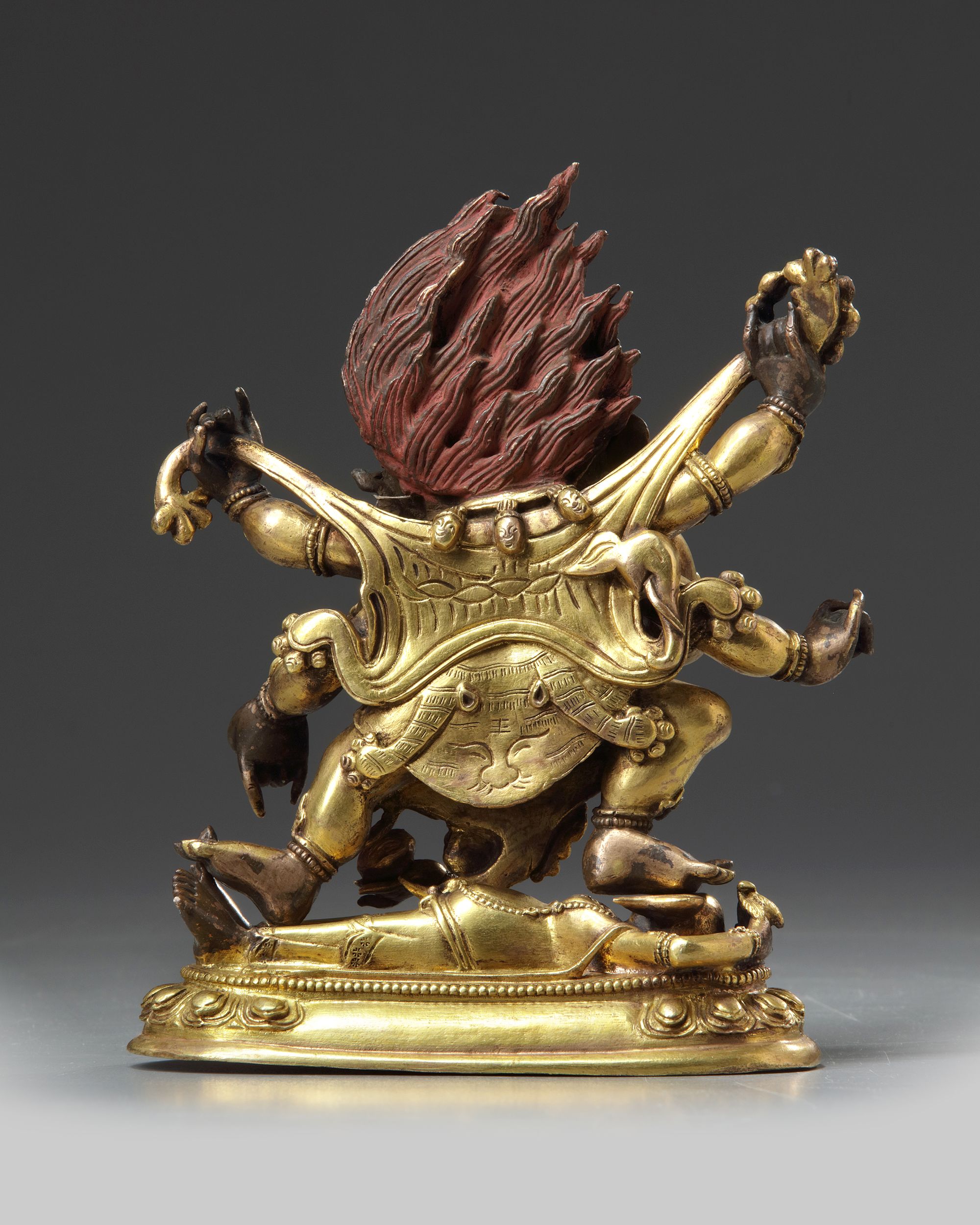 The deity, shown standing on a prostrate figure of Ganapati on an oval lotus base, holds a chopper and a skull cup in the primary hands, and a skull rosary in the raised upper right hand, to which is attached a ribbon held in the upper left hand. The deity wears jewelry, a cord hung with skulls, a tiger pelt, and a crown of skulls backed by his flame-like hair. The base is sealed with a plate inscribed with a double vajra.