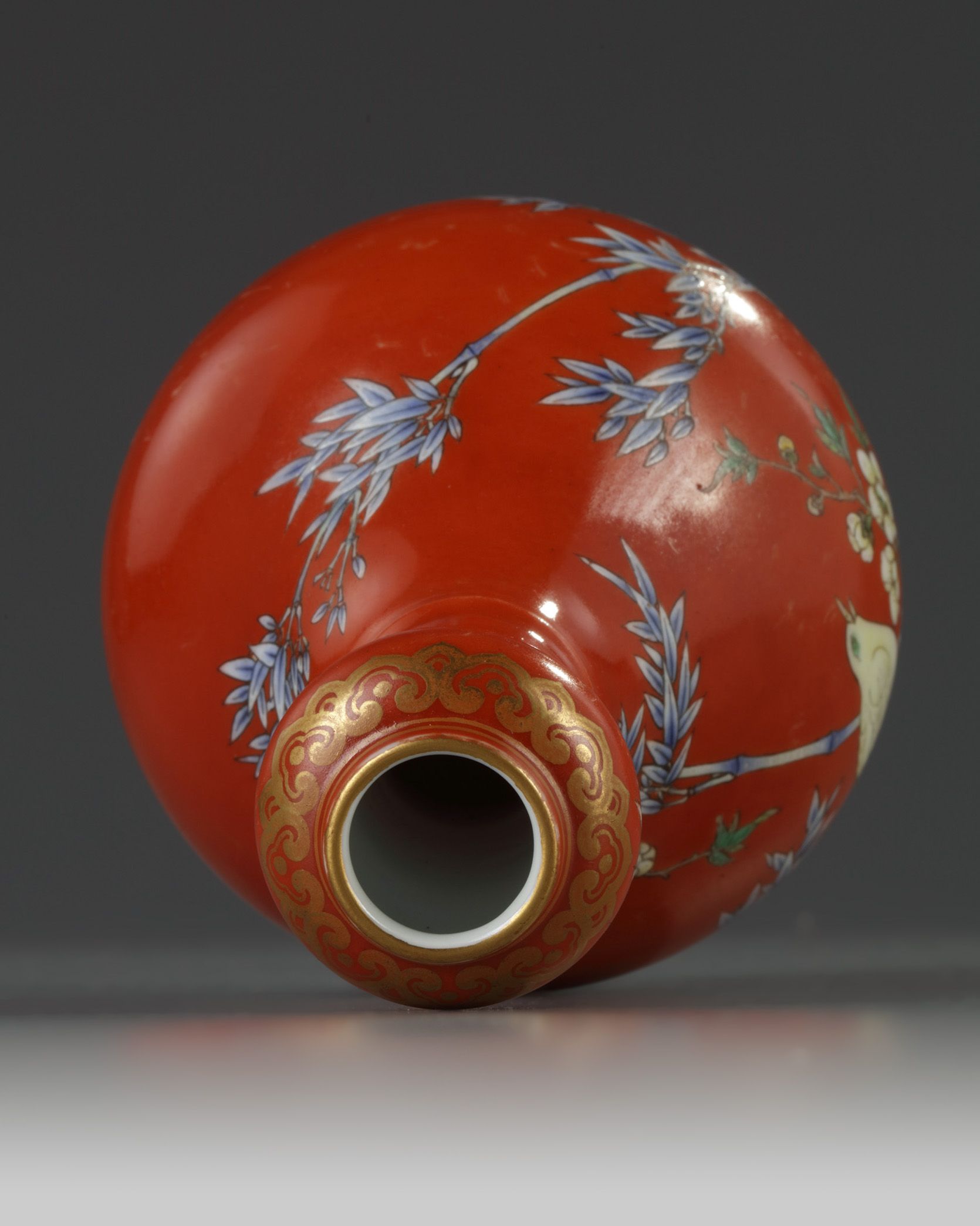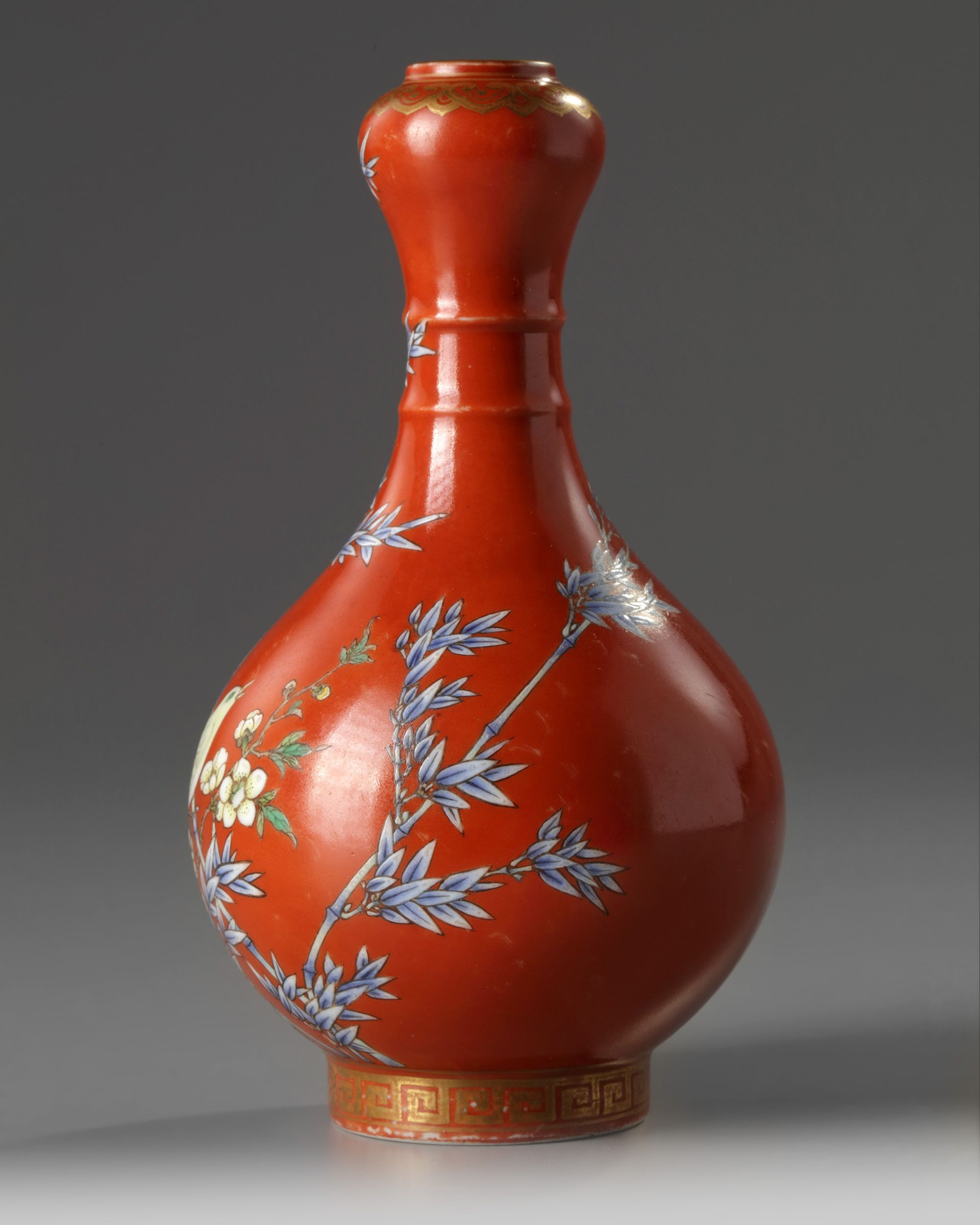 A Chinese coral-ground famille rose 'bird and flowers' garlic-head vase