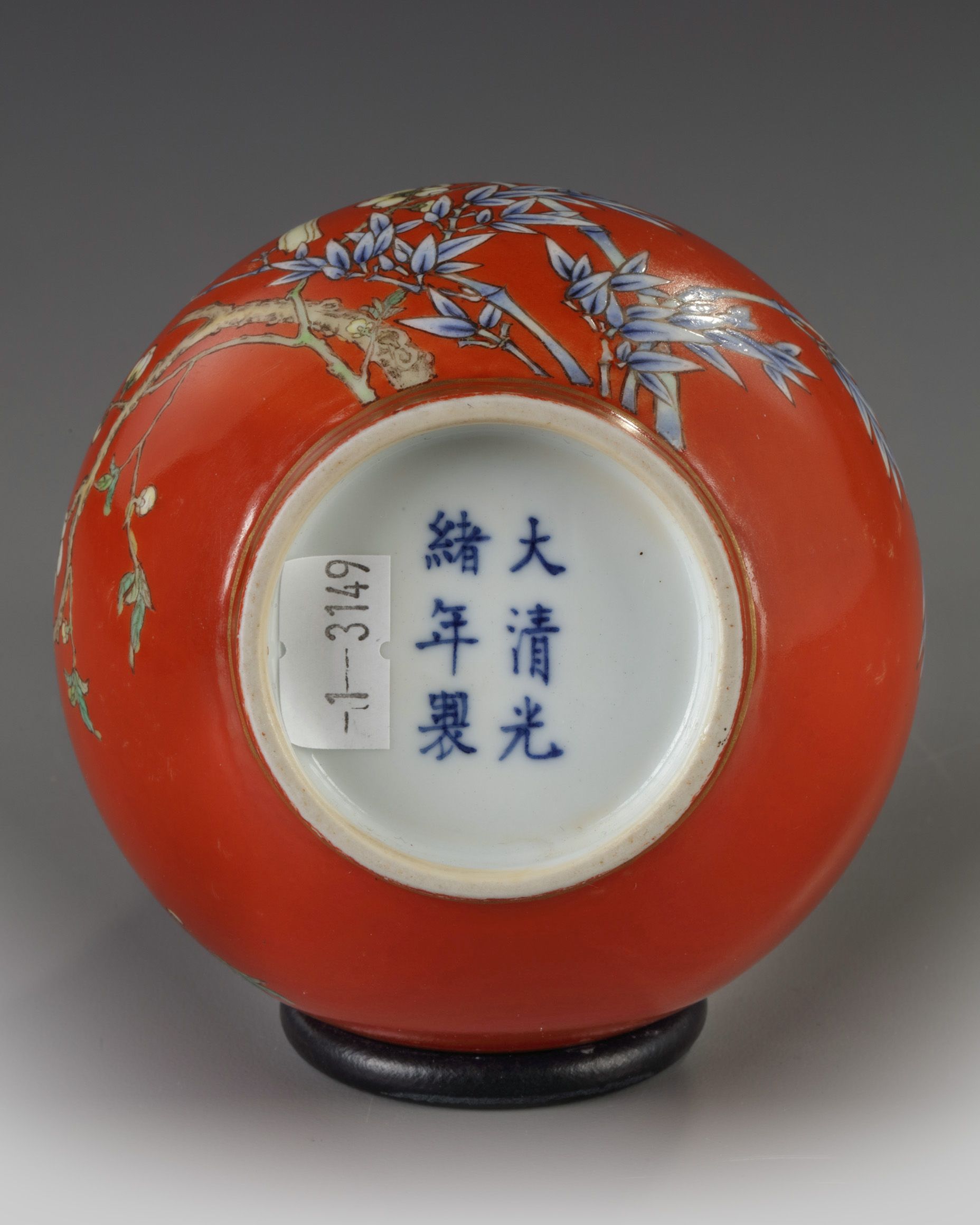 The vase is decorated to the body with a bird perched on a bamboo branch amongst prunus, all below a band of gilt ruyi-heads to the rim. The base with an apocryphal Guangxu mark.