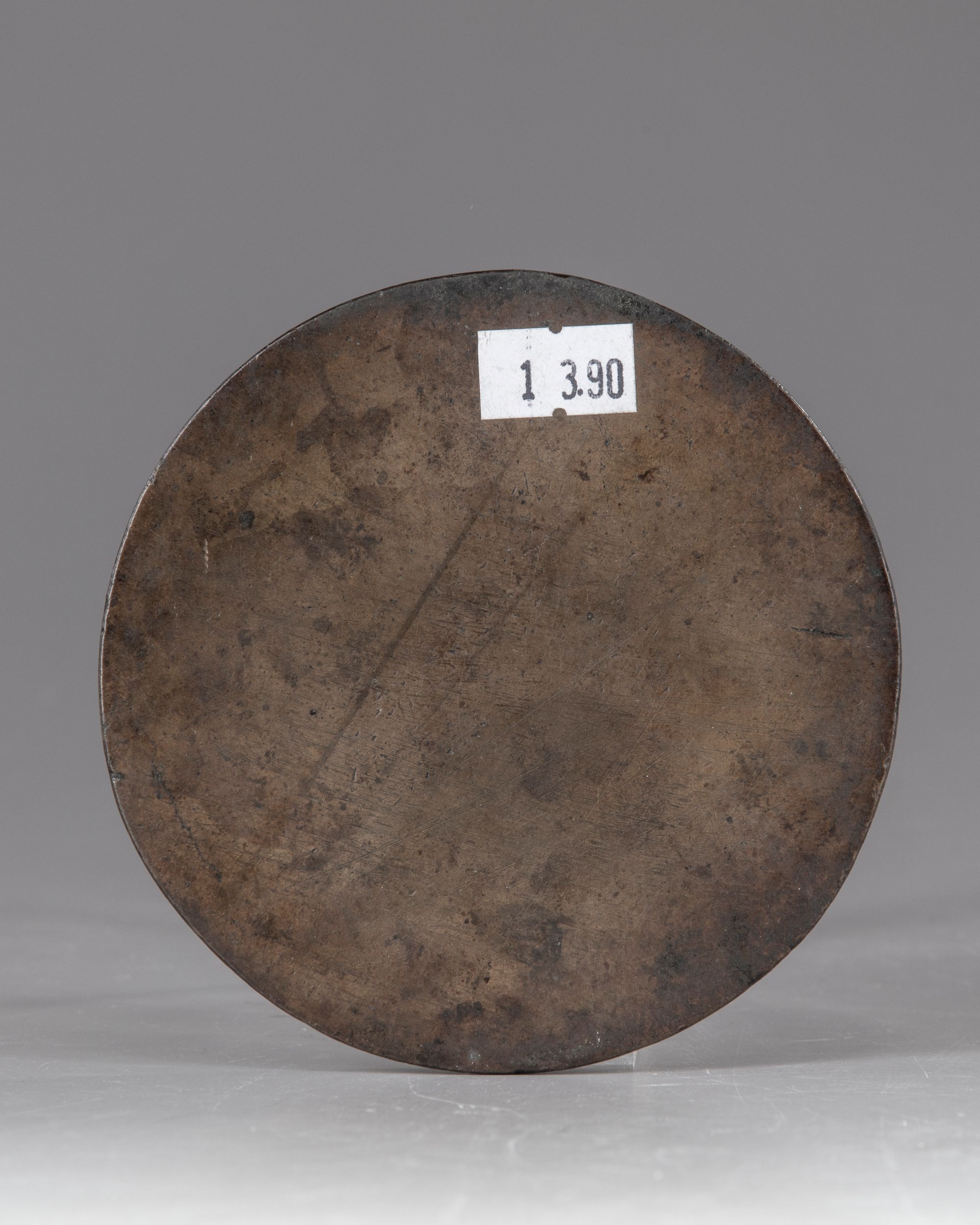 Cast bronze and decorated with figures, cranes, antiquities and a pagoda.