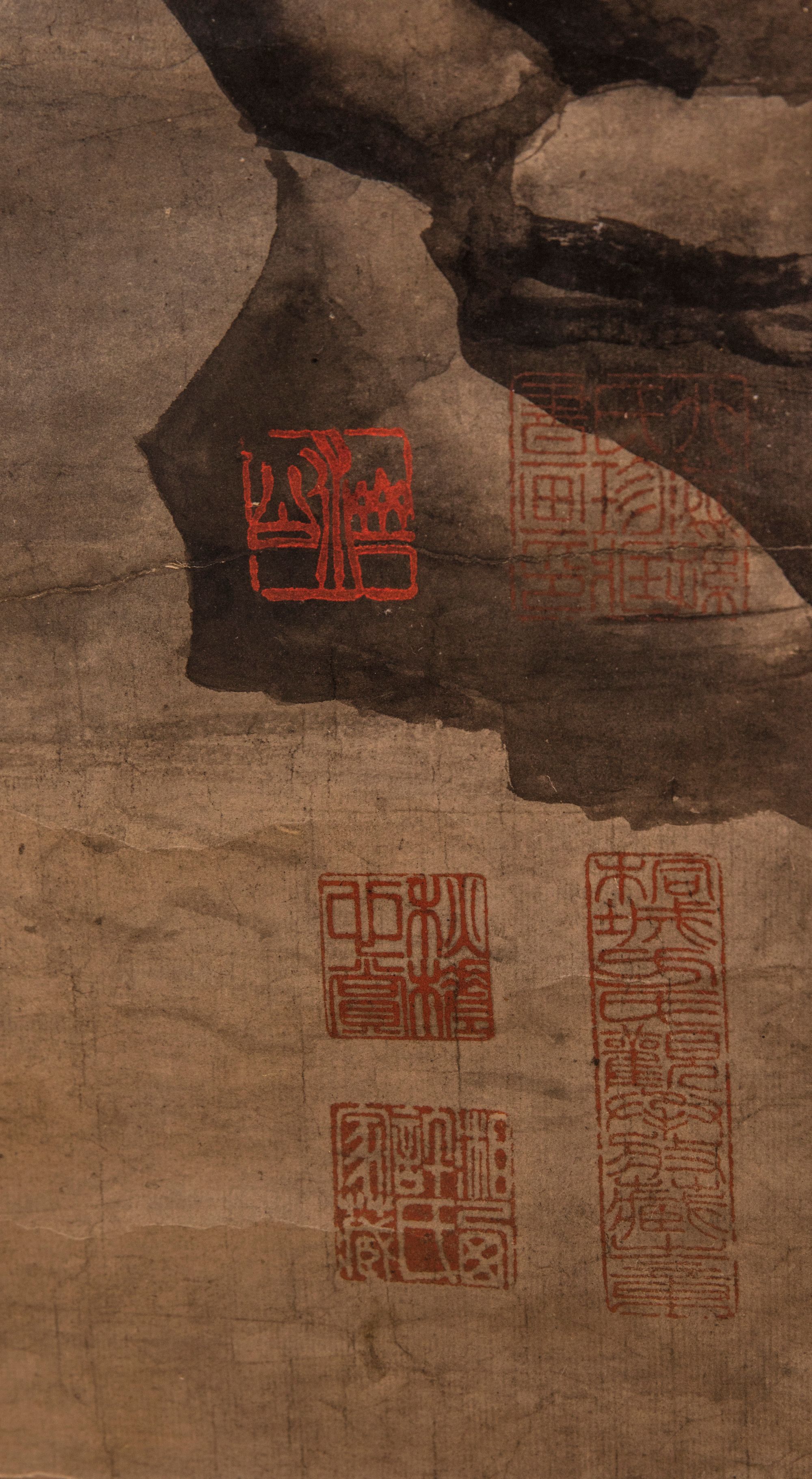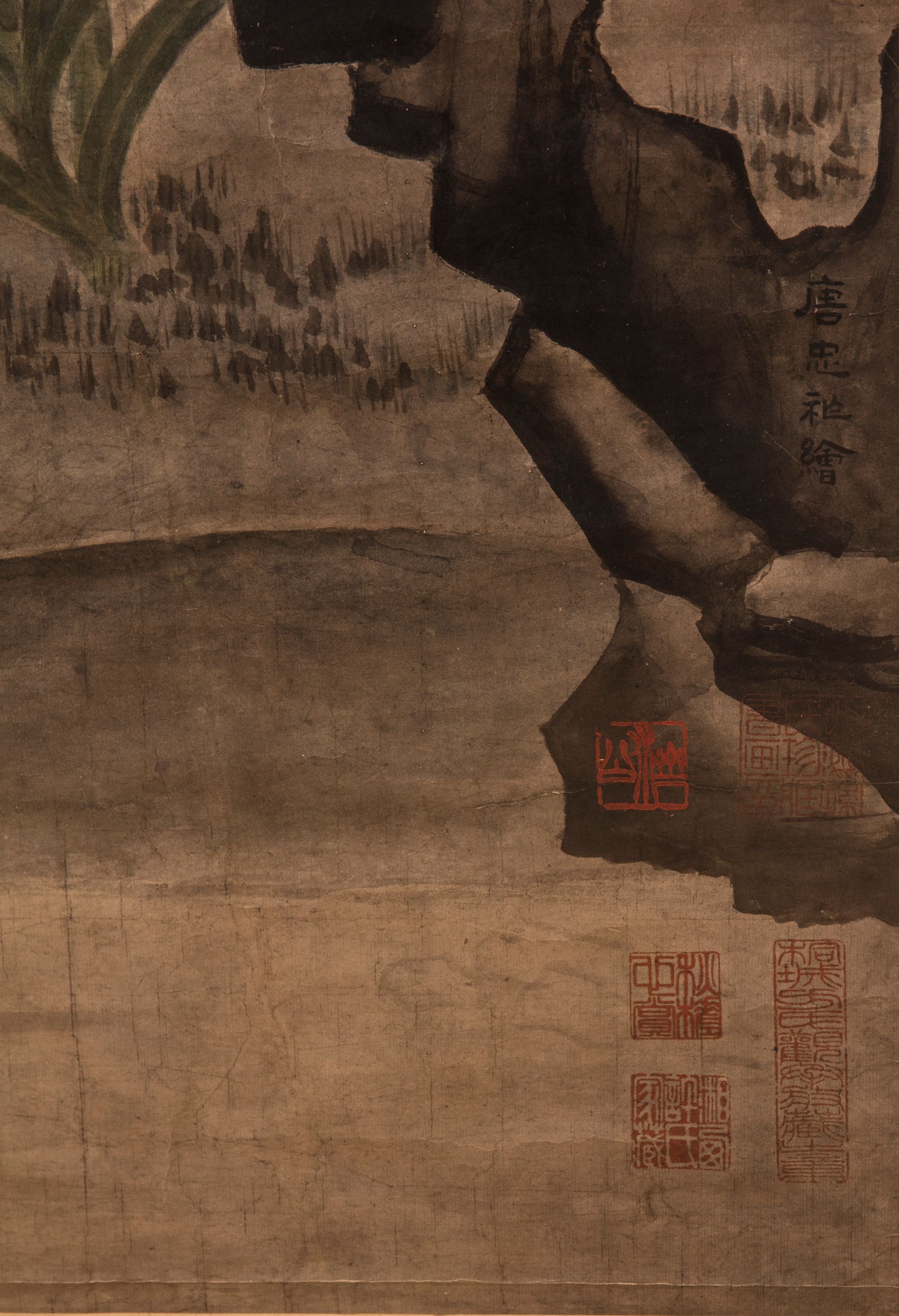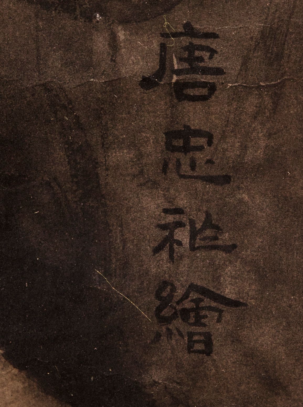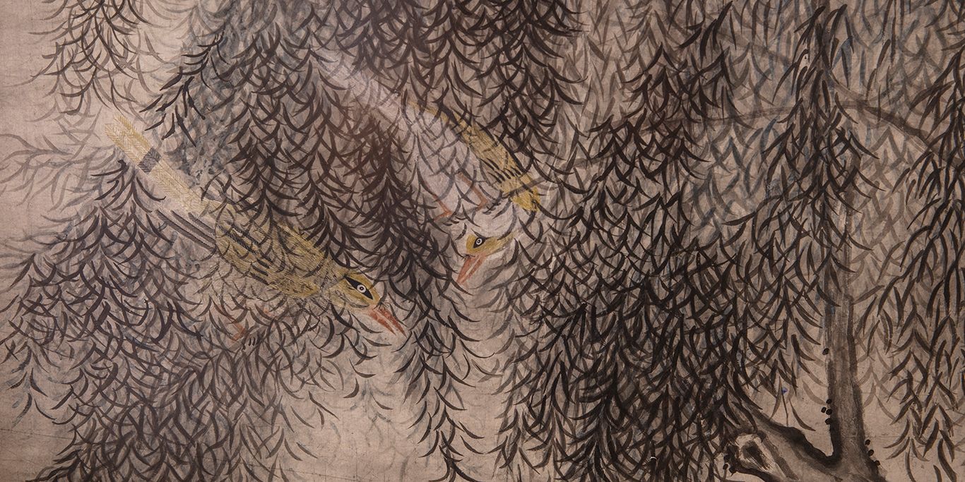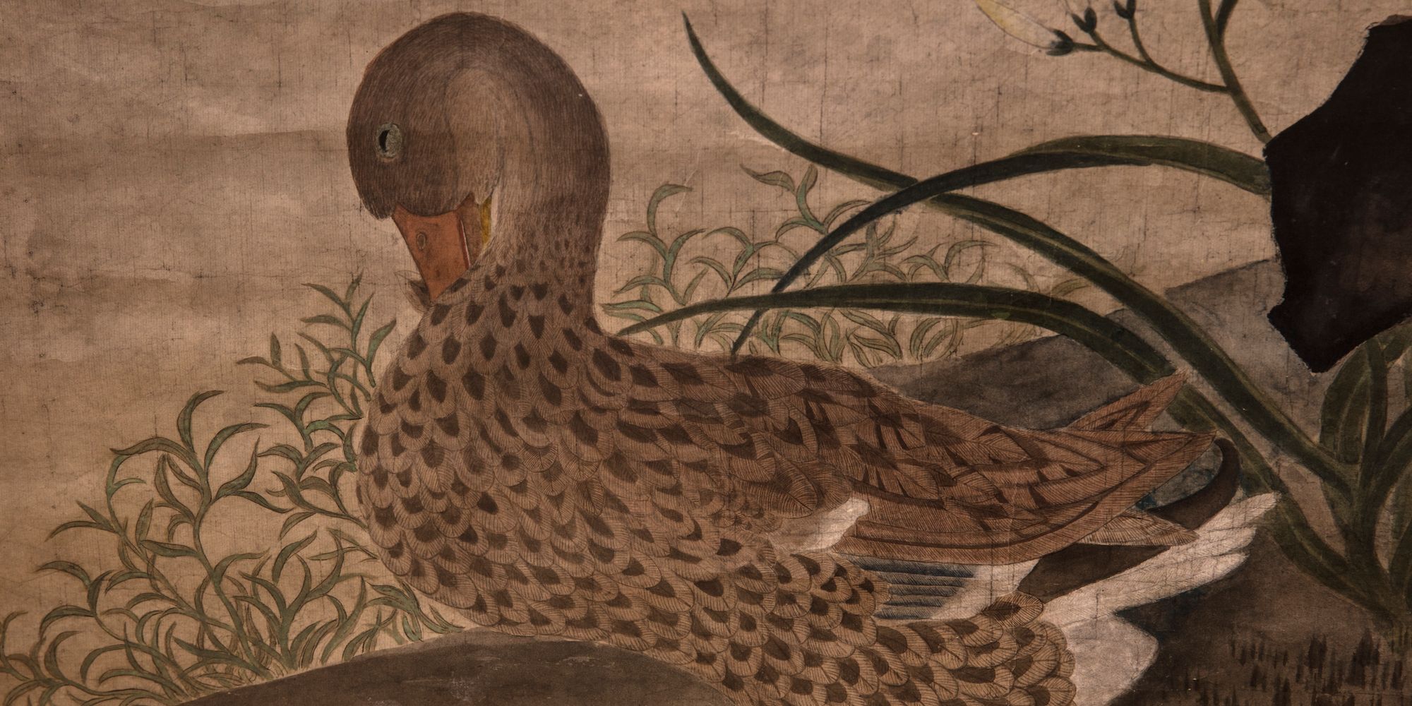 Painted with two yellow birds perched on a tree and a duck beside water, with a calligraphic inscription (signature) and Chinese characters marks.