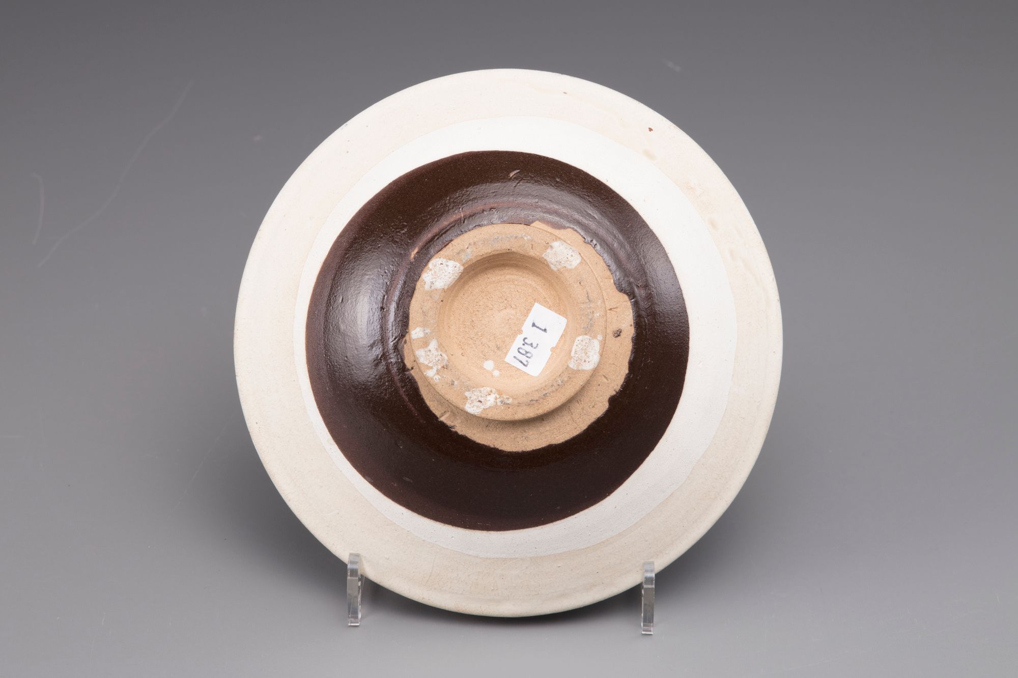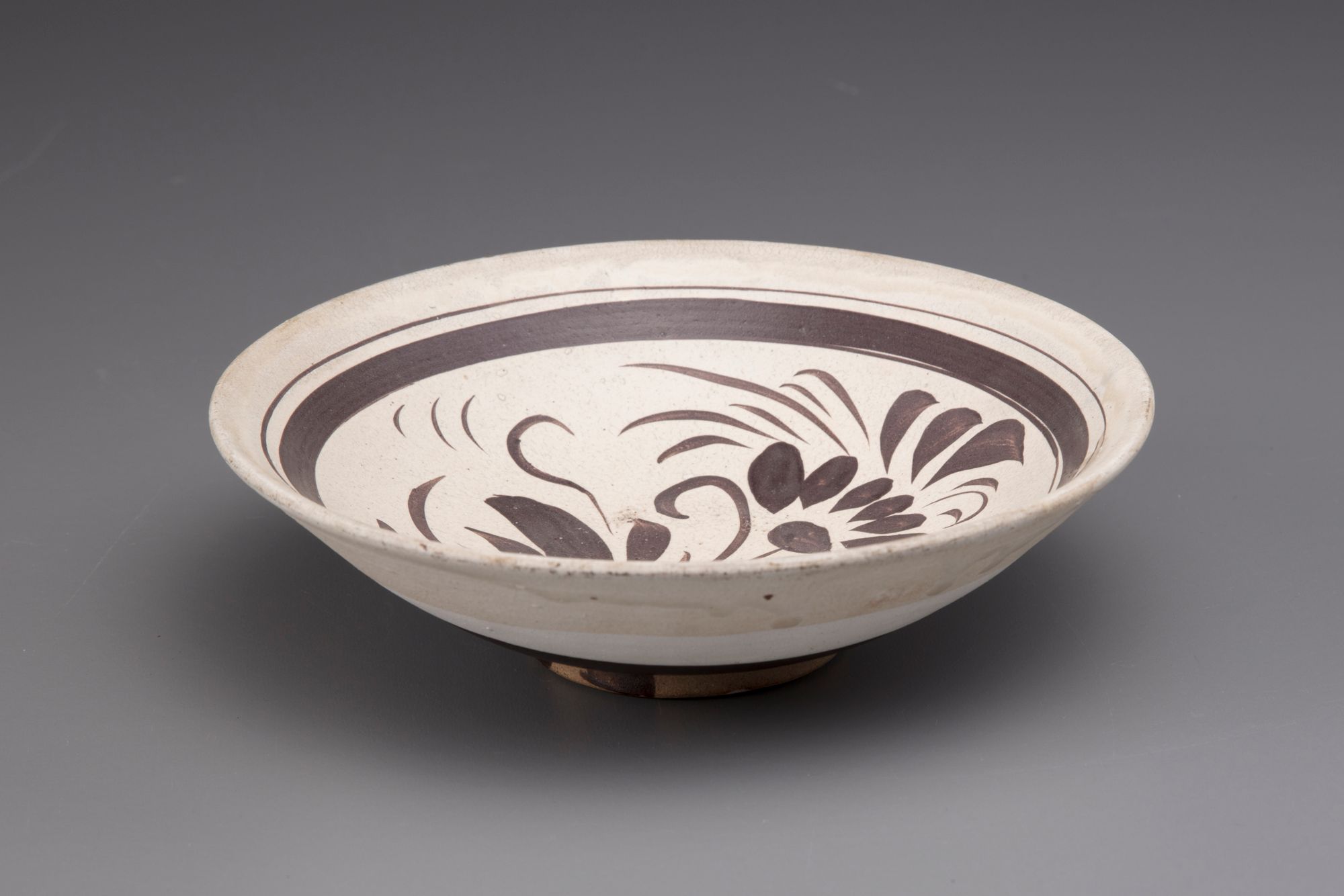 Shallow bowl with rounded sides, standing on a splayed footring and decorated with flower spray, covered with white slip and painted with a brown glaze.