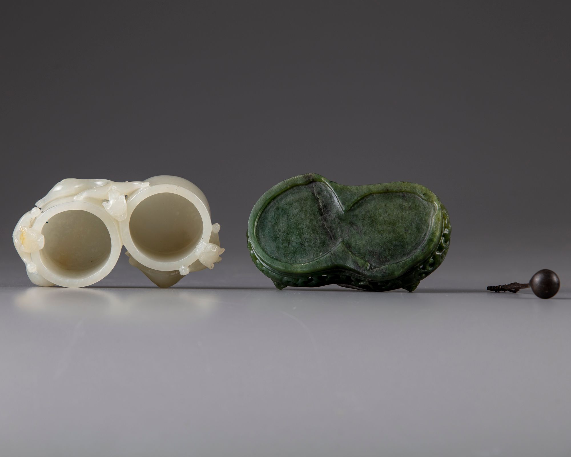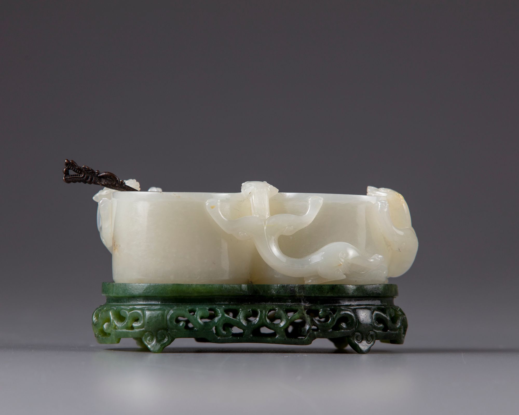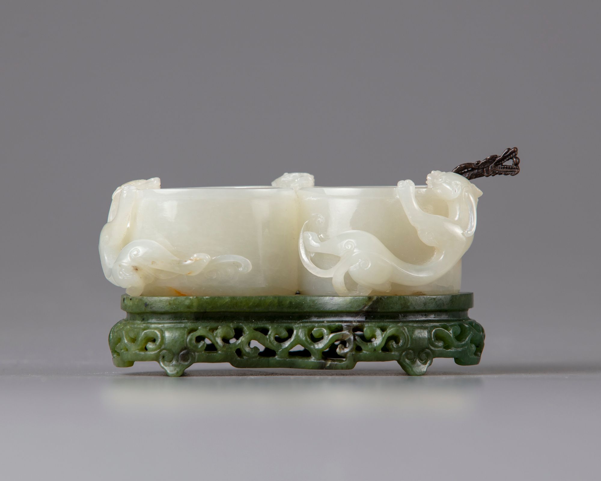 The carving consists of twin-cup with three climbing chilongs, All on a pierced and with scrolls decorated spinach stand.