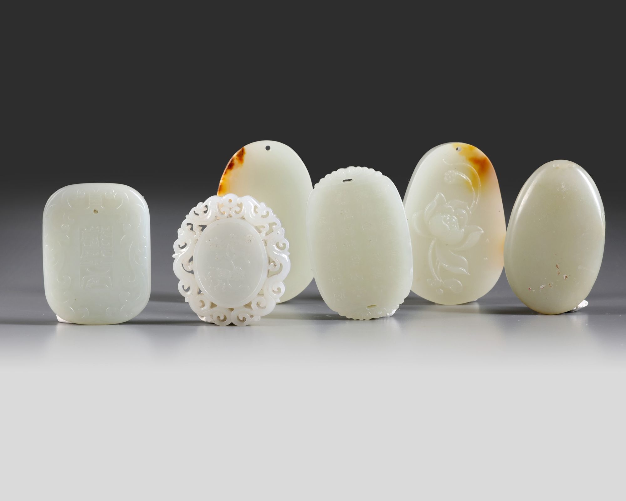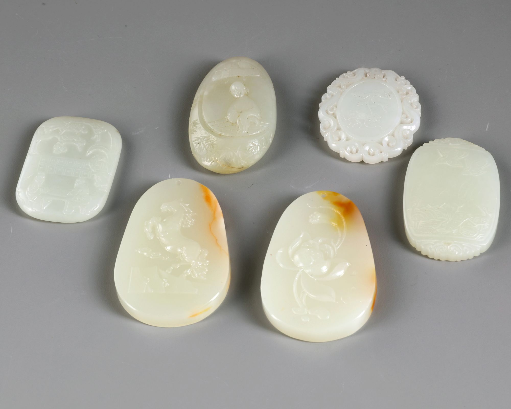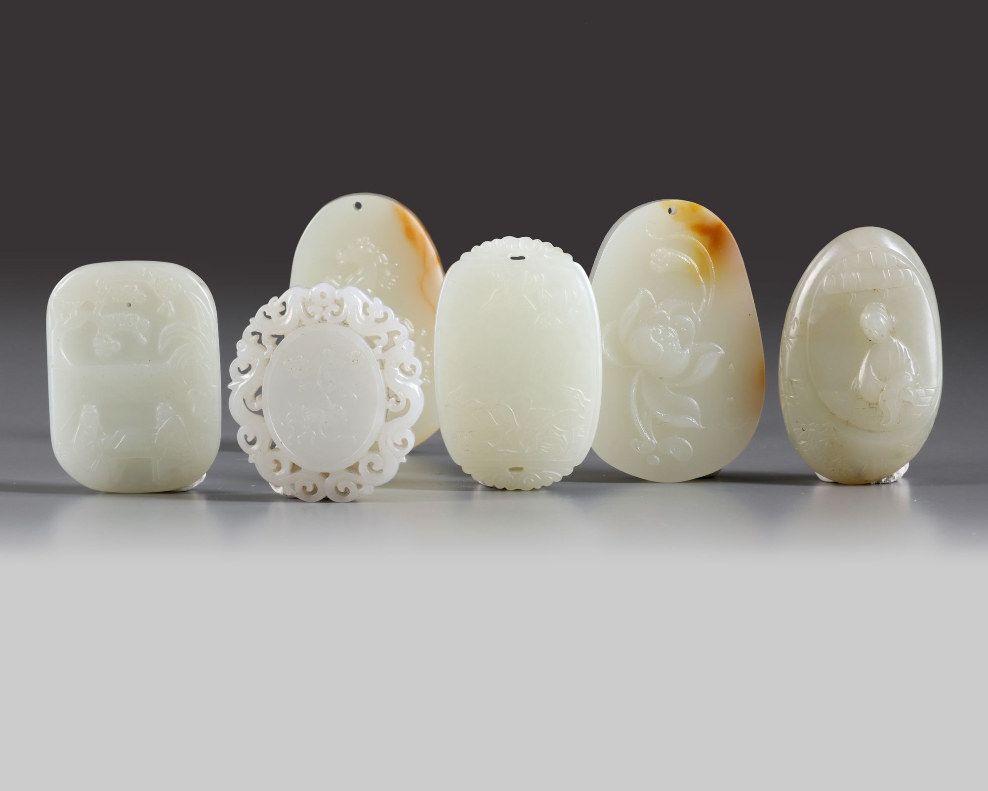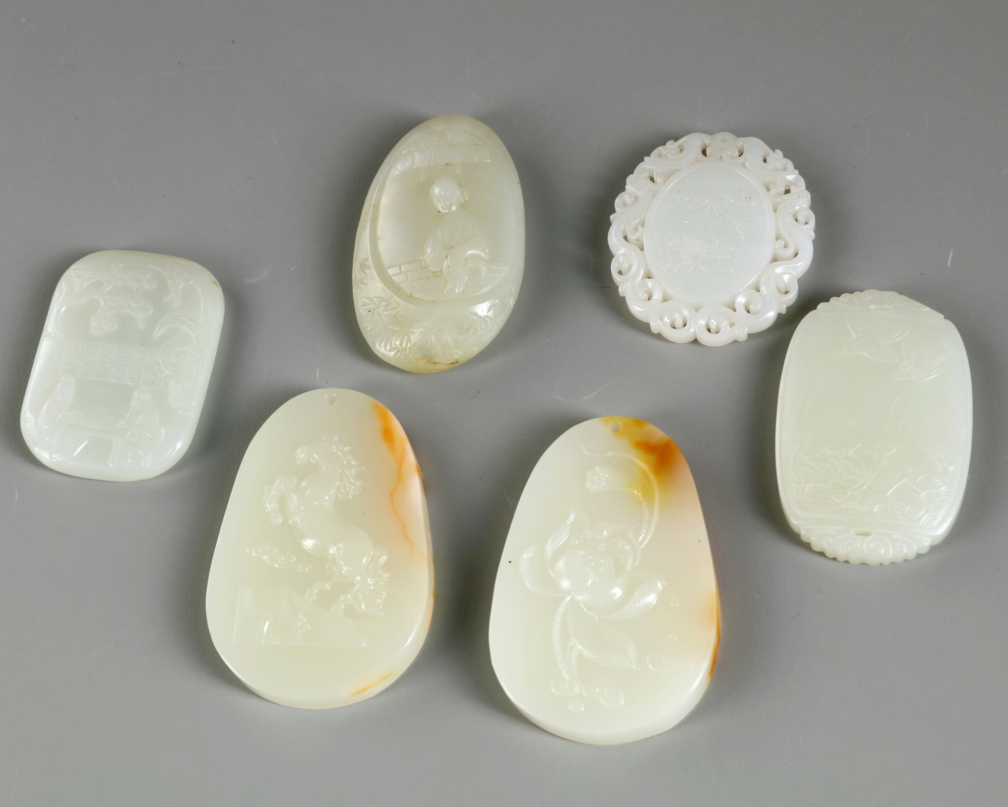 The group comprises: two tapering oval plaques, one carved with lotus and the other with a horse; a rounded rectangular plaque carved with ducks and a poem, a rounded rectangular plaque carved with two scholars playing chess, the reverse carved ‘sui sui ping an’; an oval pebble carved with a lady; and a plaque carved with a ruyi sceptre to one side and a phoenix and fruit to the other, the edges carved in openwork.