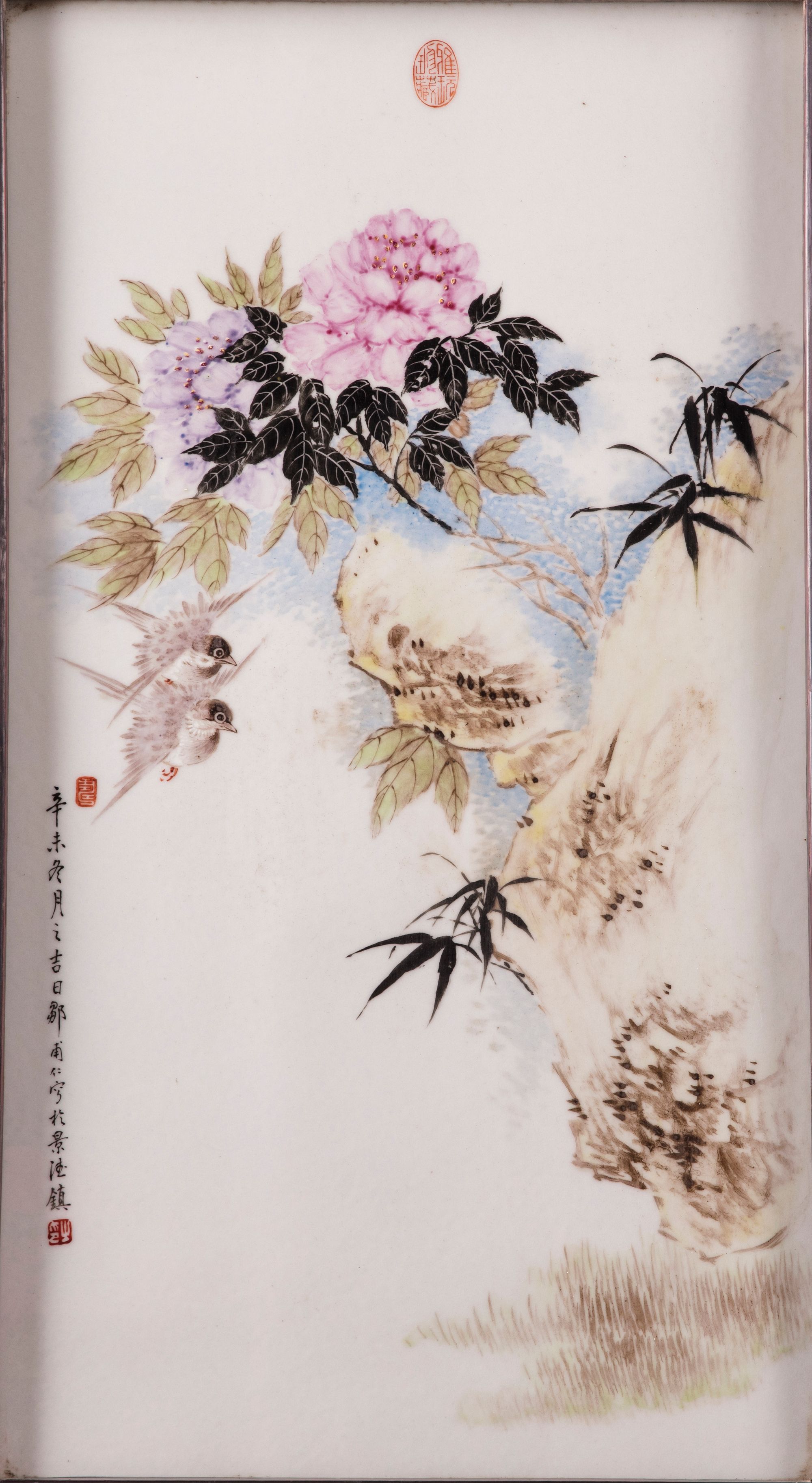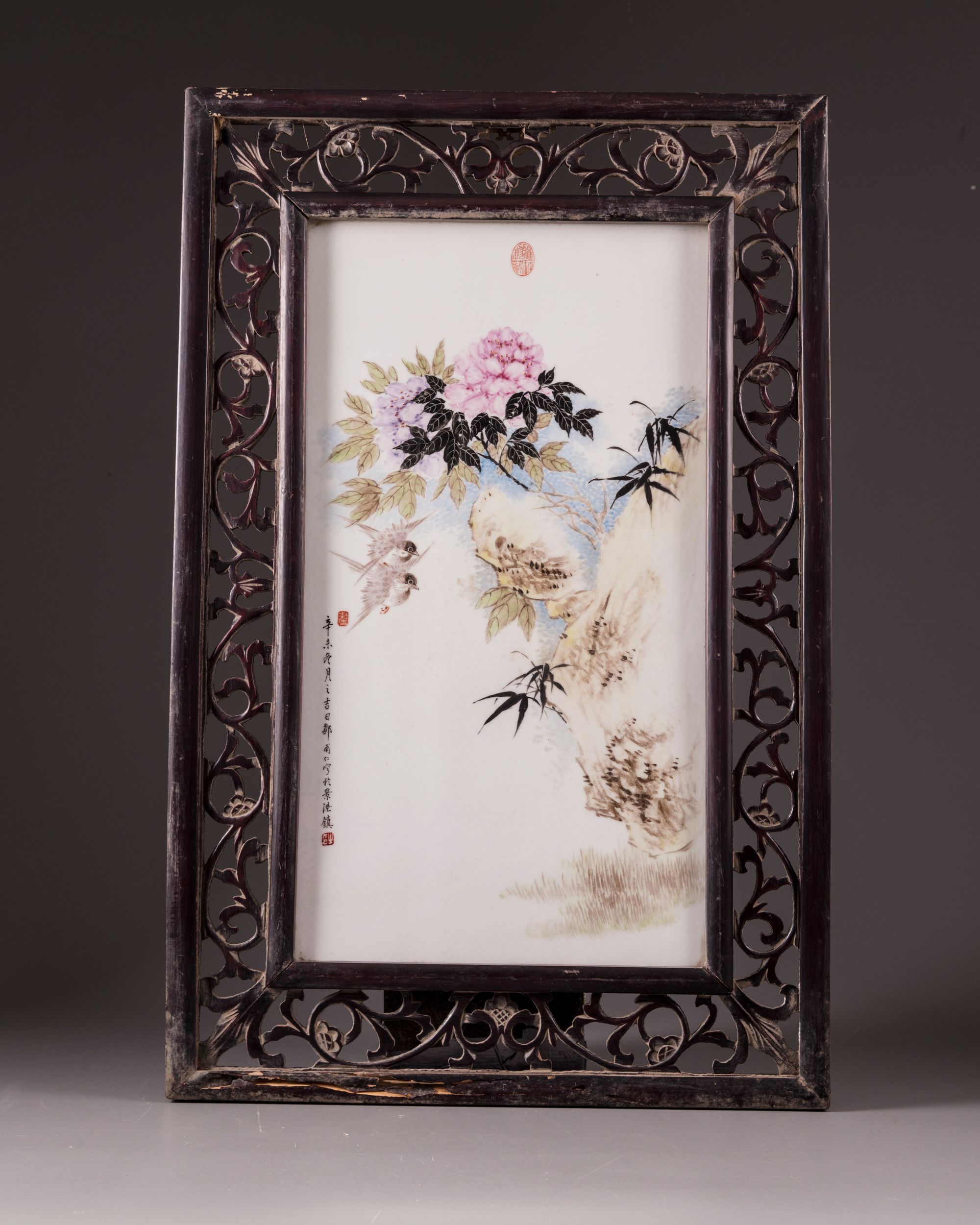 A Chinese plaque decorated with two birds and chrysanthemums.