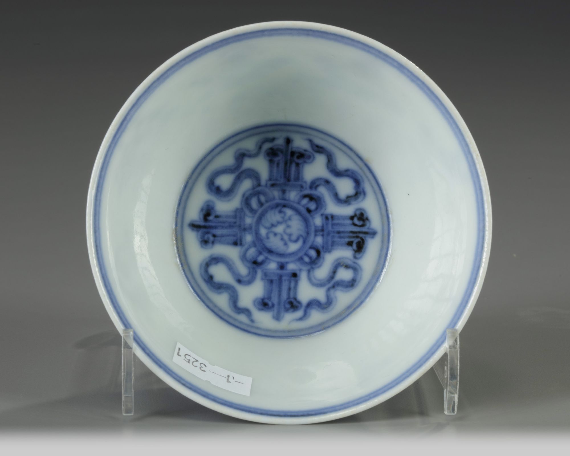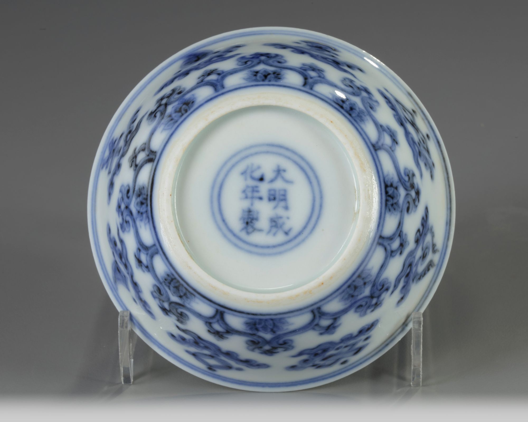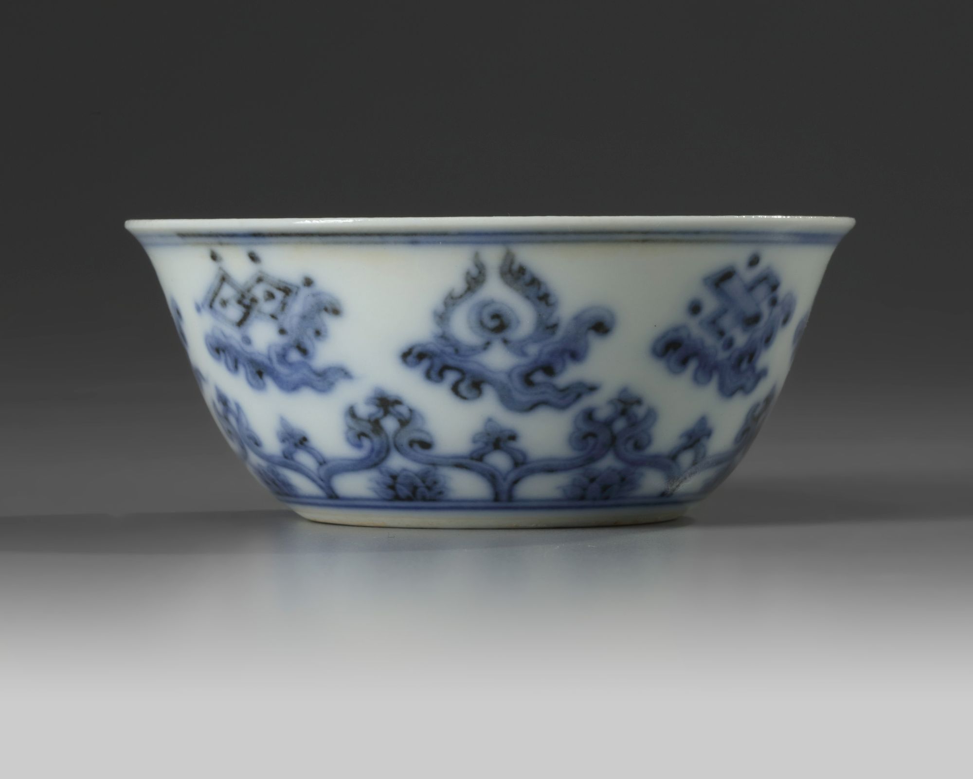 The interior of the bowl is decorated with a roundel enclosing a double vajra, the exterior of the bowl is decorated with the Eight Precious things above linked foliate scrolls, the base is marked with an apocryphal Chenghua mark.
