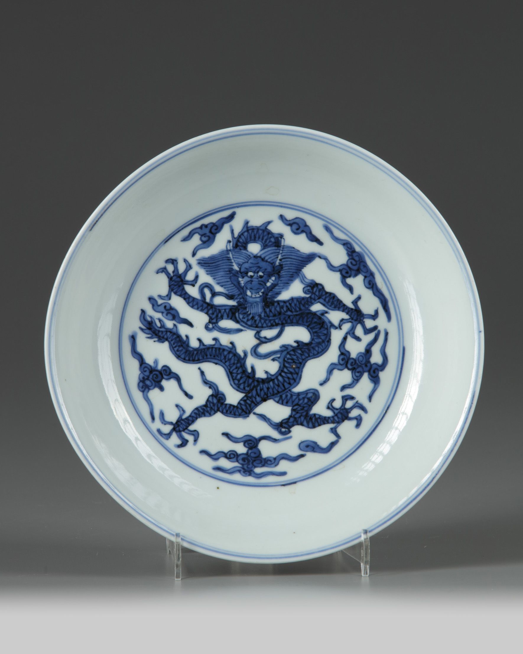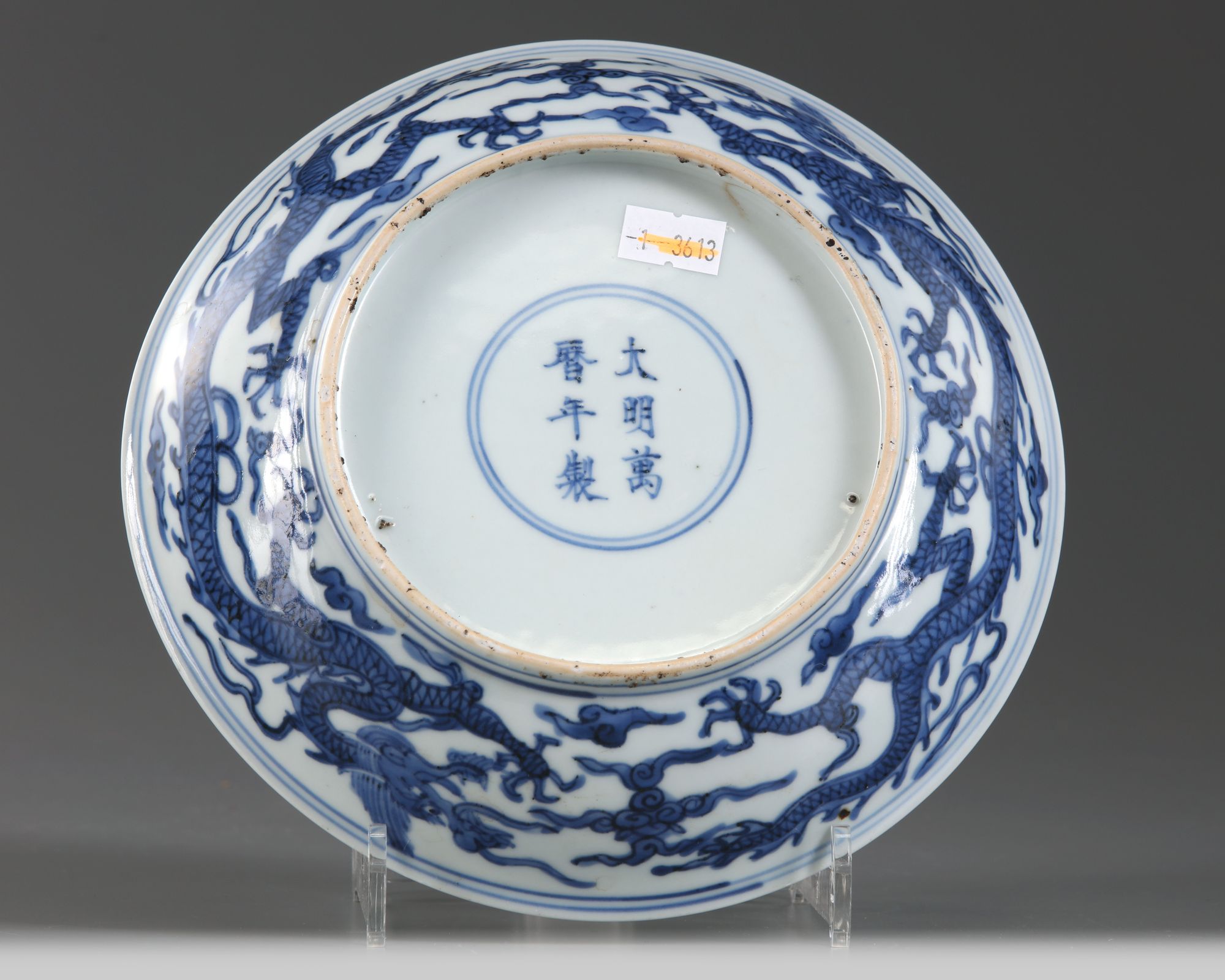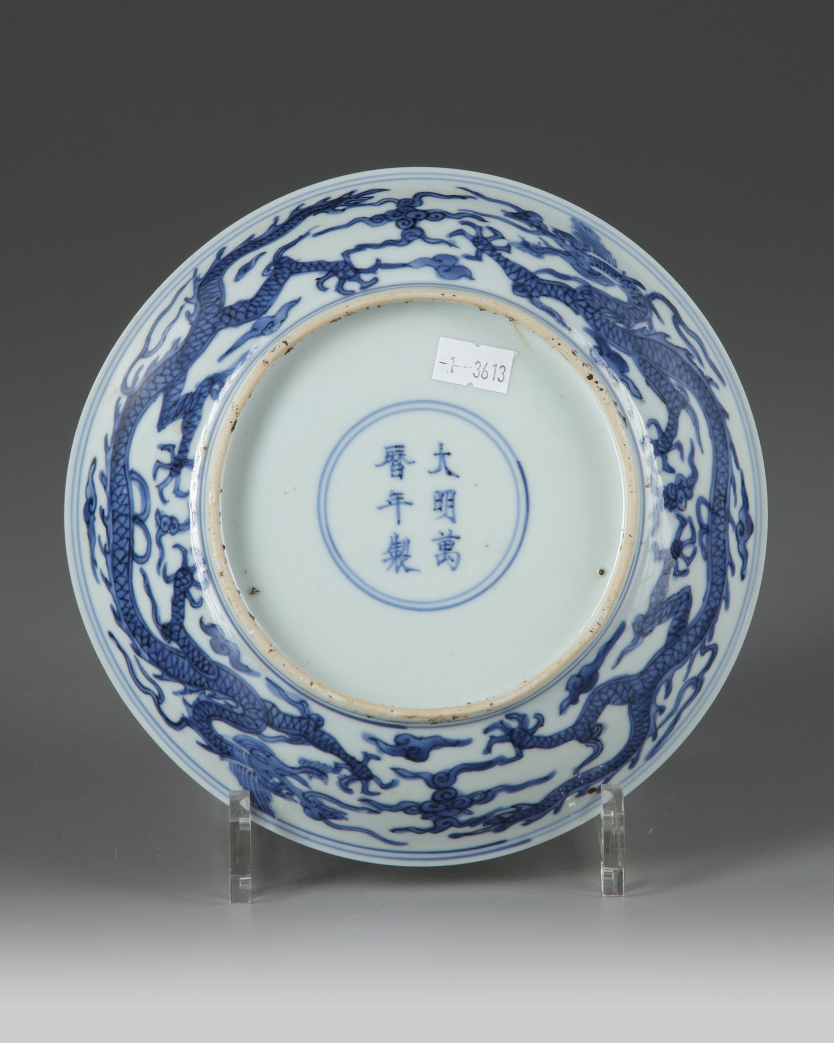 The dish is decorated to the centre with a front-facing dragon roundel amongst cloud scrolls, the reverse is decorated with two striding dragons amongst further cloud scrolls and the base with a Wanli mark in underglaze blue.