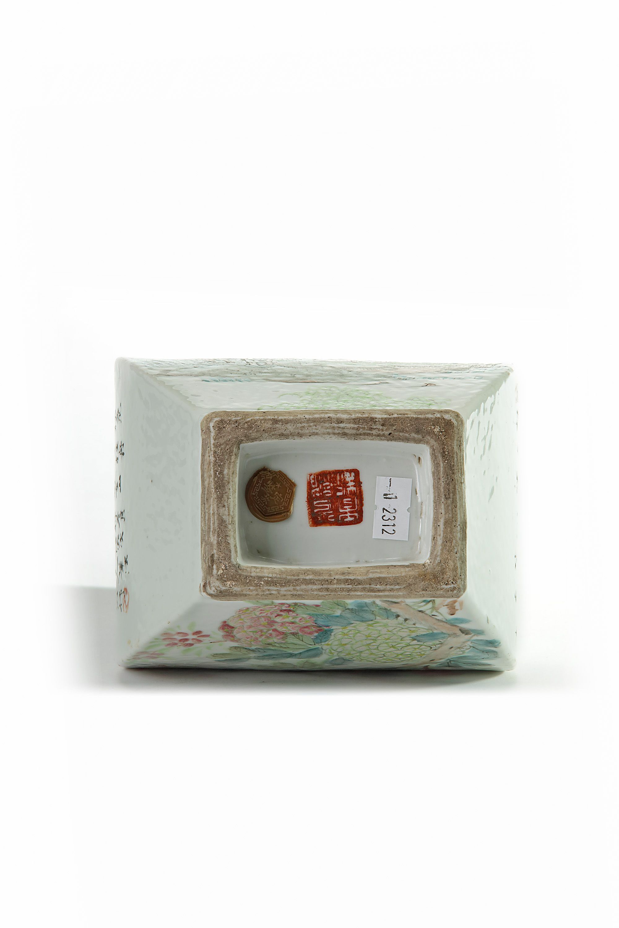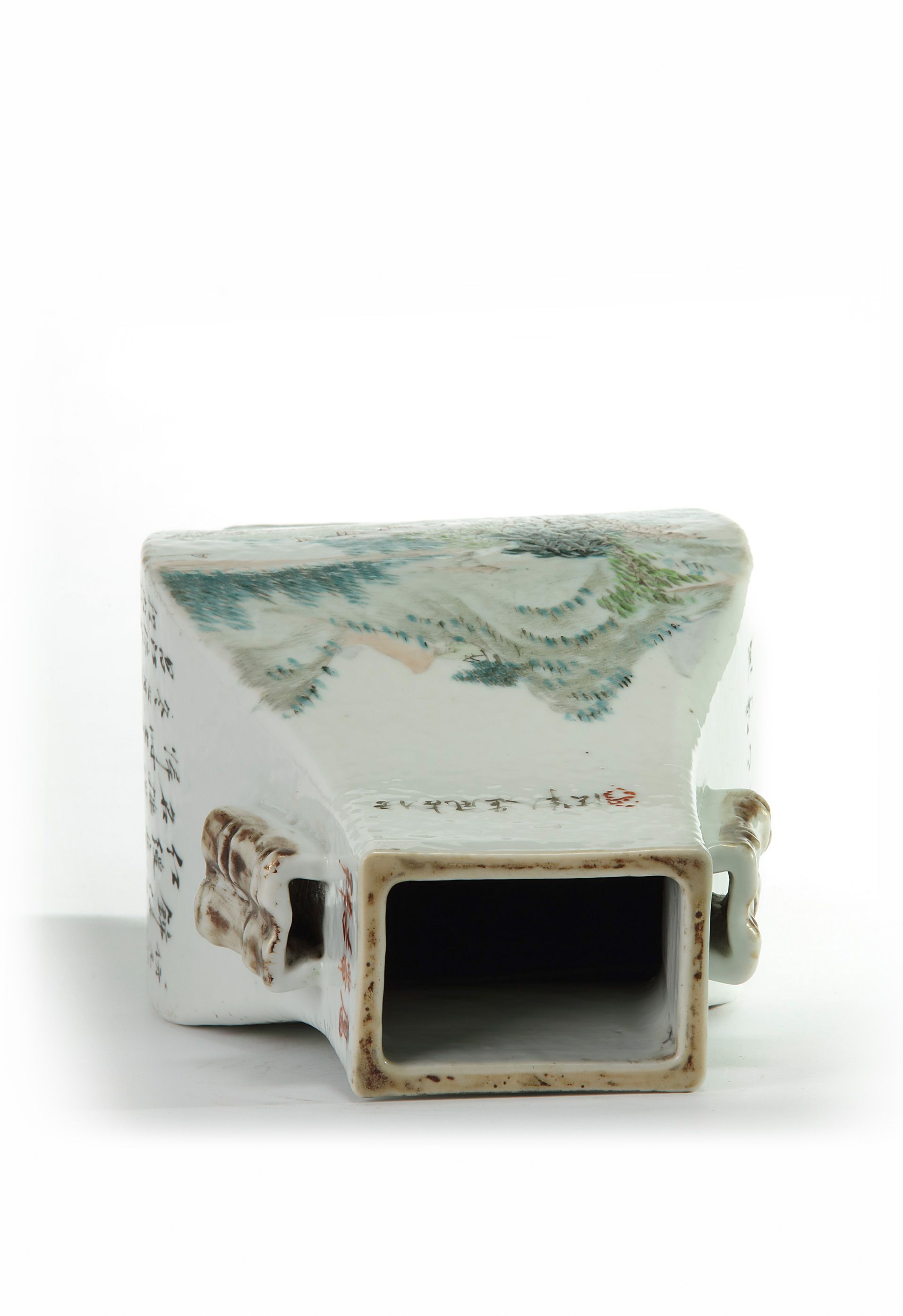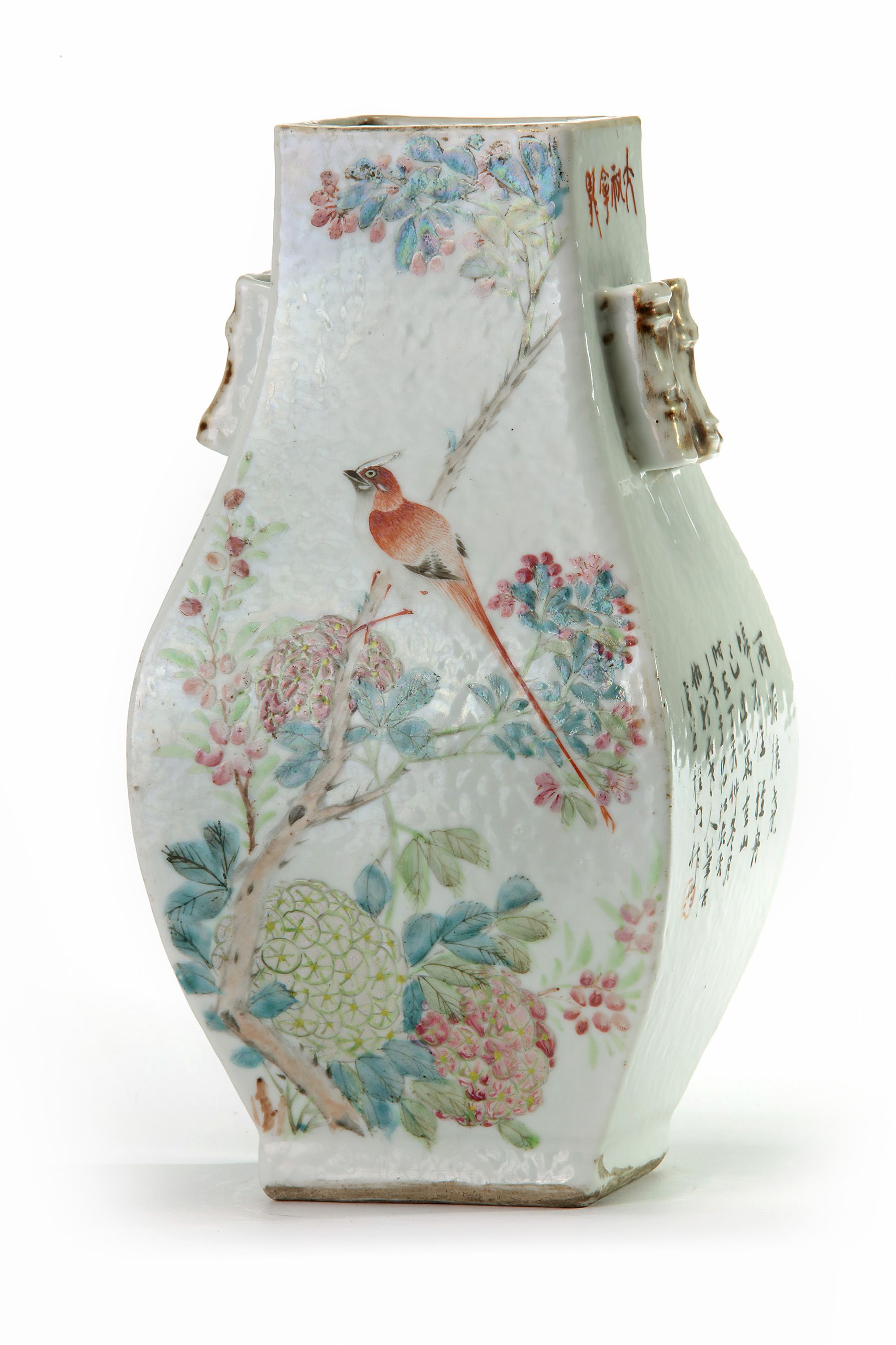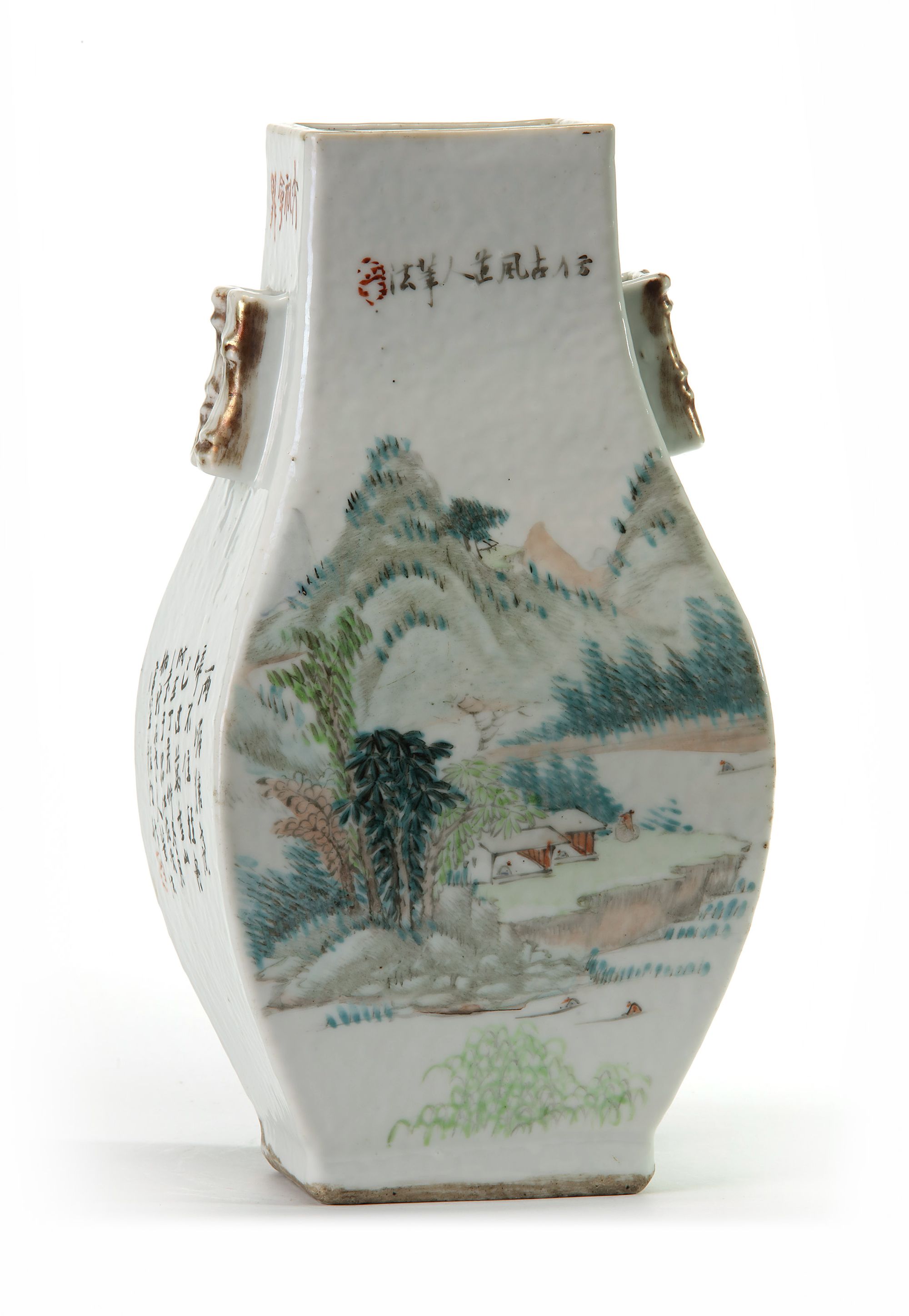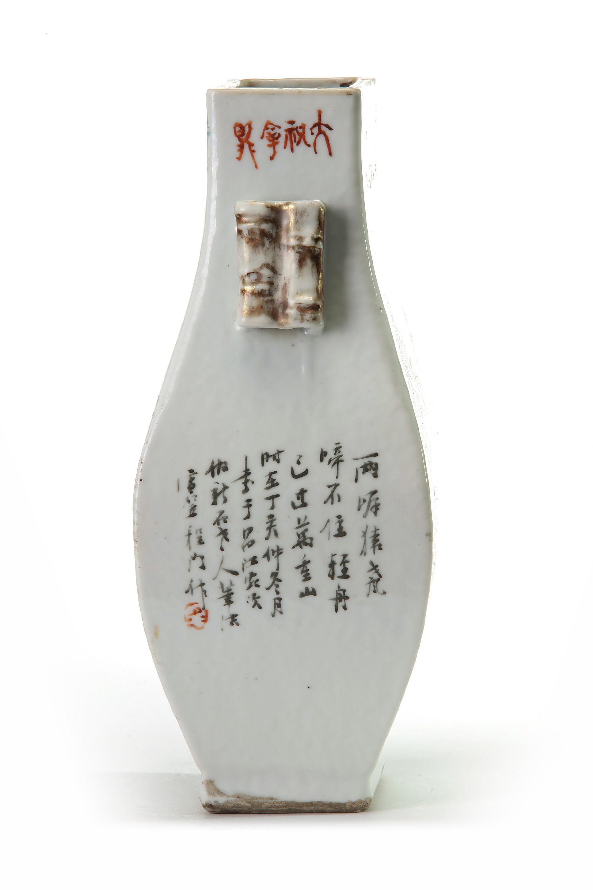 The vase is decorated with two pierced bamboo-form handles to the neck, one side is decorated with a river landscape and inscribed with one seal, and the other side is decorated with a bird perched on a flowering branch. Both narrow sides are inscribed in seal script and with a poetic inscription, and signed Cheng Men with one seal. The underside with an iron red four-character Guangxu seal mark.