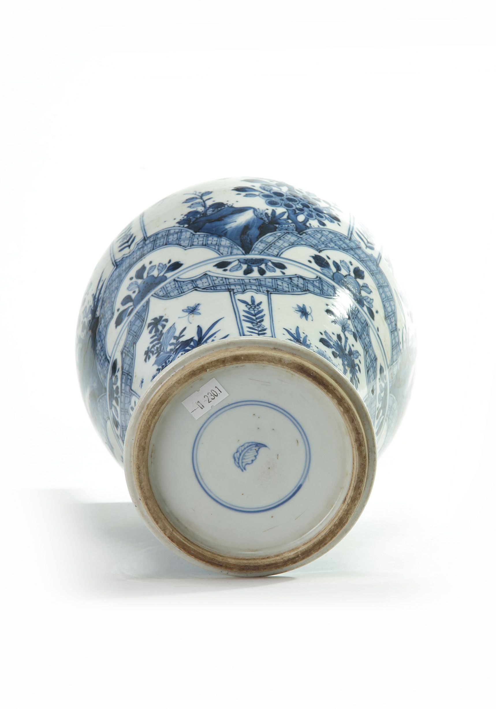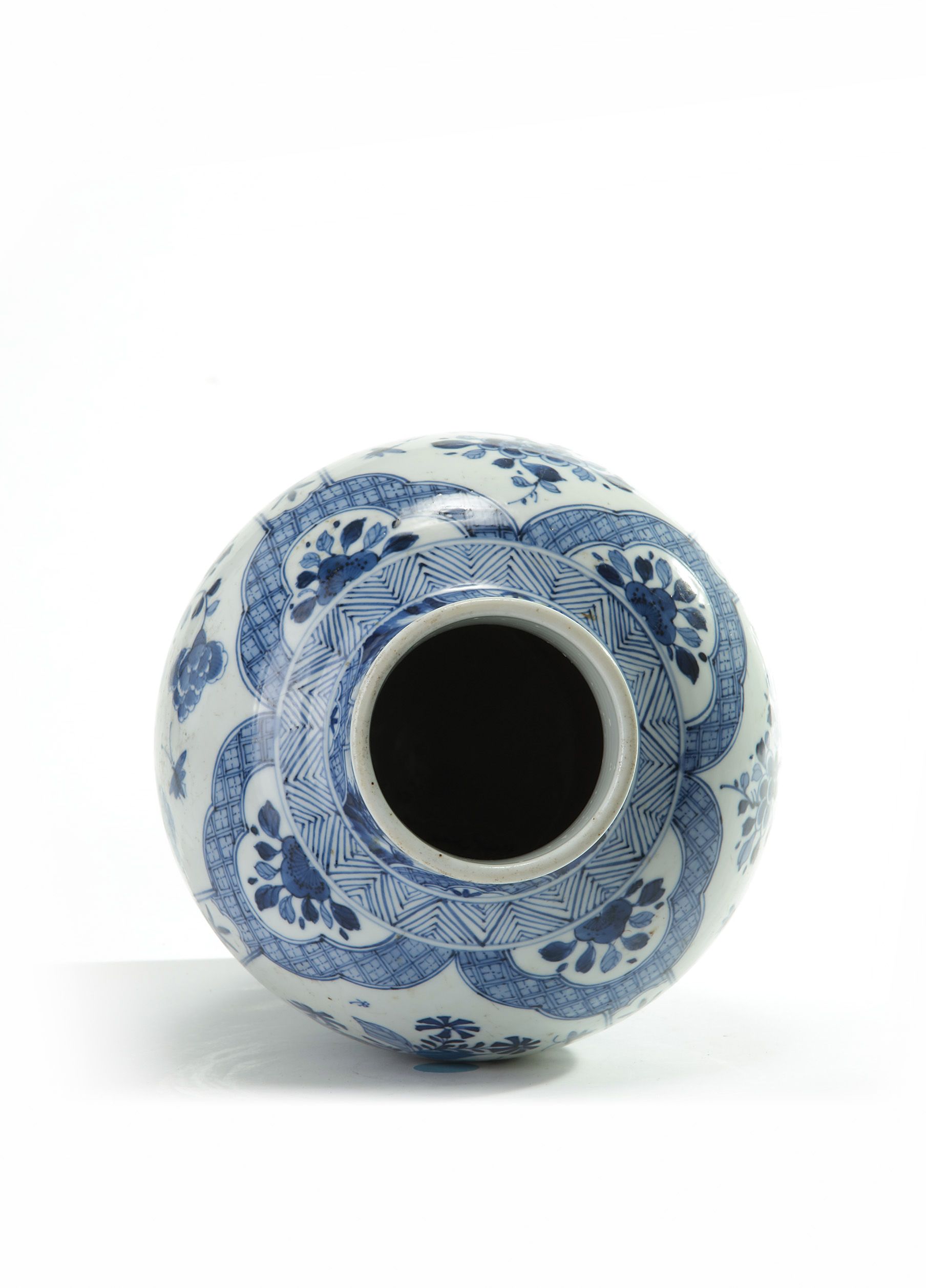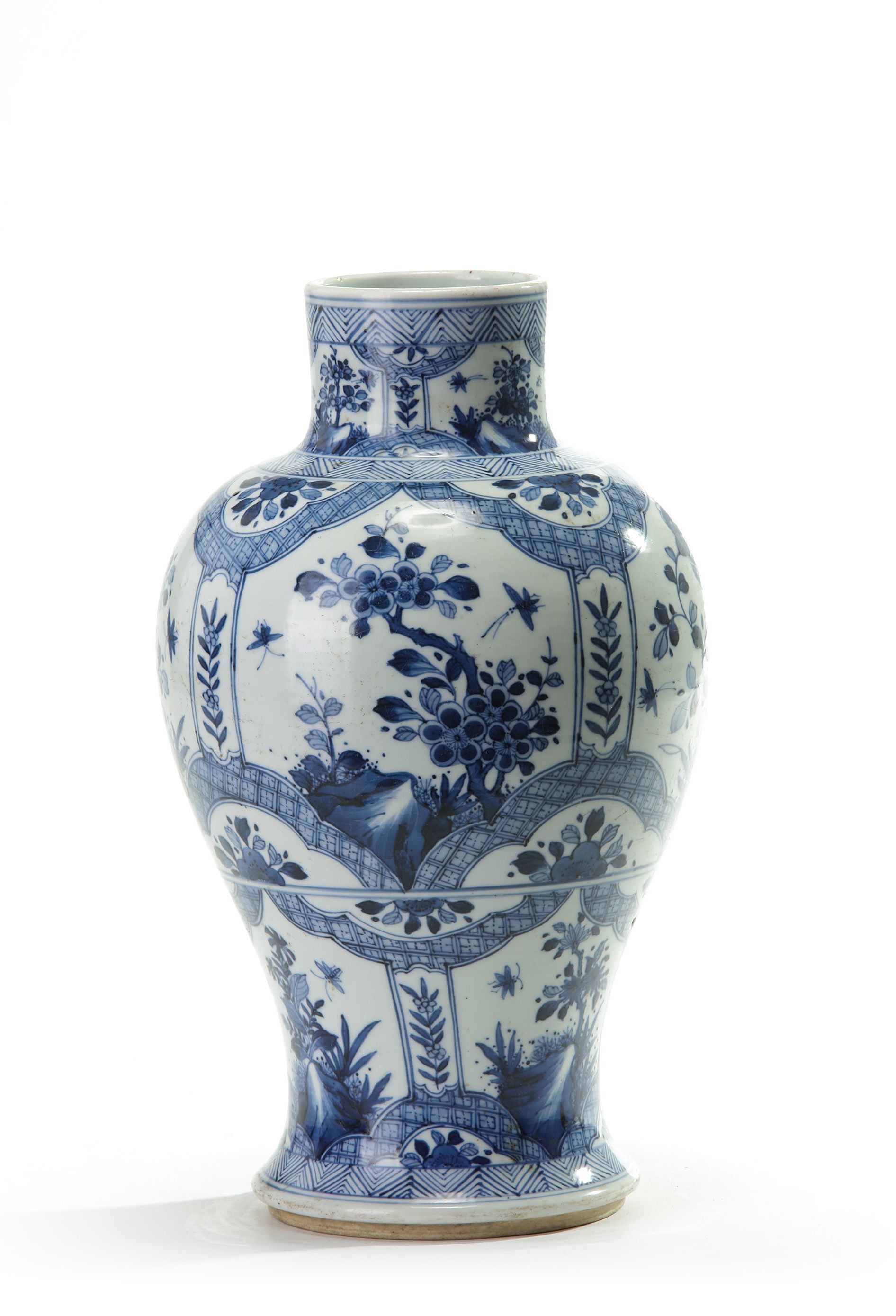 The baluster vase is decorated with panels enclosing butterflies flying above prunus and peony branches bearing blossoms and buds. The base is decorated with an artemisia leaf within a double circle.