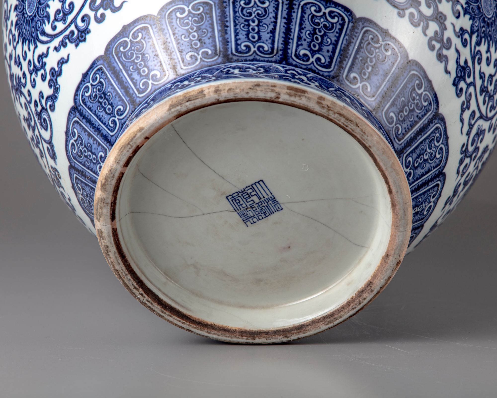 The large vase with a baluster body is stylised with Fu lions handles with rings, decorated with in the Ming style with 'heaped and piled' effect around the body with a broad band of foliate scroll bearing large blossoms below a band of The eight Buddhist emblems and a lappet border to the base. The bottom with Qianlong seal mark.
