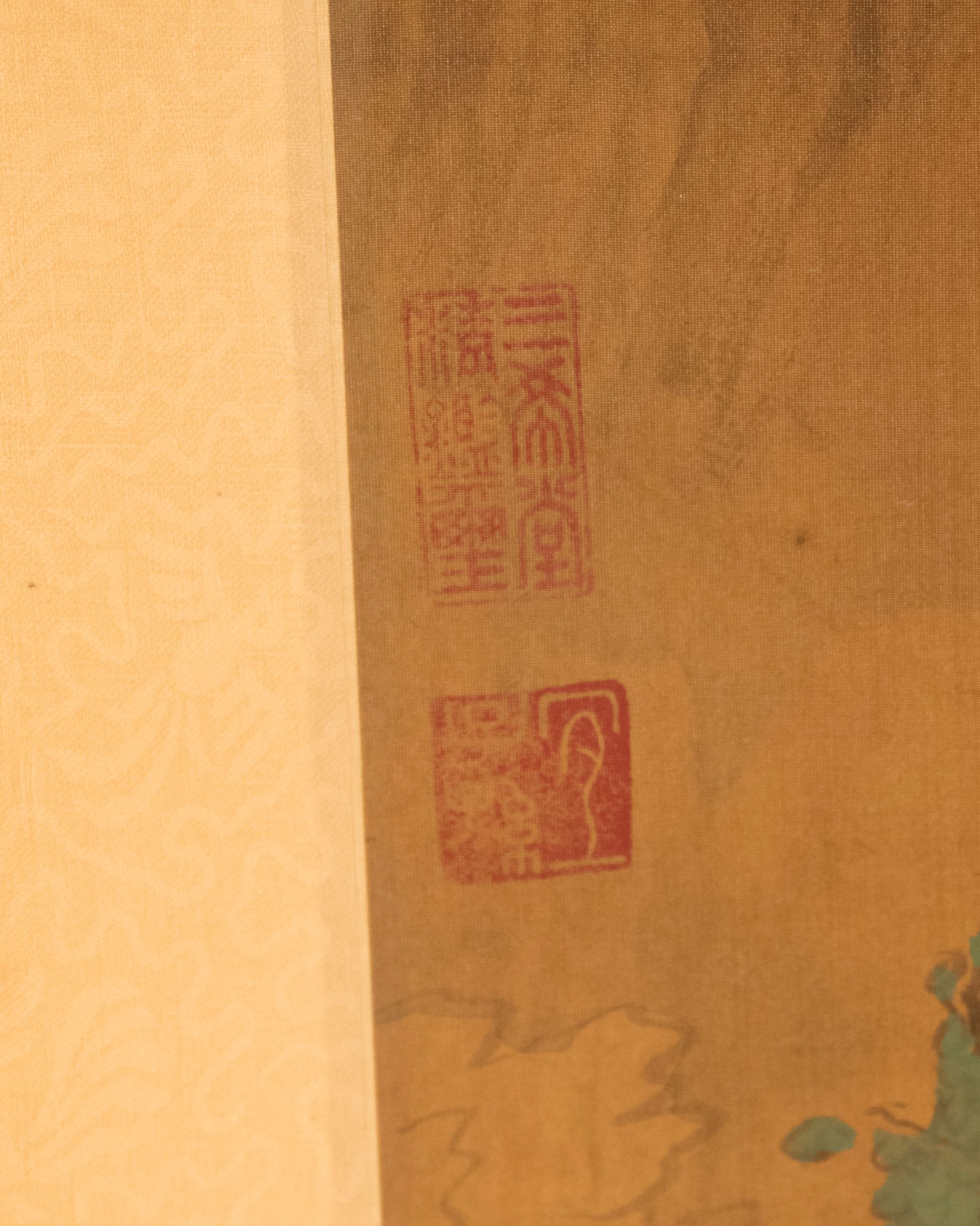 Ink and colour on silk. Hanging scroll. With apocryphal signature by artist. Size without mounting: 70.5 x 130 cm