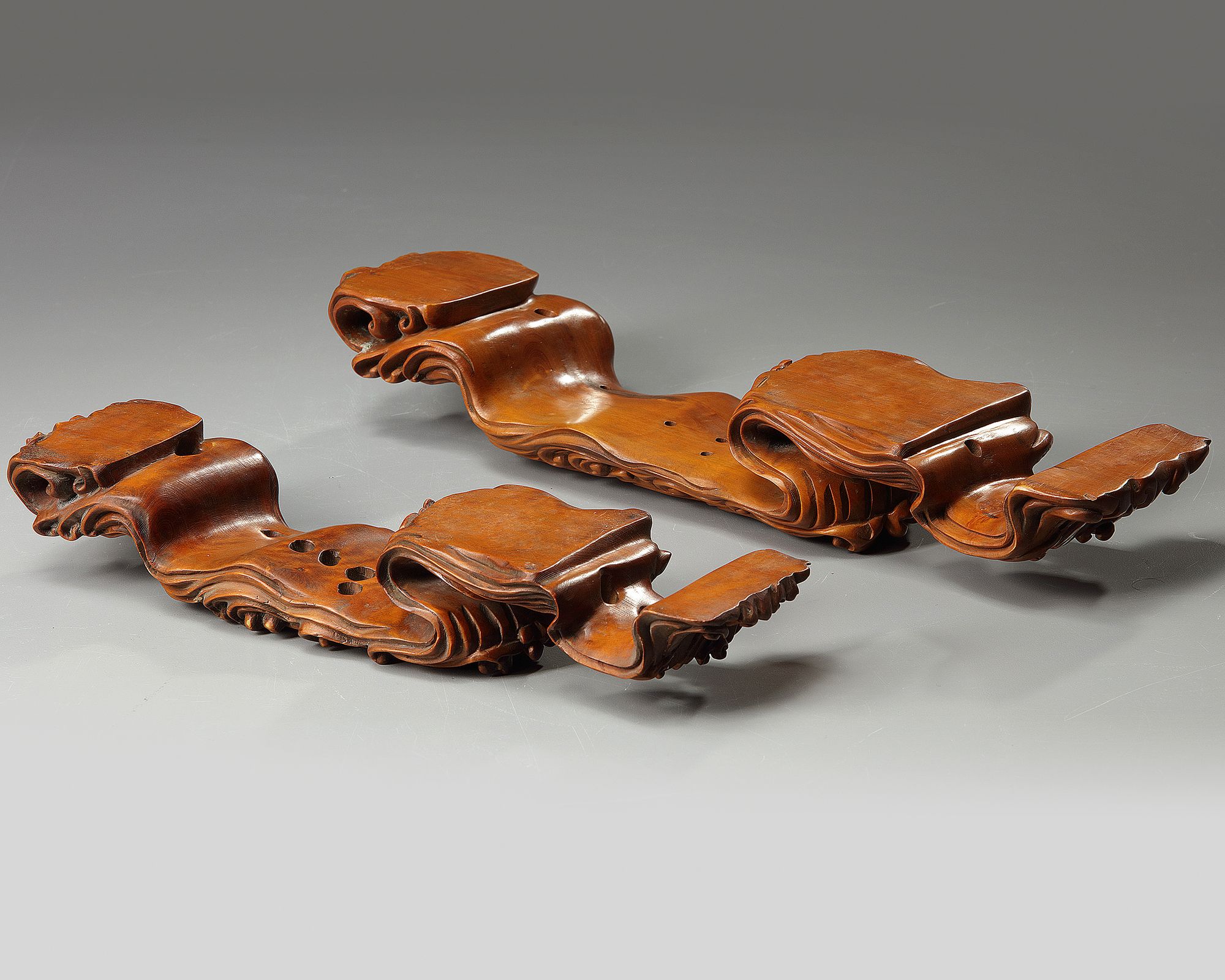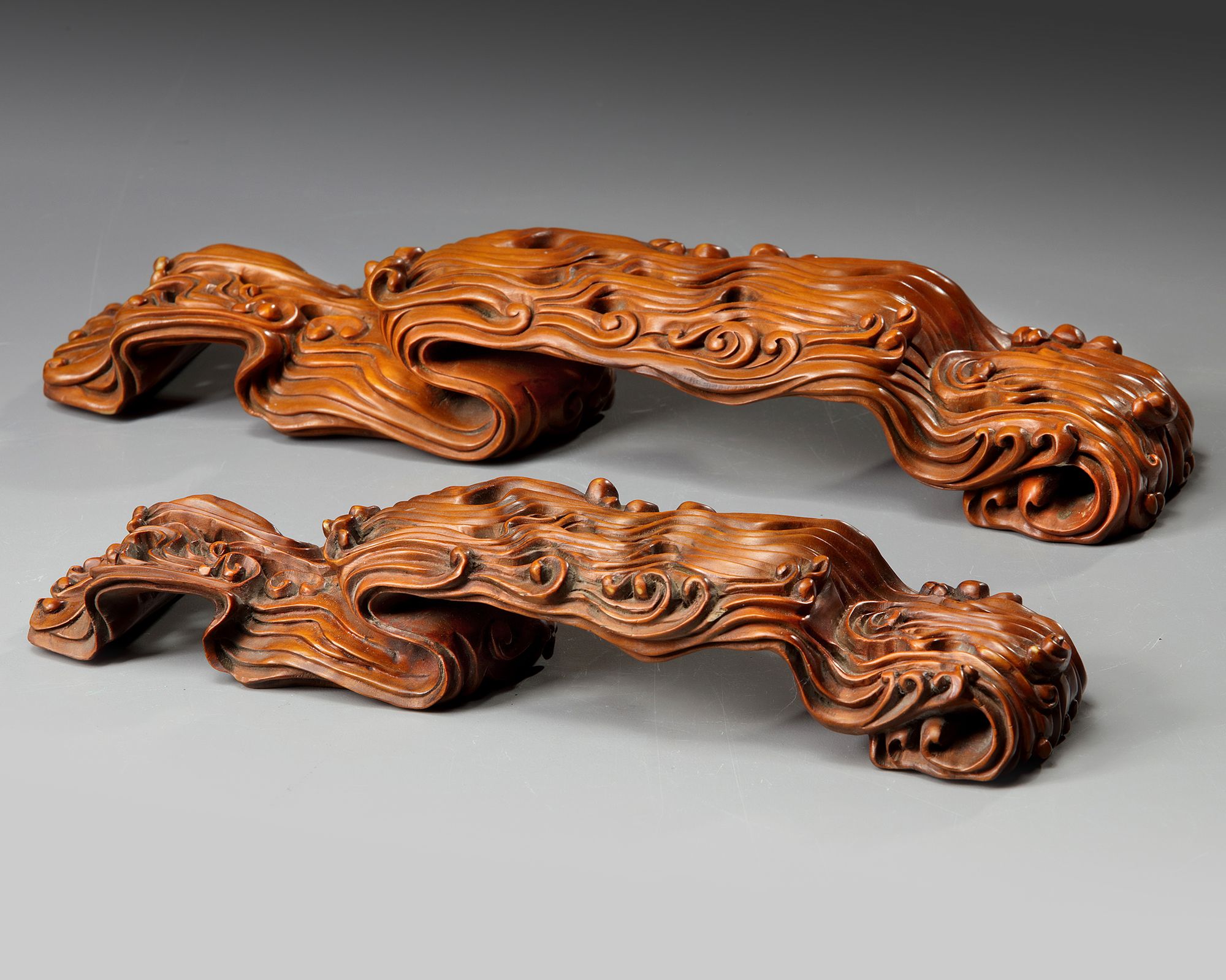 Each brush stand is similarly decorated and carved as an undulating surface, the surface is carved and pierced as gently scrolling waves.