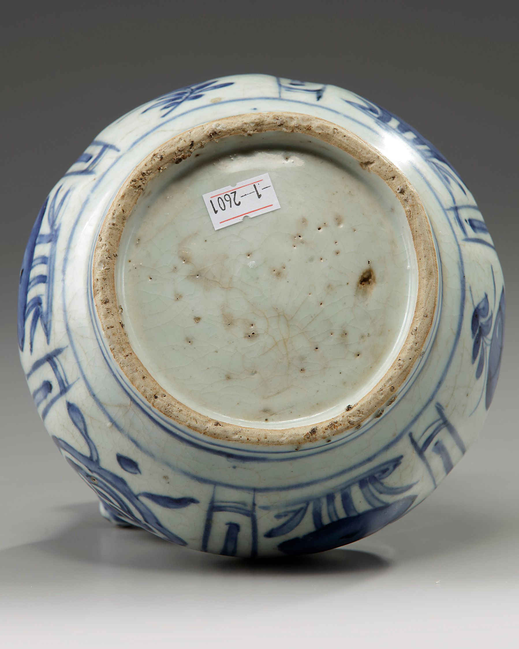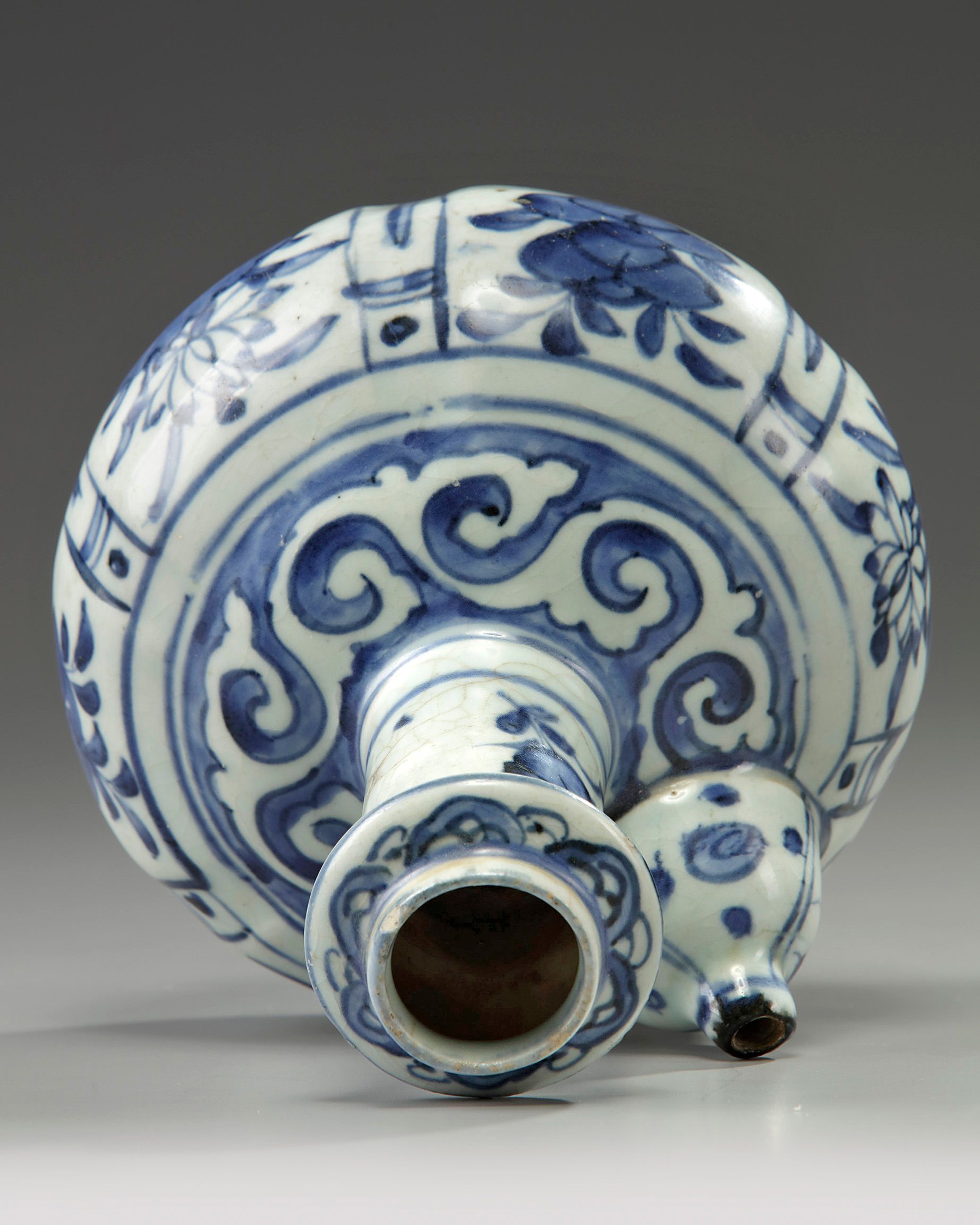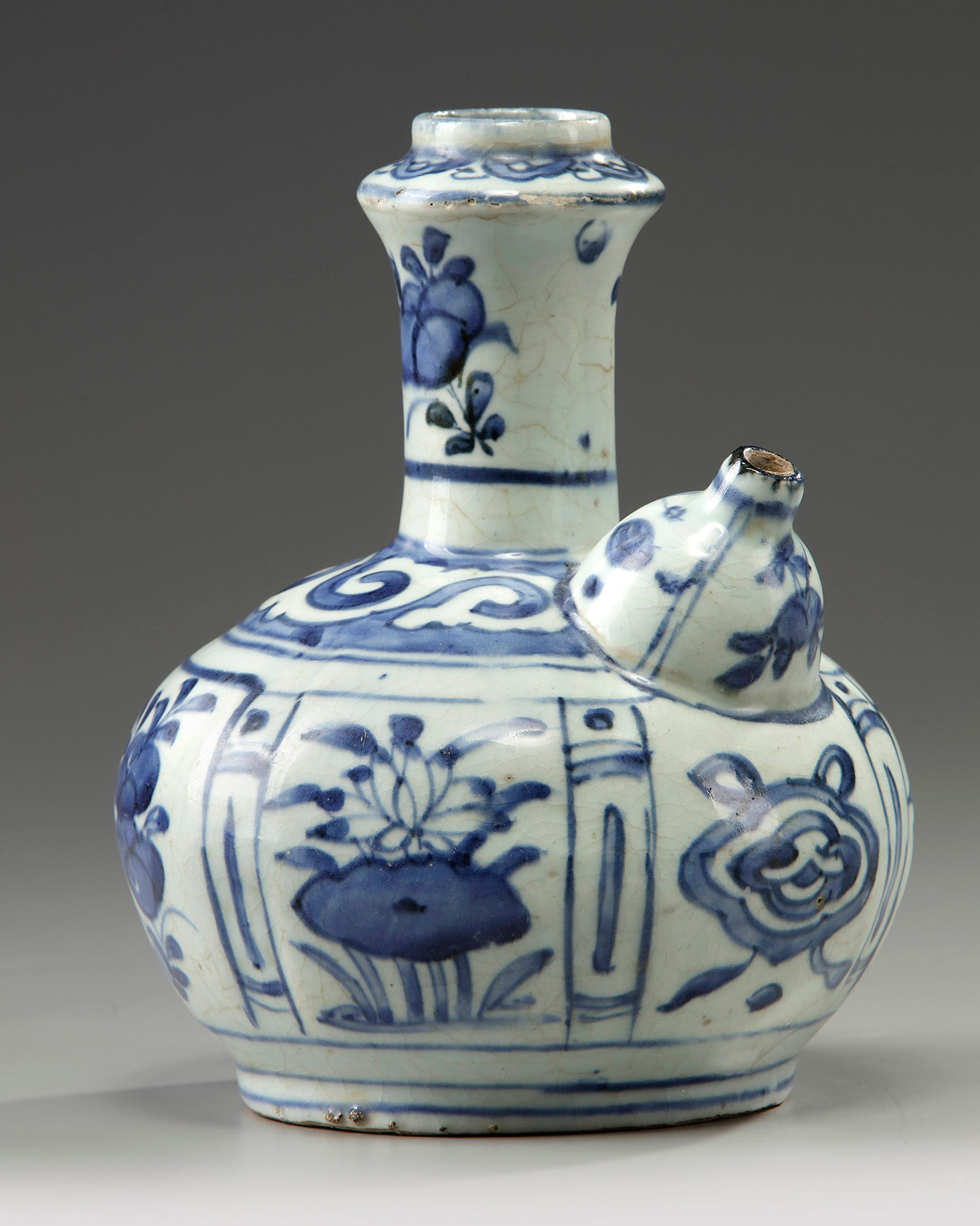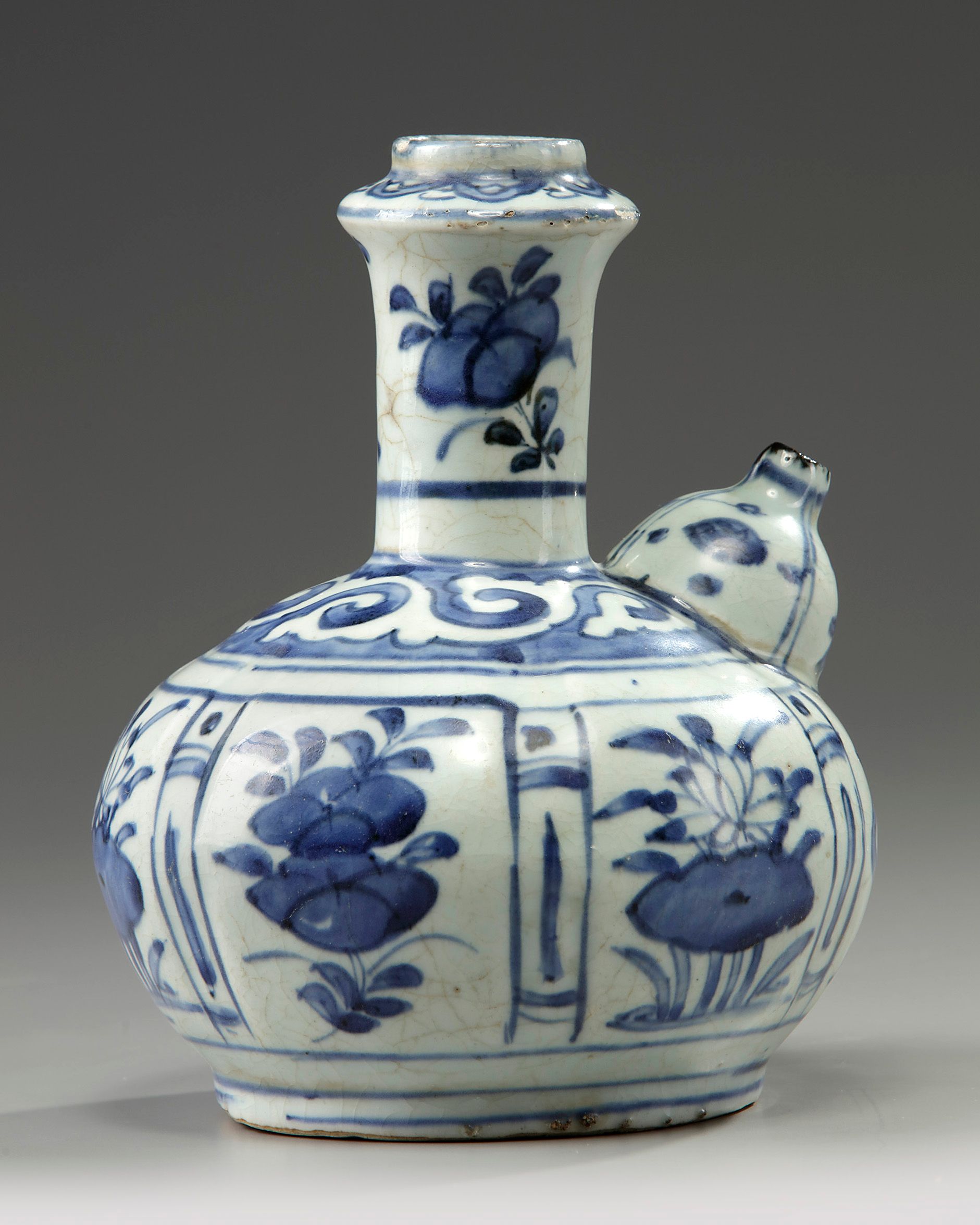 The kendi is decorated to the body with alternating moulded panels enclosing flowers, flowering branches and a ruyi-head. The shoulder is decorated with a scroll band below flower sprays to the neck.