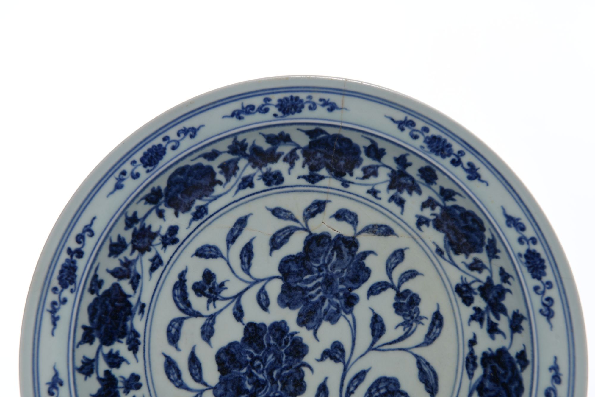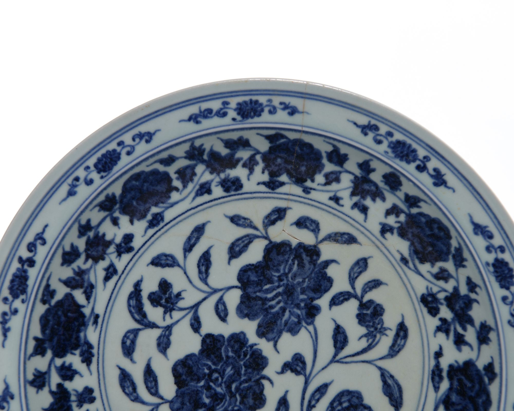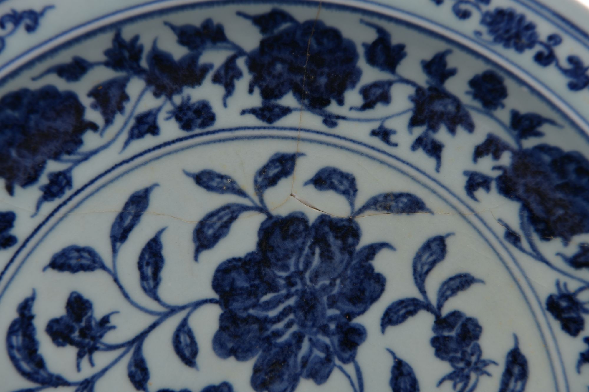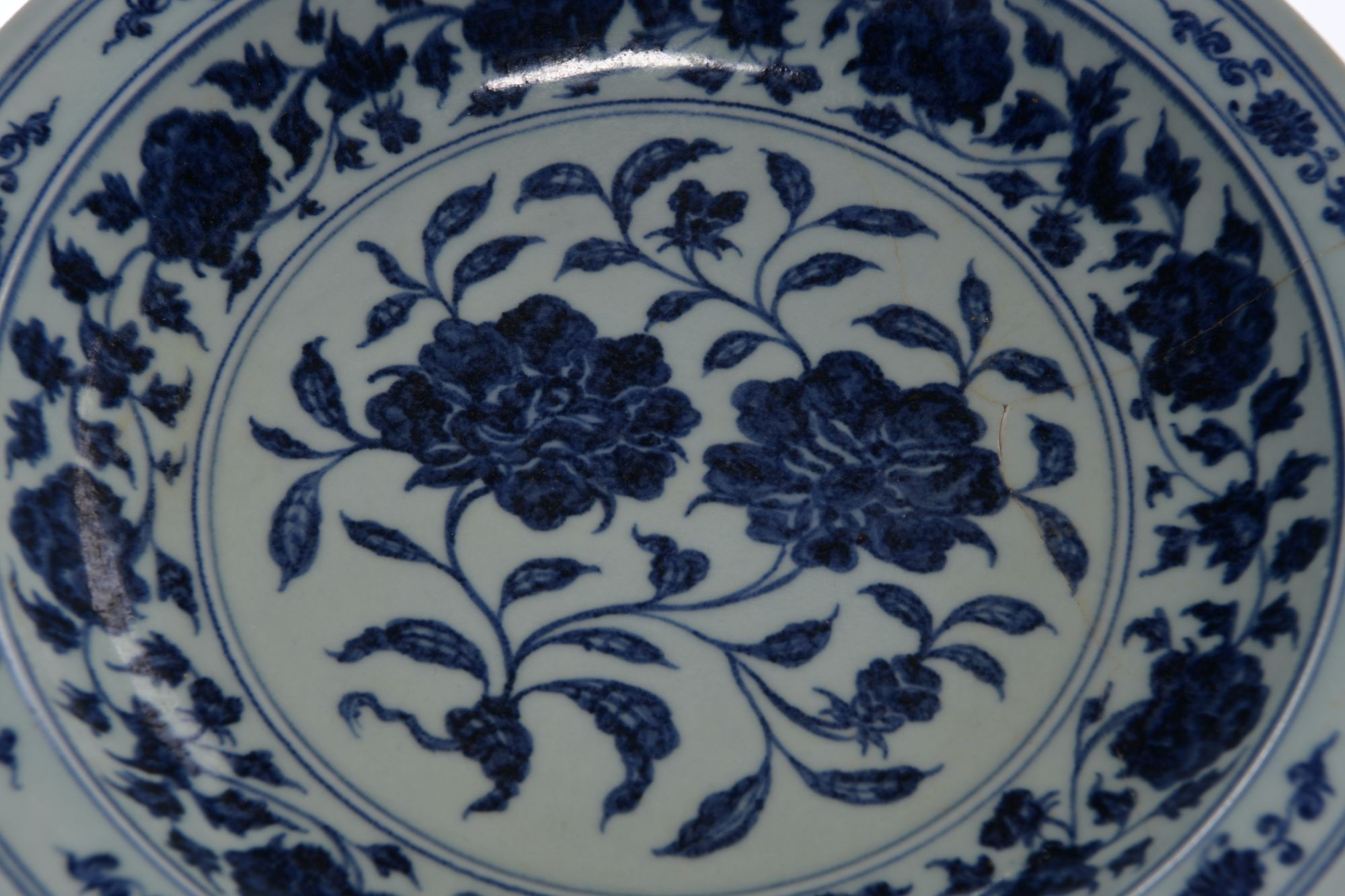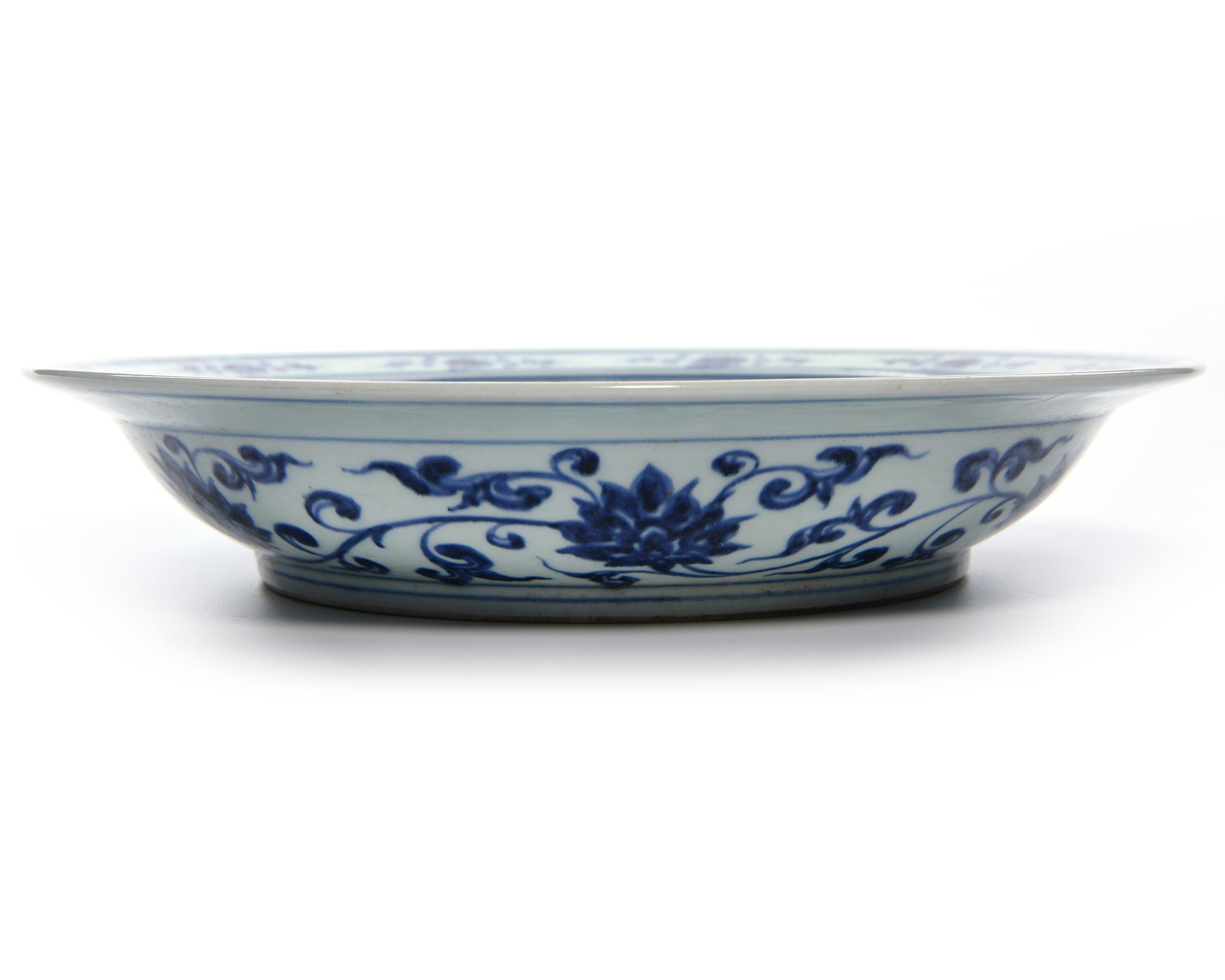 The interior is well-painted with two large chrysanthemum flower sprays, encircled by a band of composite foliate scroll in the rounded cavetto, the meandering leafy stem bearing nine flowers and buds. The everted rim is decorated with a small flower sprays, and the exterior with a further band of composite foliate scroll. 7 cm. height, 35 cm. diam